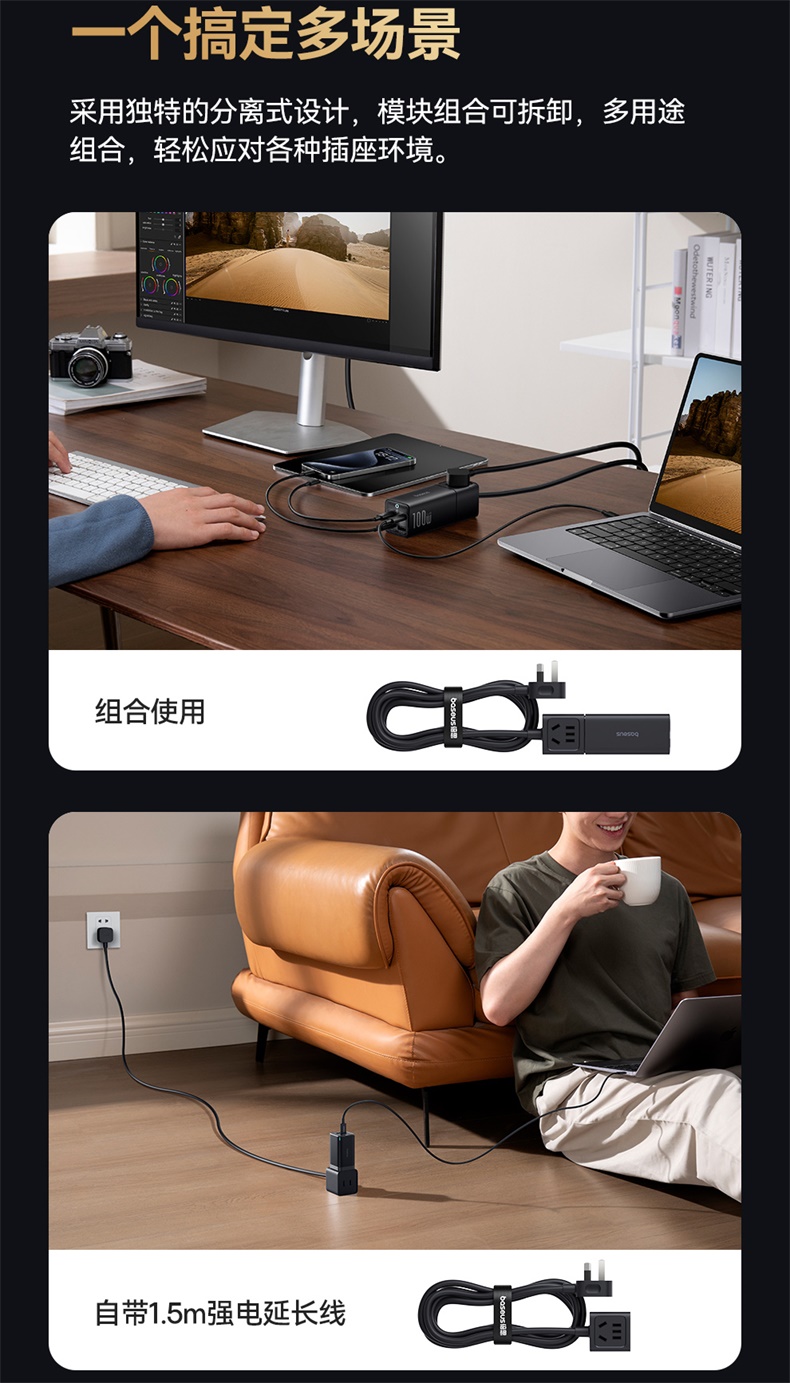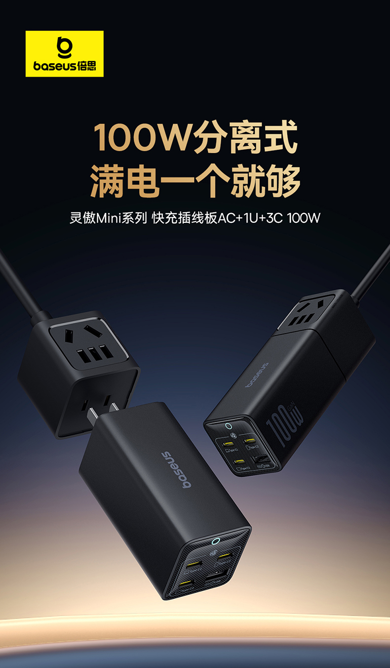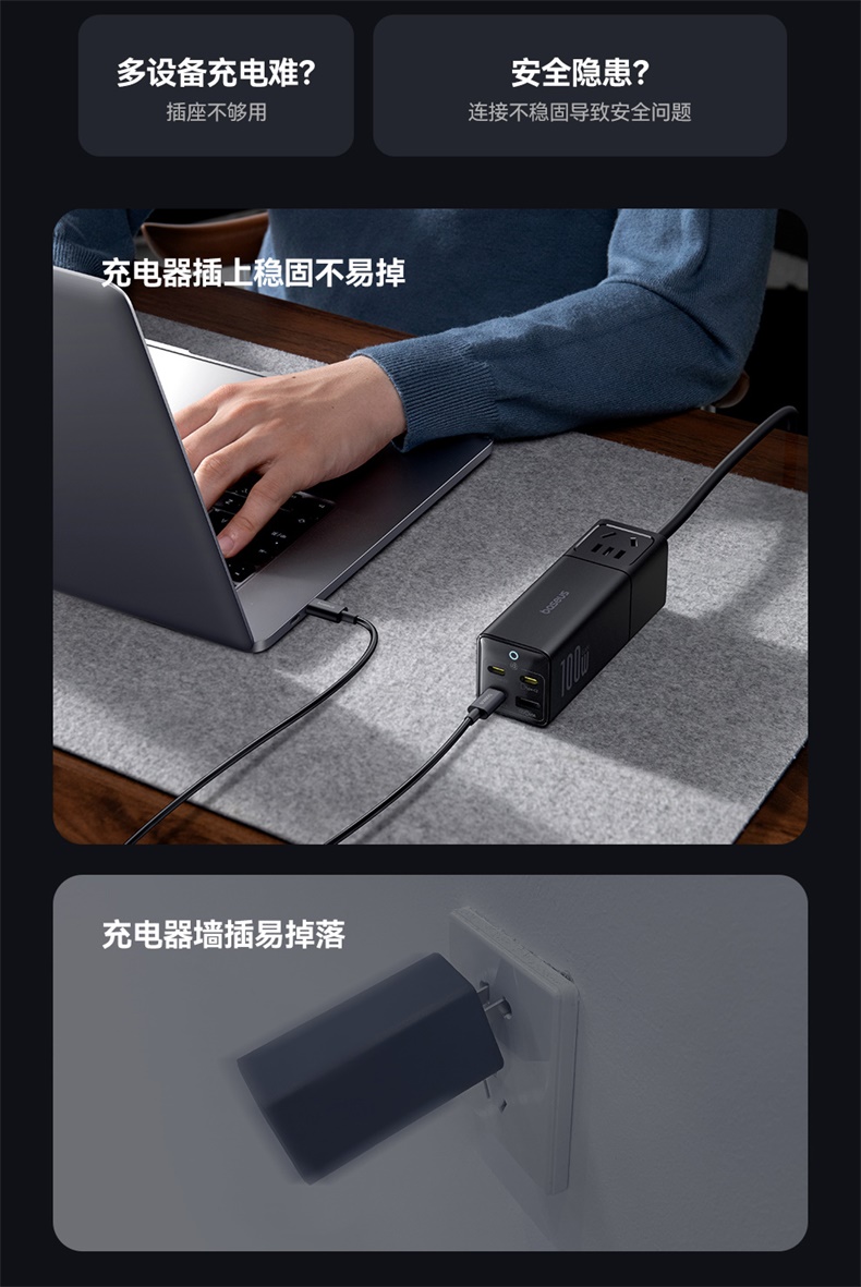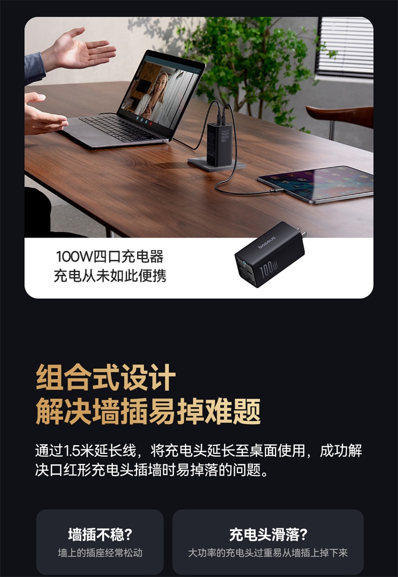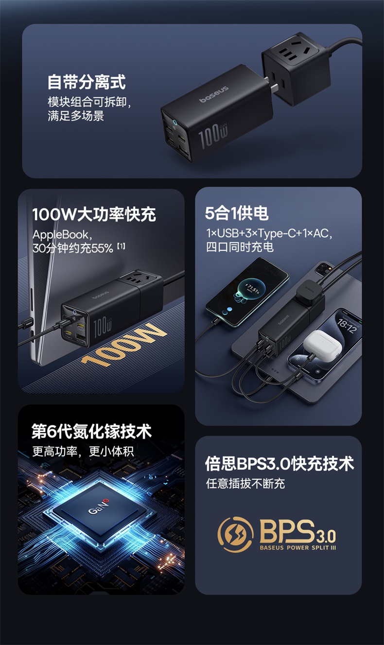 倍思桌面多功能usb充电插座100W氮化镓插线板分离式PD快充头适用苹果iPhone15Pro华为手机macbook笔记本电脑