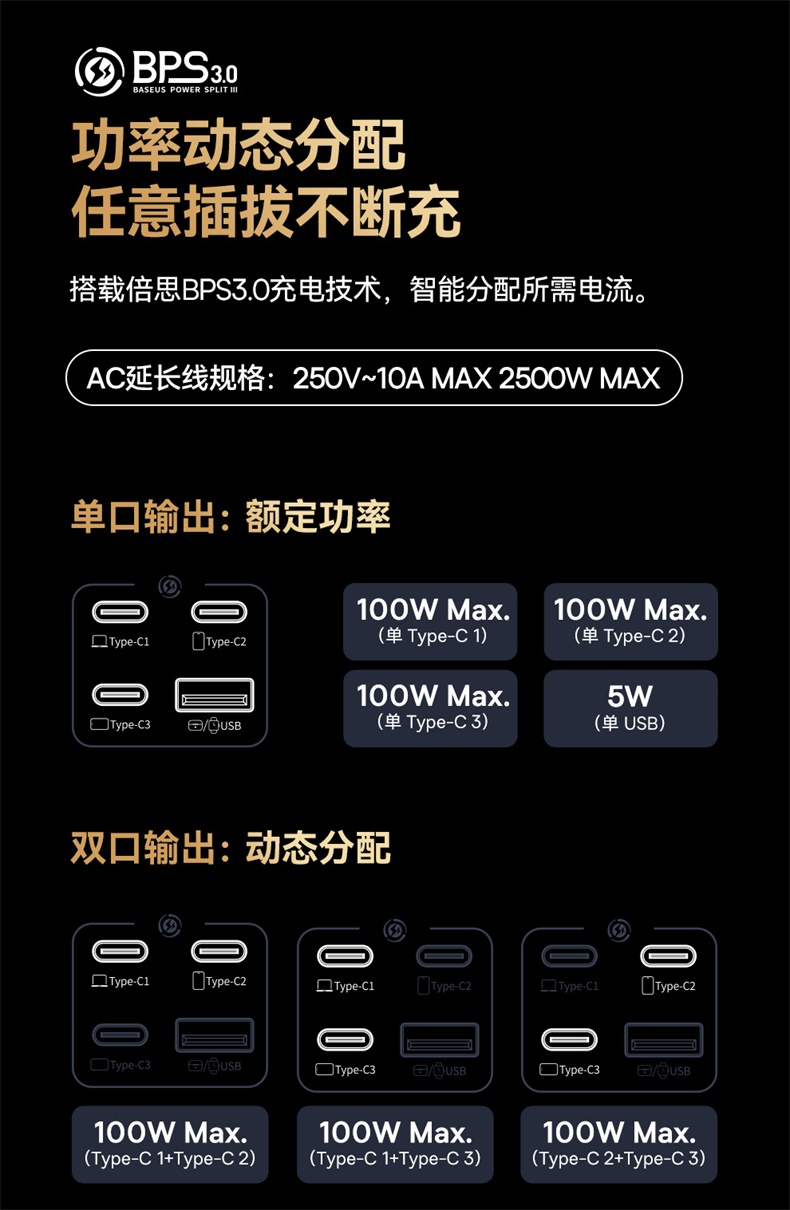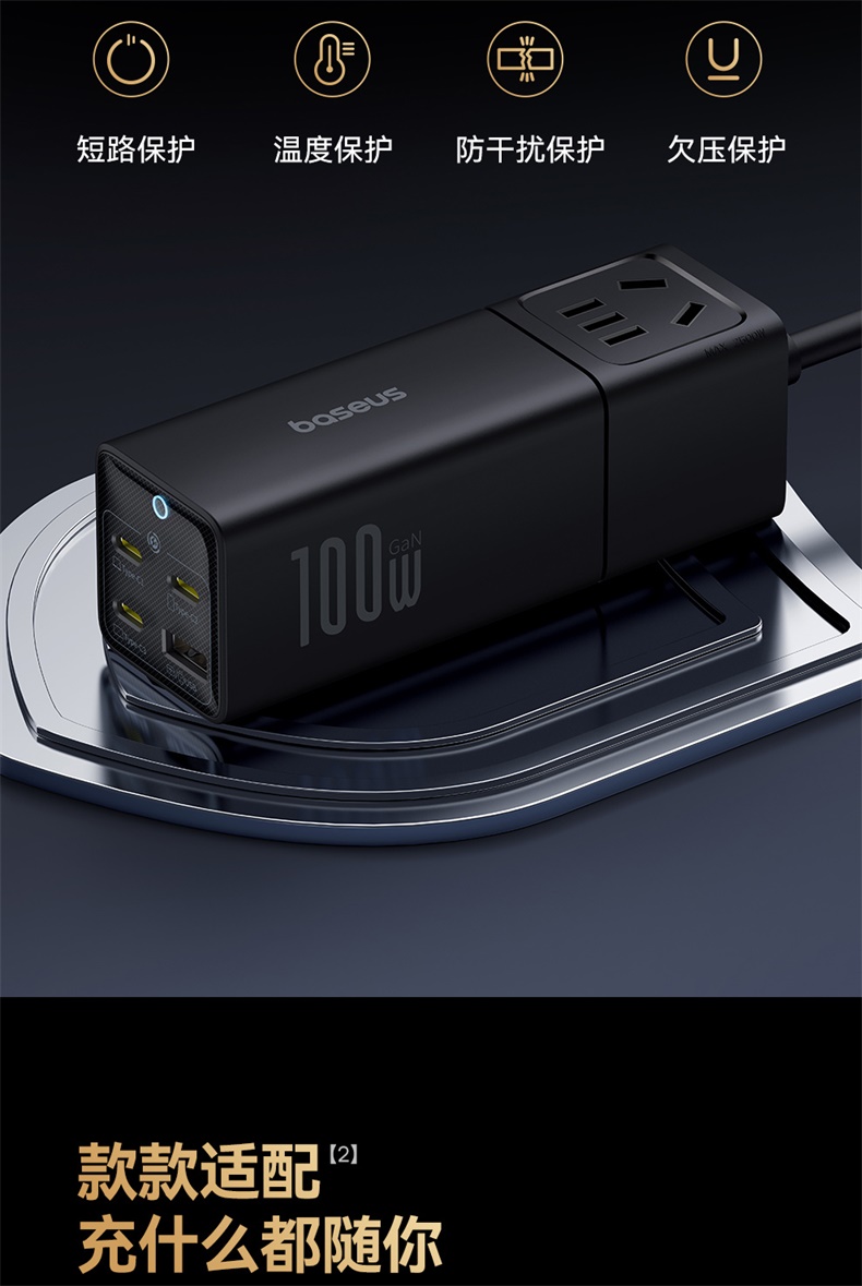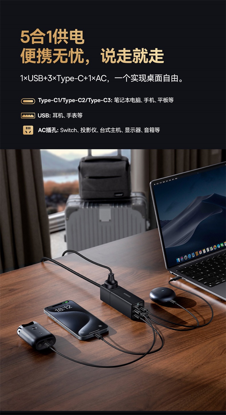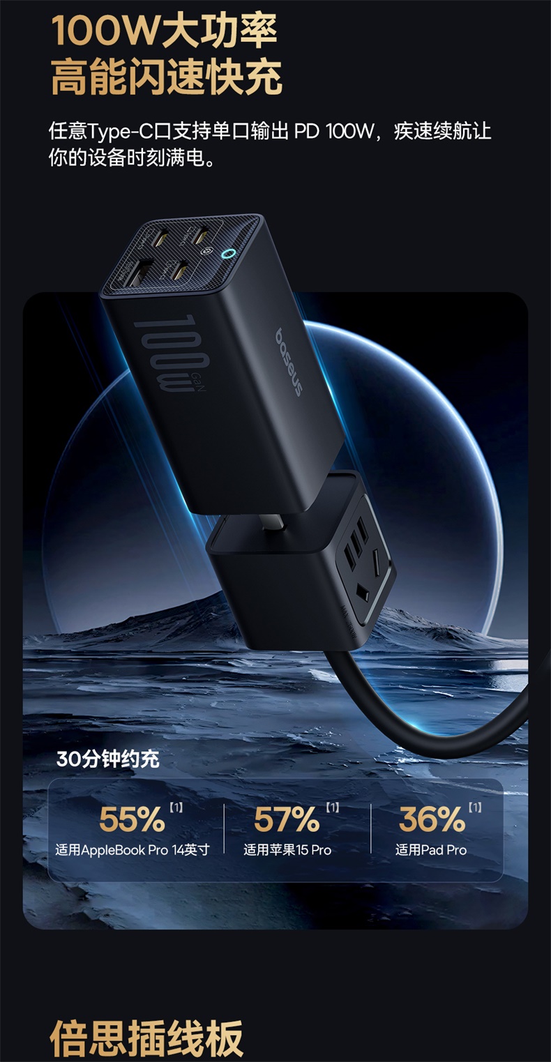 倍思桌面多功能usb充电插座100W氮化镓插线板分离式PD快充头适用苹果iPhone15Pro华为手机macbook笔记本电脑