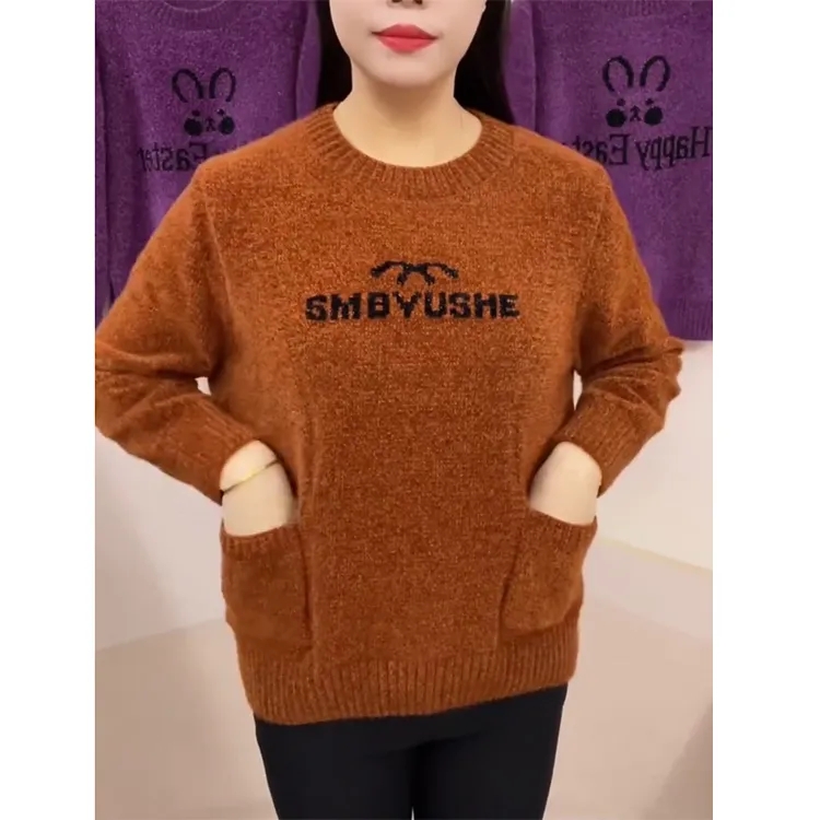 秋冬新款雪尼尔毛衣女字母保暖上衣圆领宽松加厚中老年妈妈打底衫