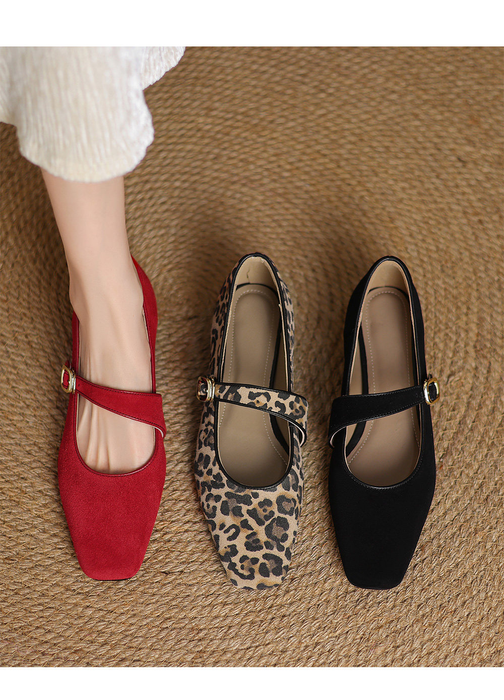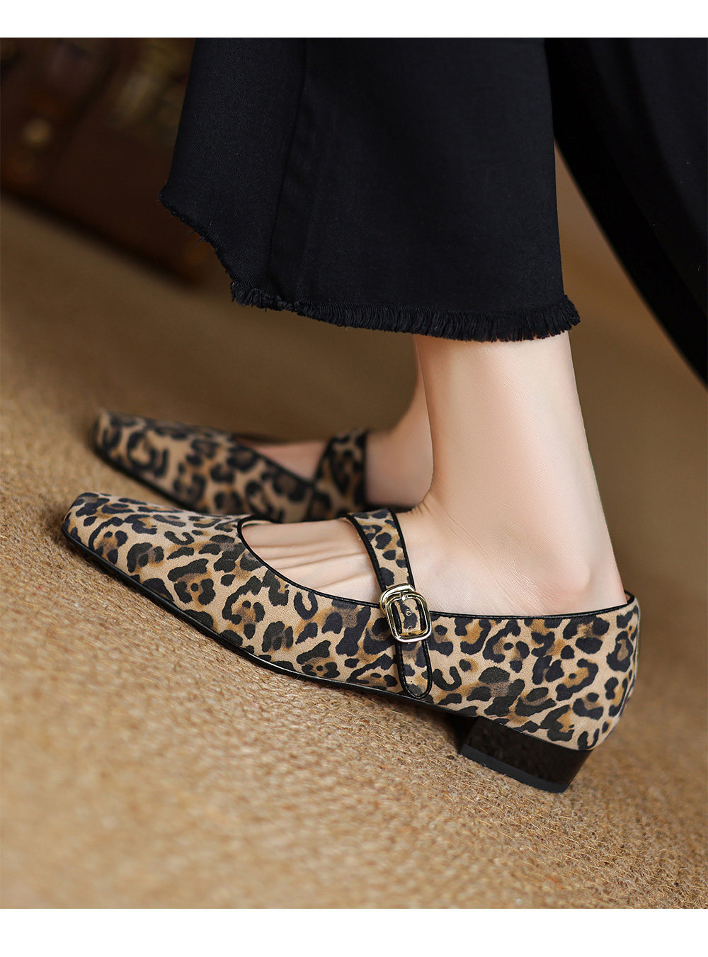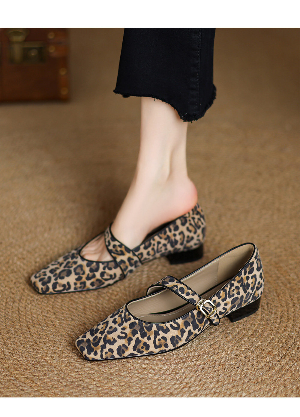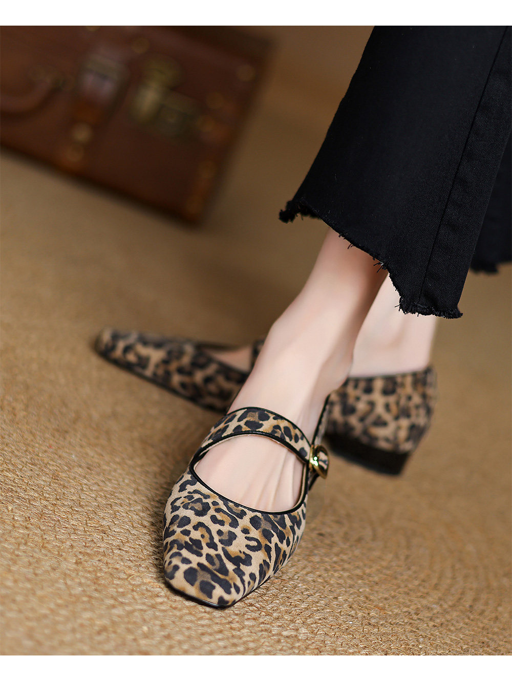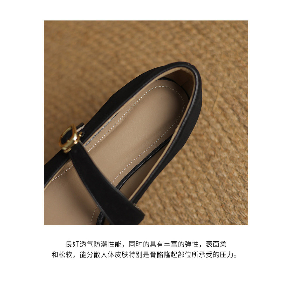 Kmeizu软~方头玛丽珍鞋女春新款简约磨砂豹纹平底赫本一字扣单鞋