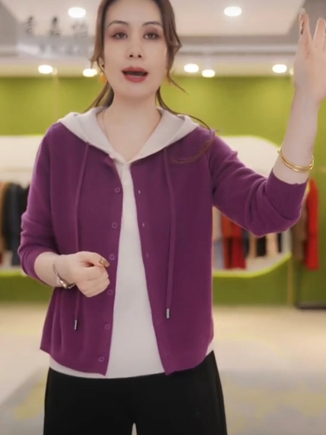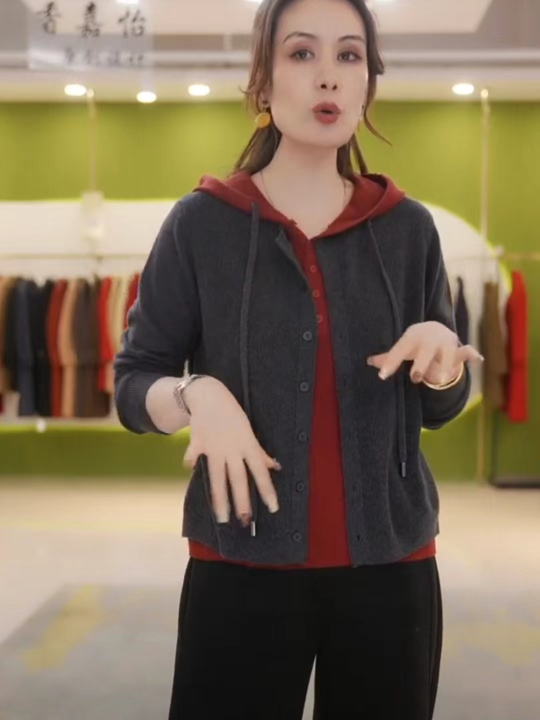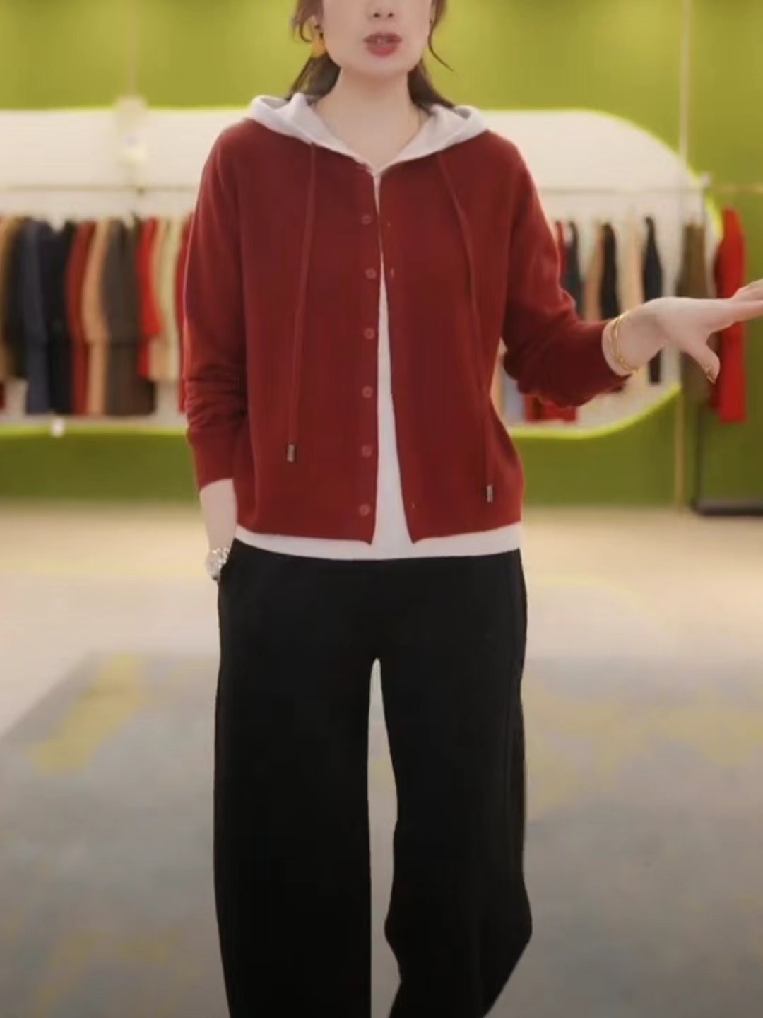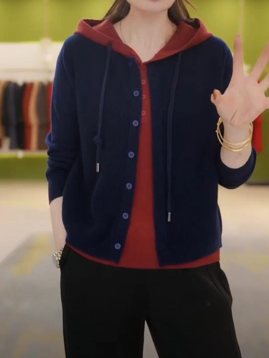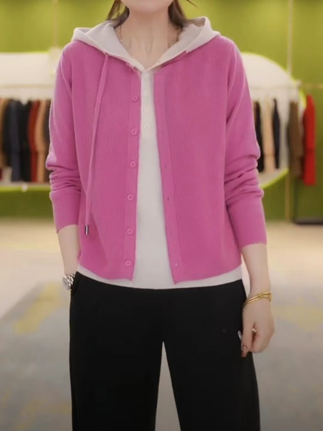 春秋新款毛衣外套宽松减龄气质毛衫三桔假两件连帽针织开衫女上衣