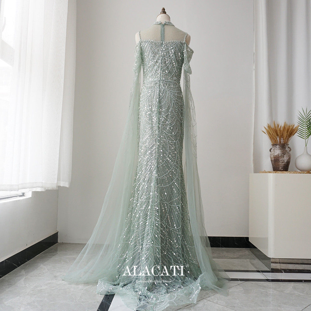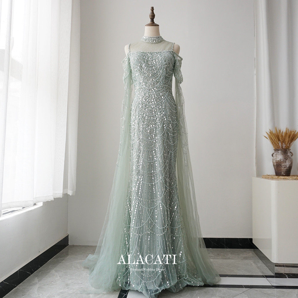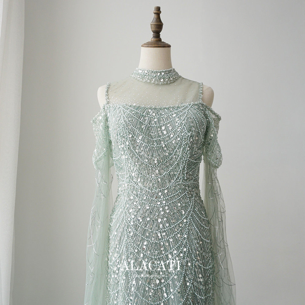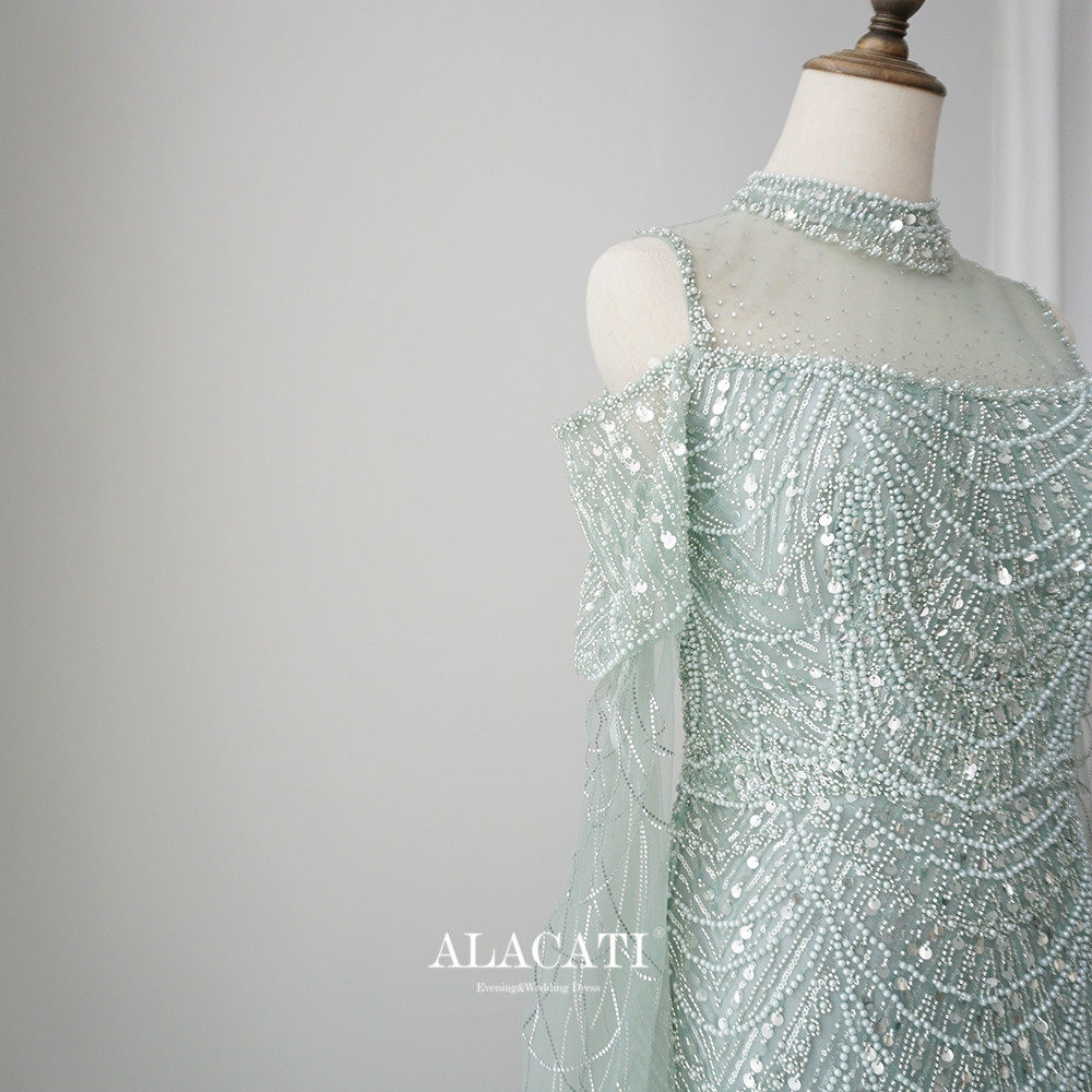 高端奢华重工水袖高腰显瘦鱼尾立领晚礼服年会名媛晚宴演出口中东