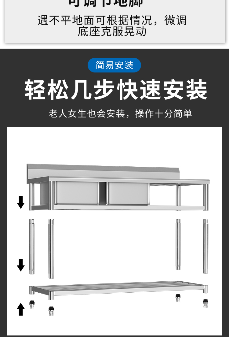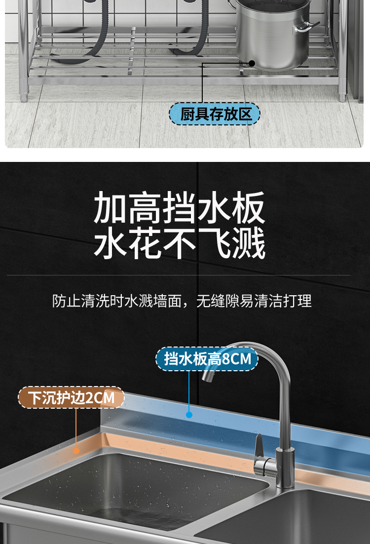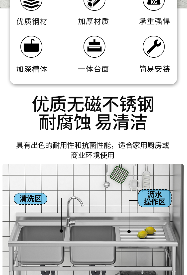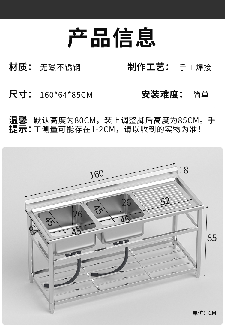 商用不锈钢水槽洗菜盆单槽带支架洗碗池双槽厨房台面一体洗手盆