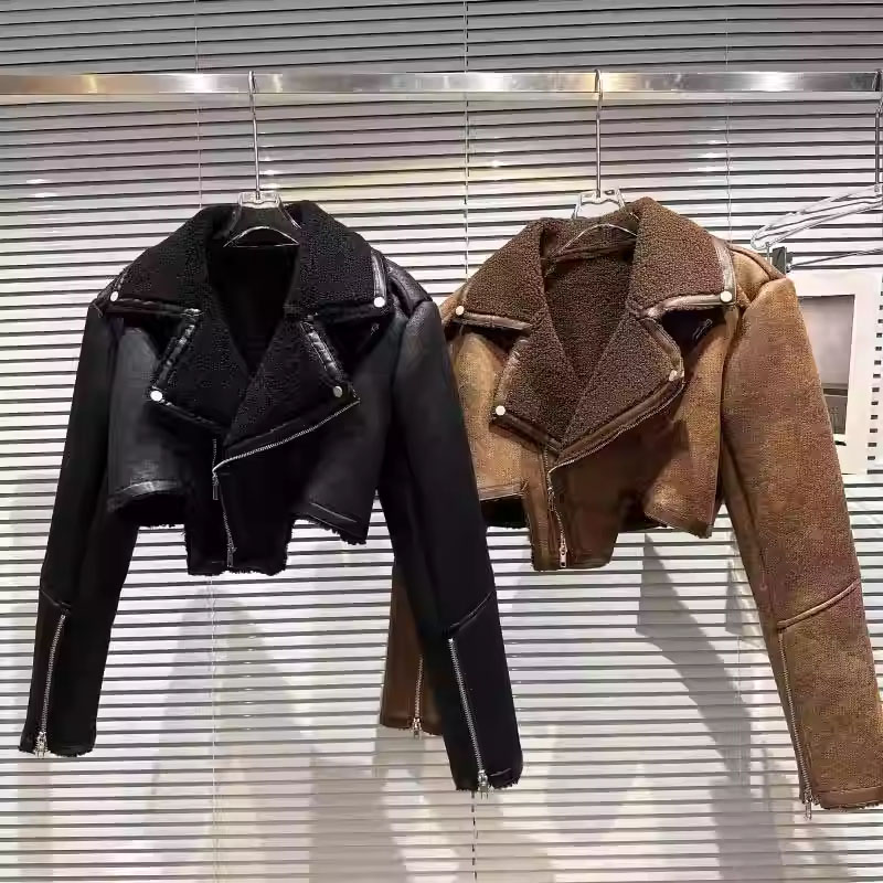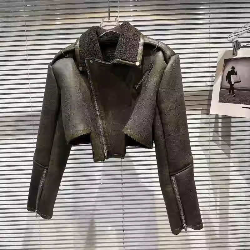 网红同款2025春季新款炸街款机车拉链翻毛皮皮毛一体皮衣夹克外套