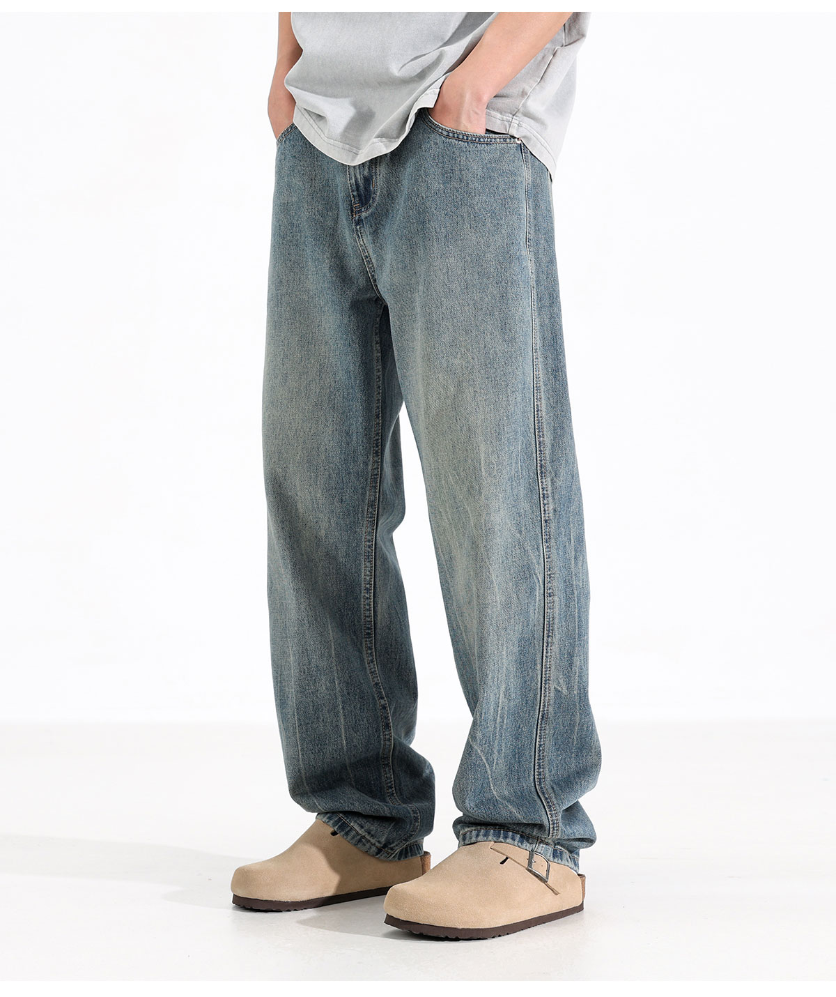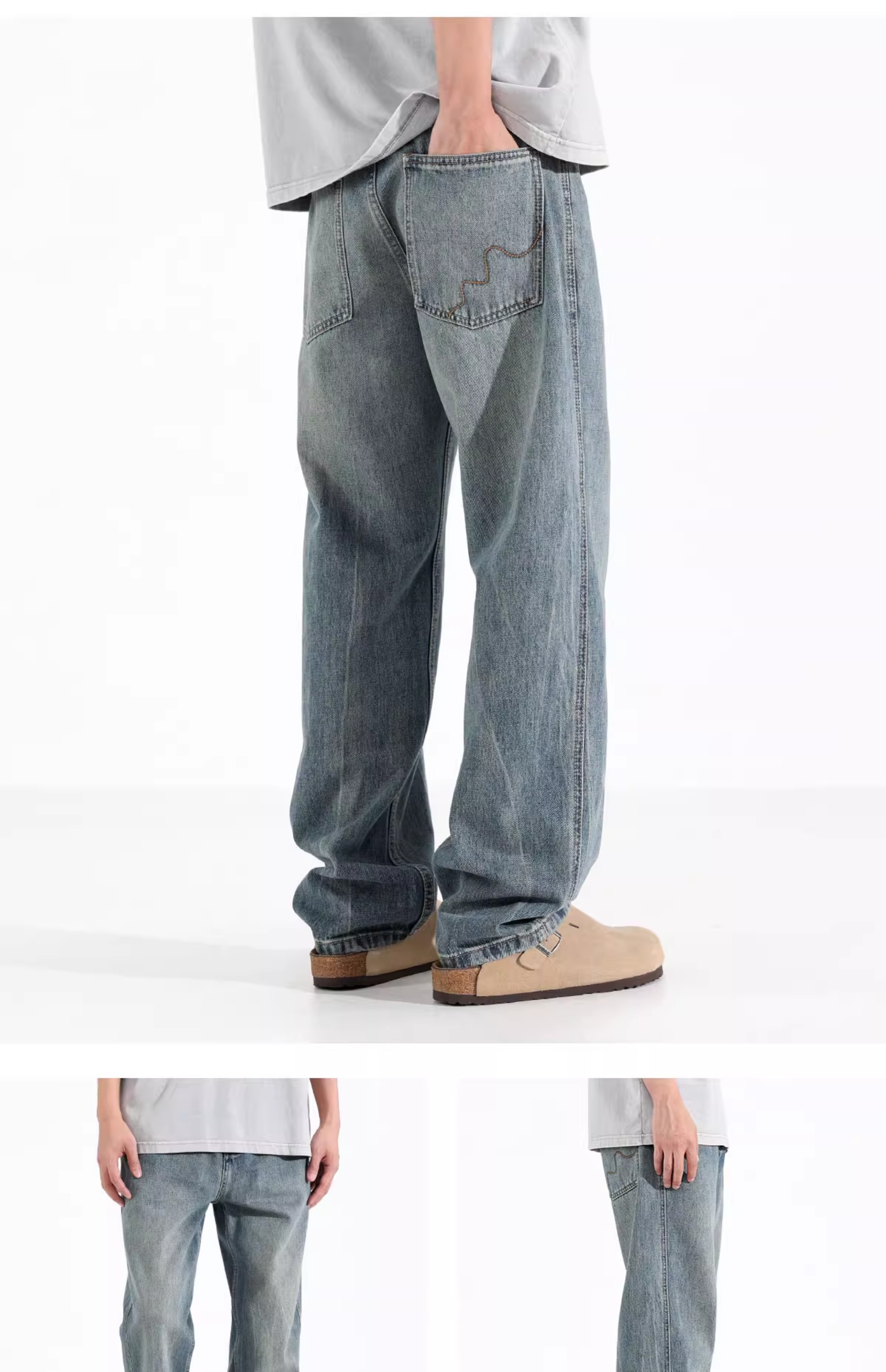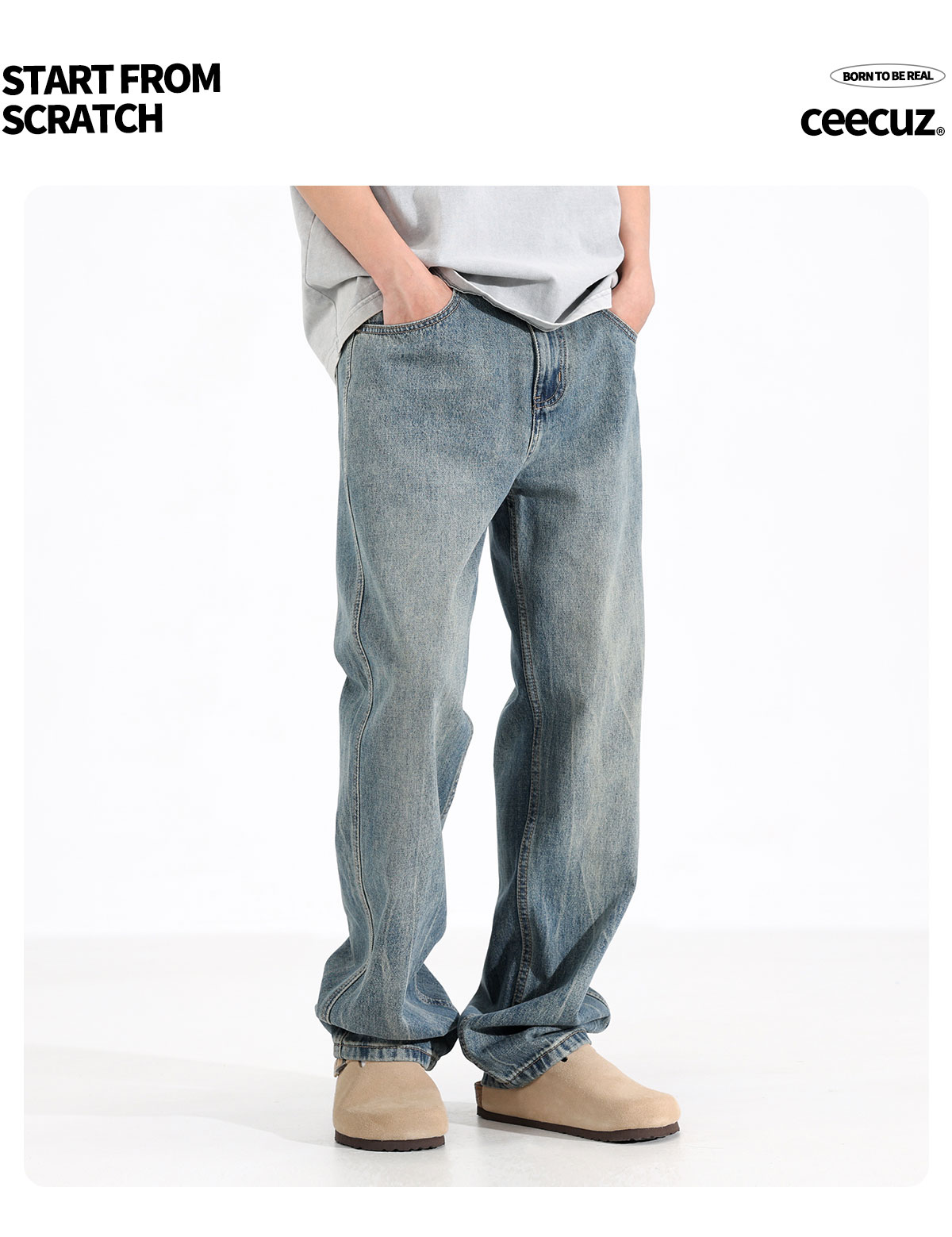 Ceecuz水洗直筒牛仔裤男美式cleanfit春季浅色拖地阔腿休闲长裤子