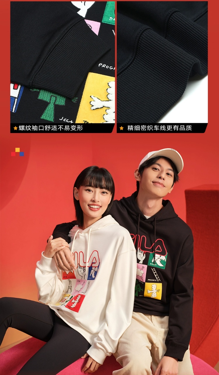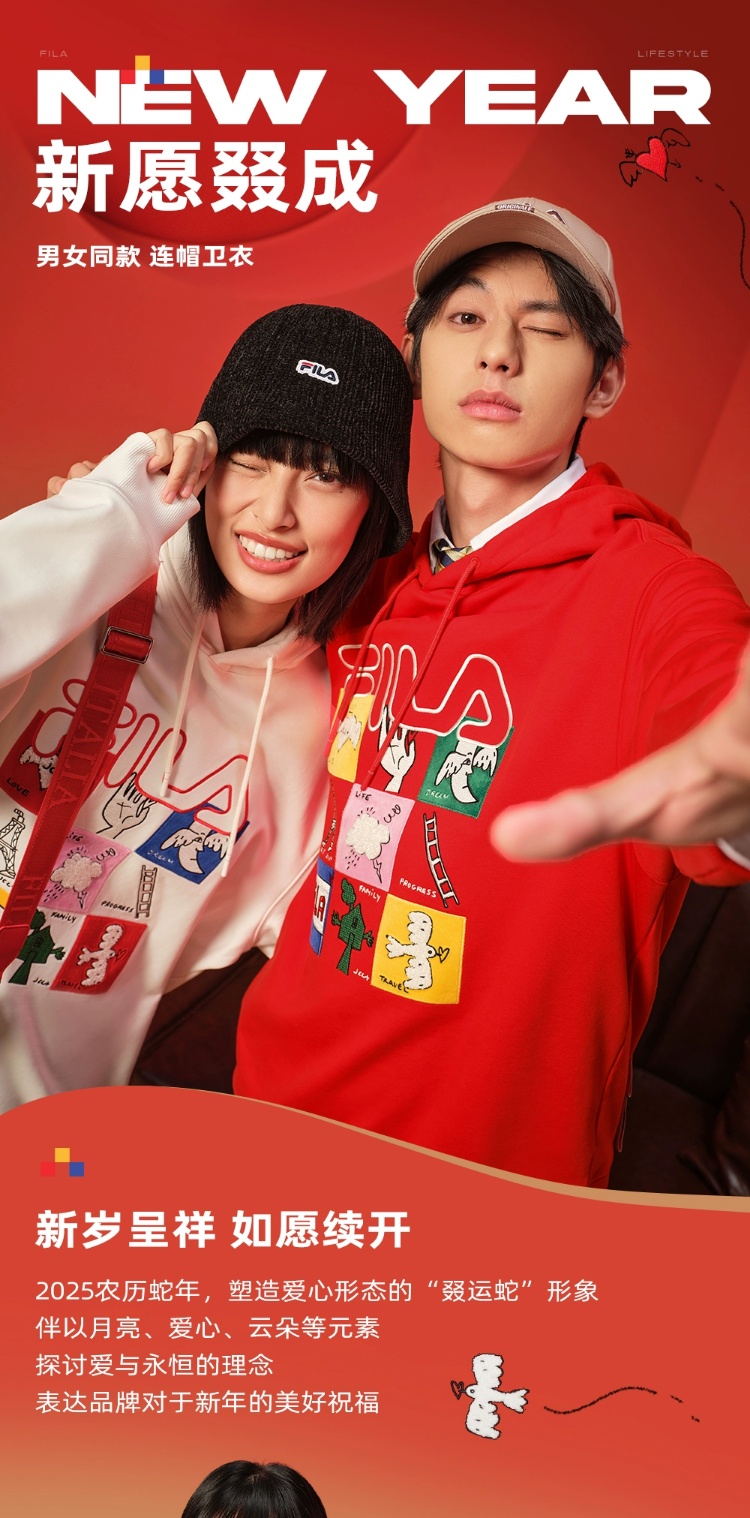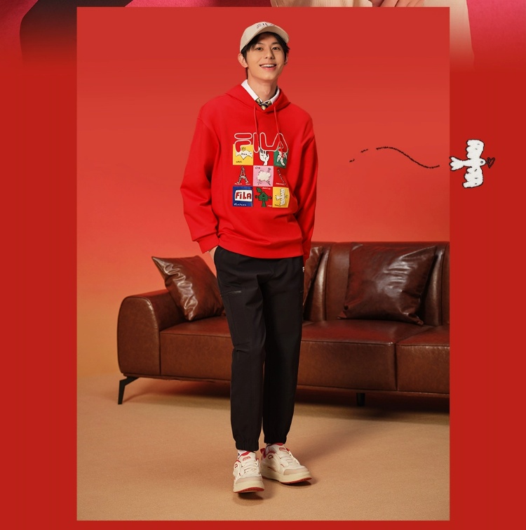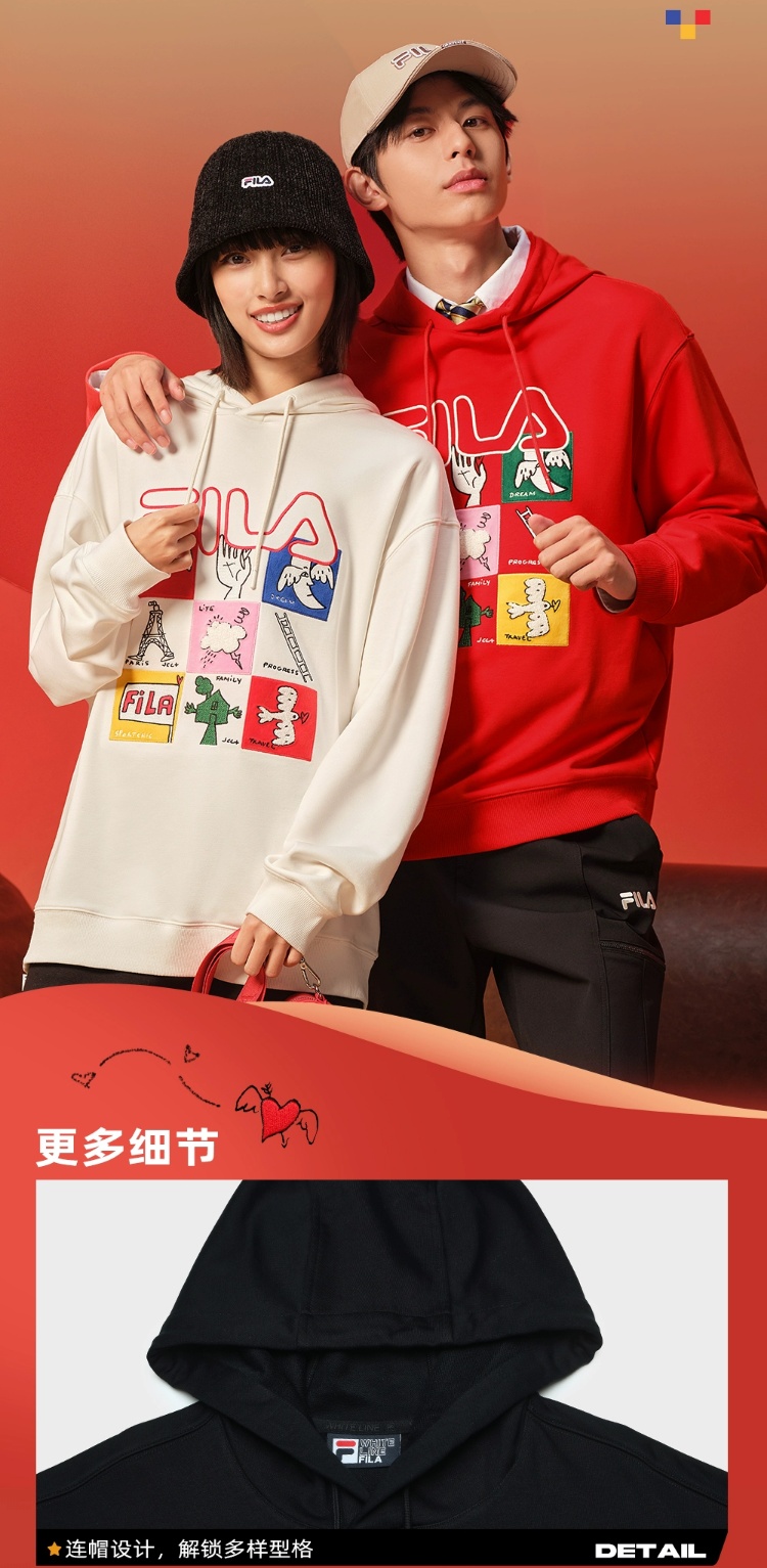 FILA 叕运蛇斐乐情侣连帽新年红色氧气卫衣男女连帽卫衣