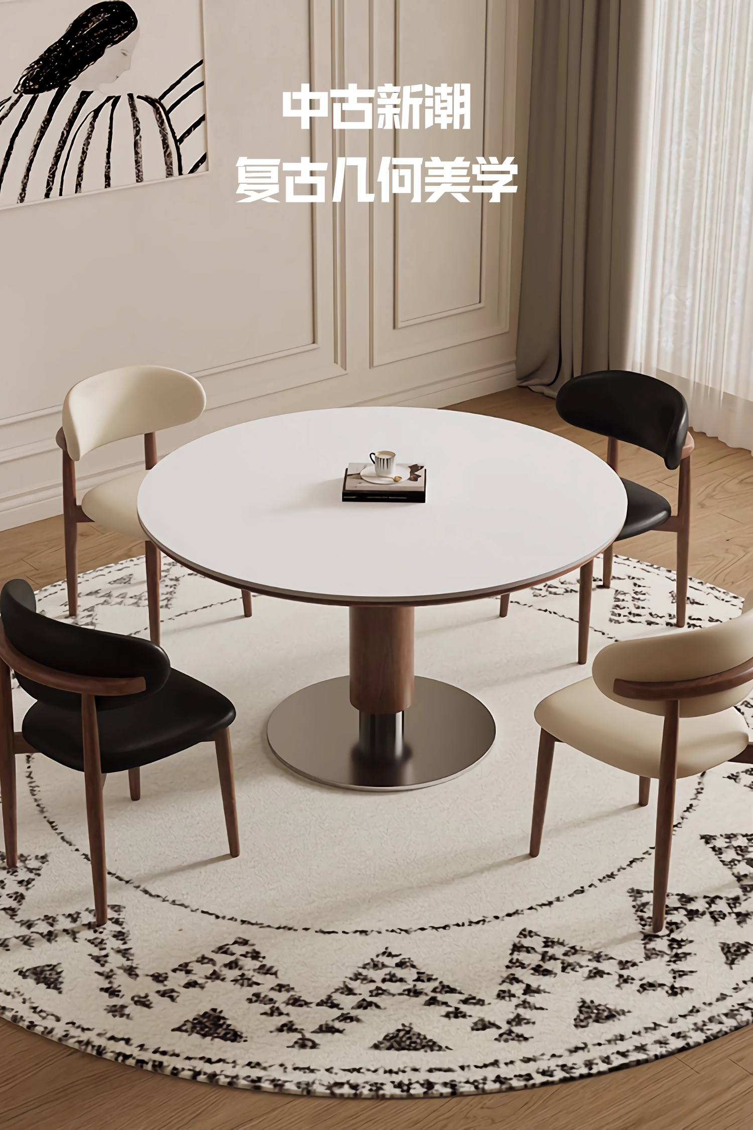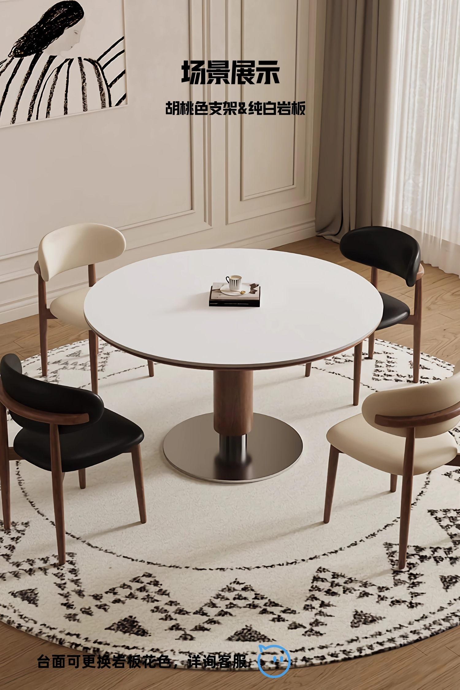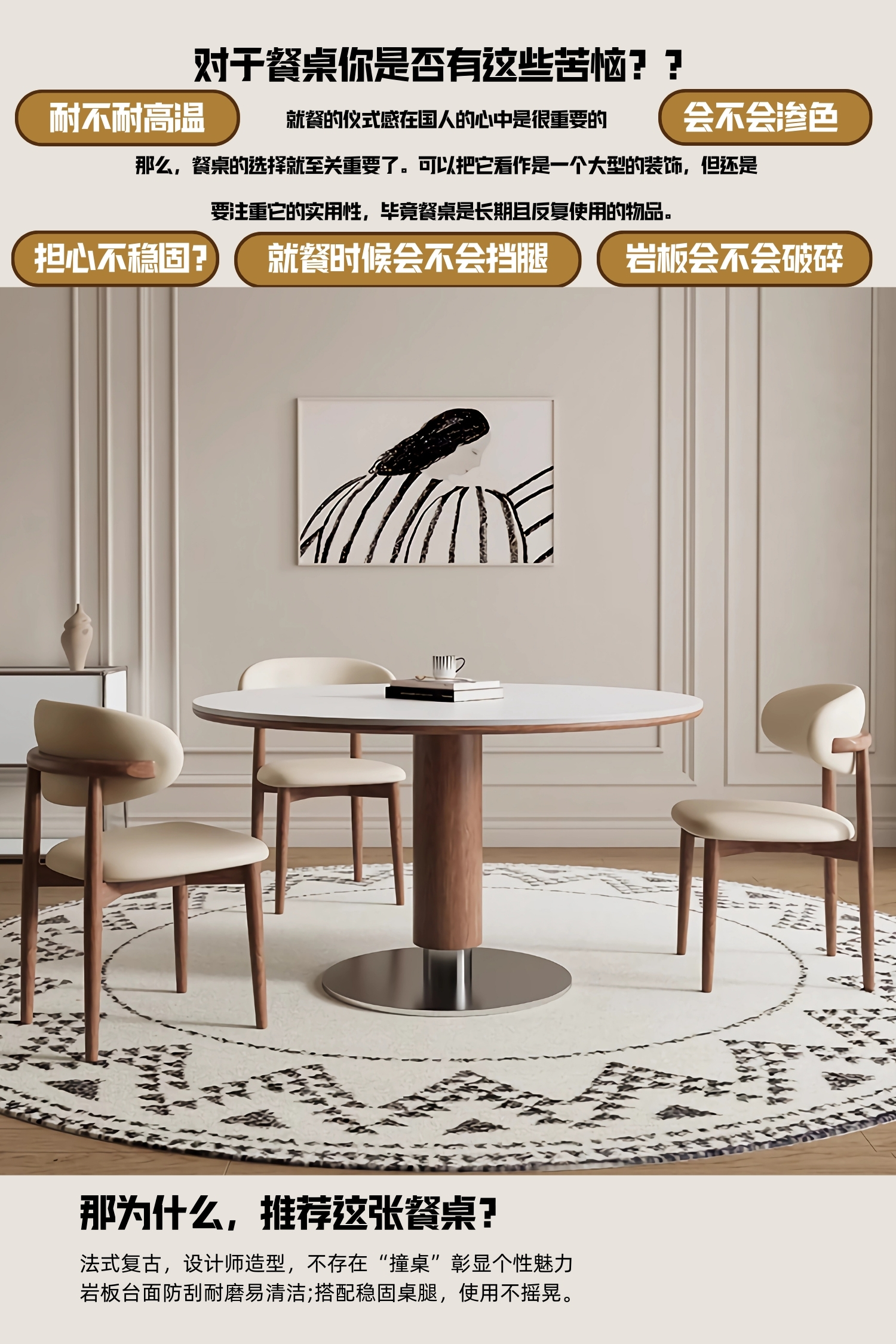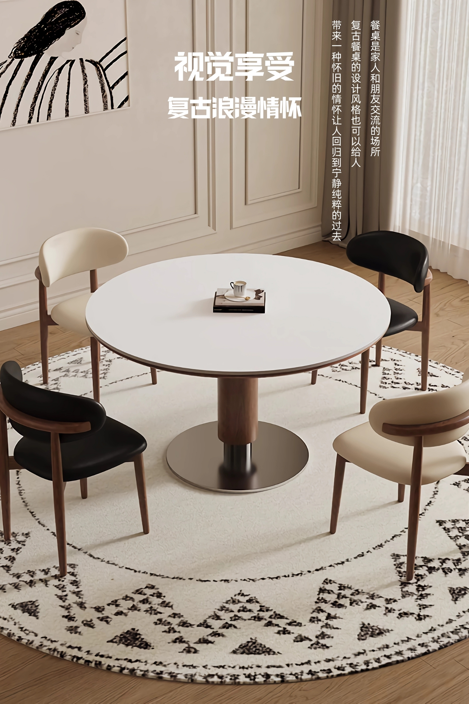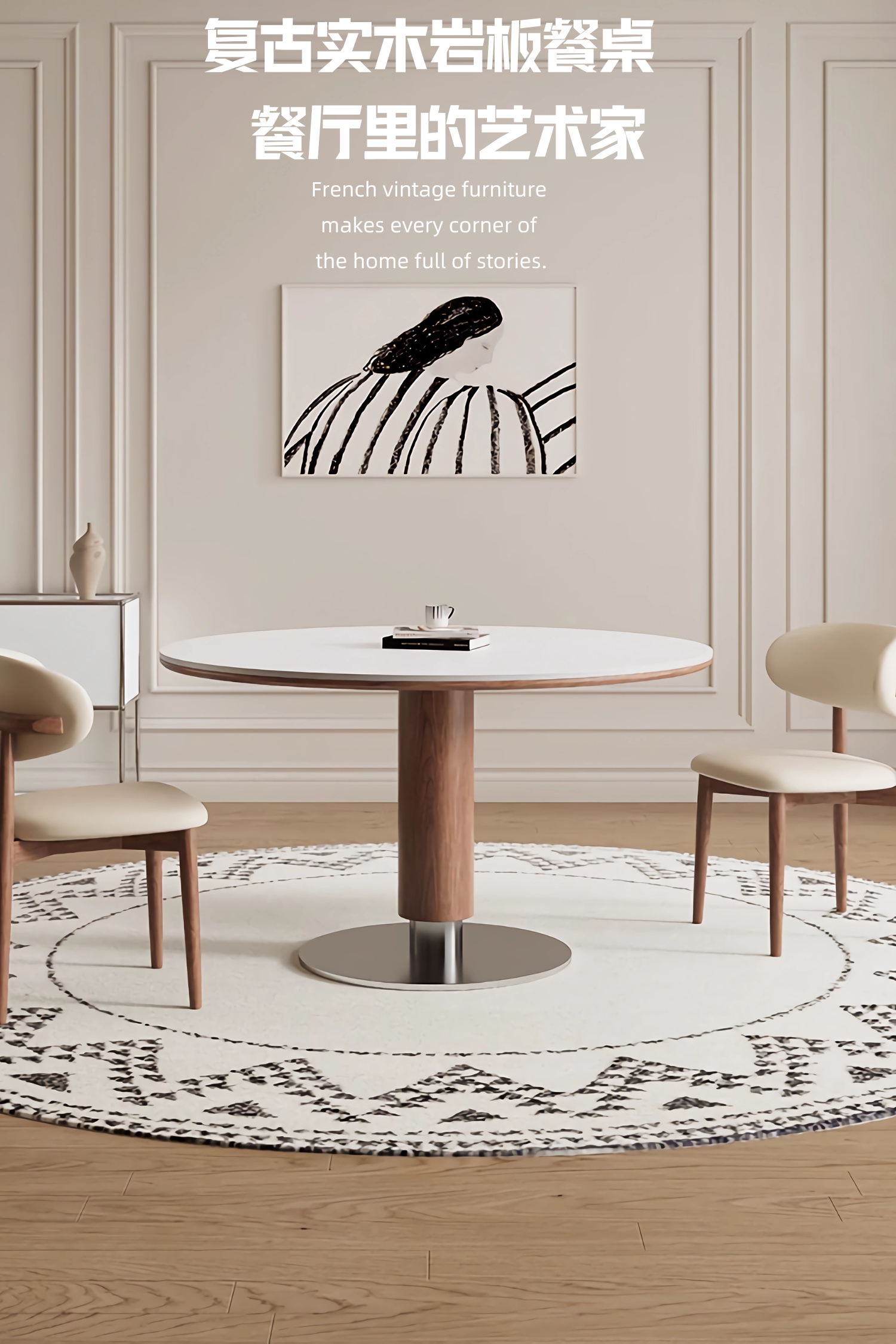 中古风实木岩板餐桌椅组合家用圆形饭桌法式复古胡桃色实木餐桌