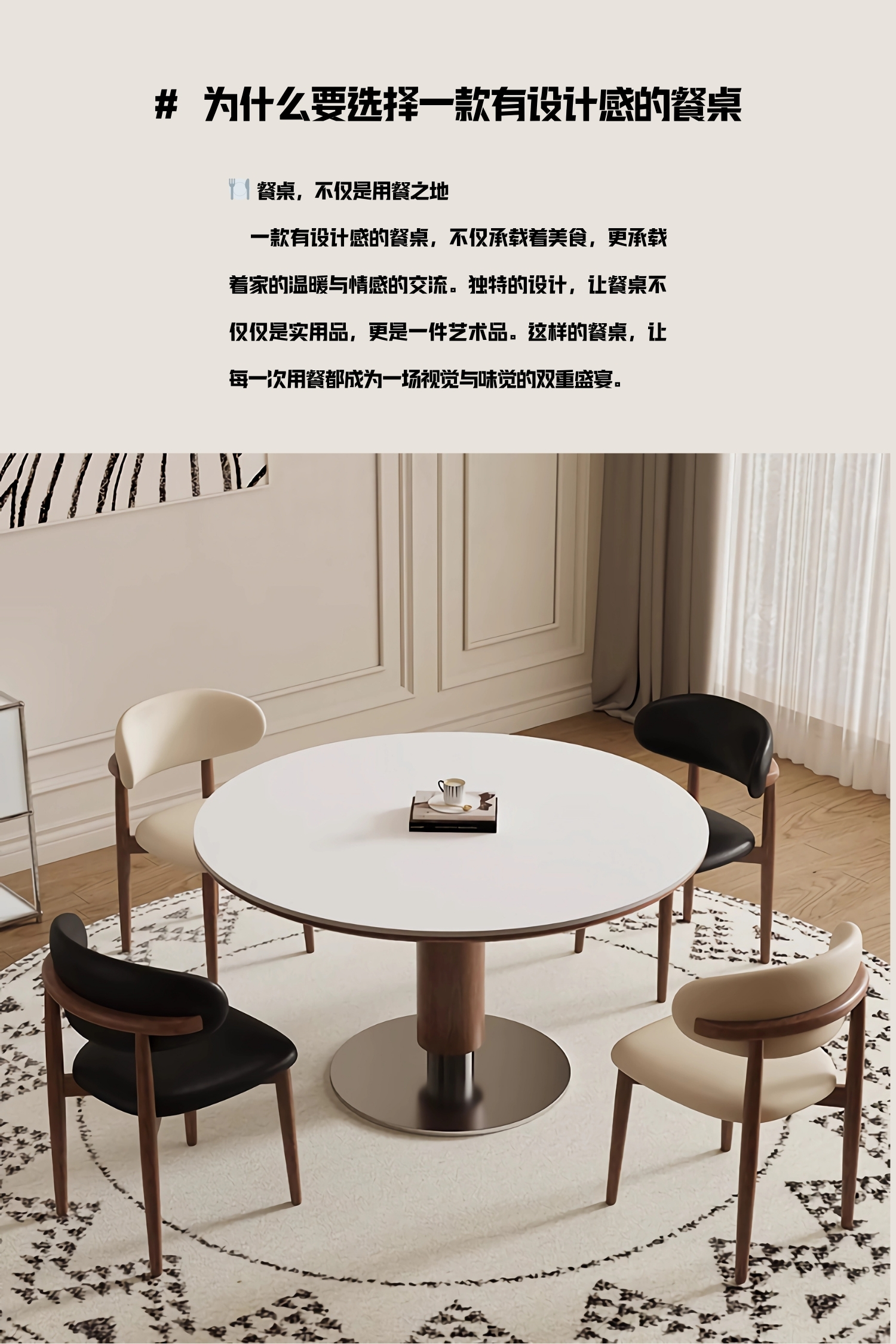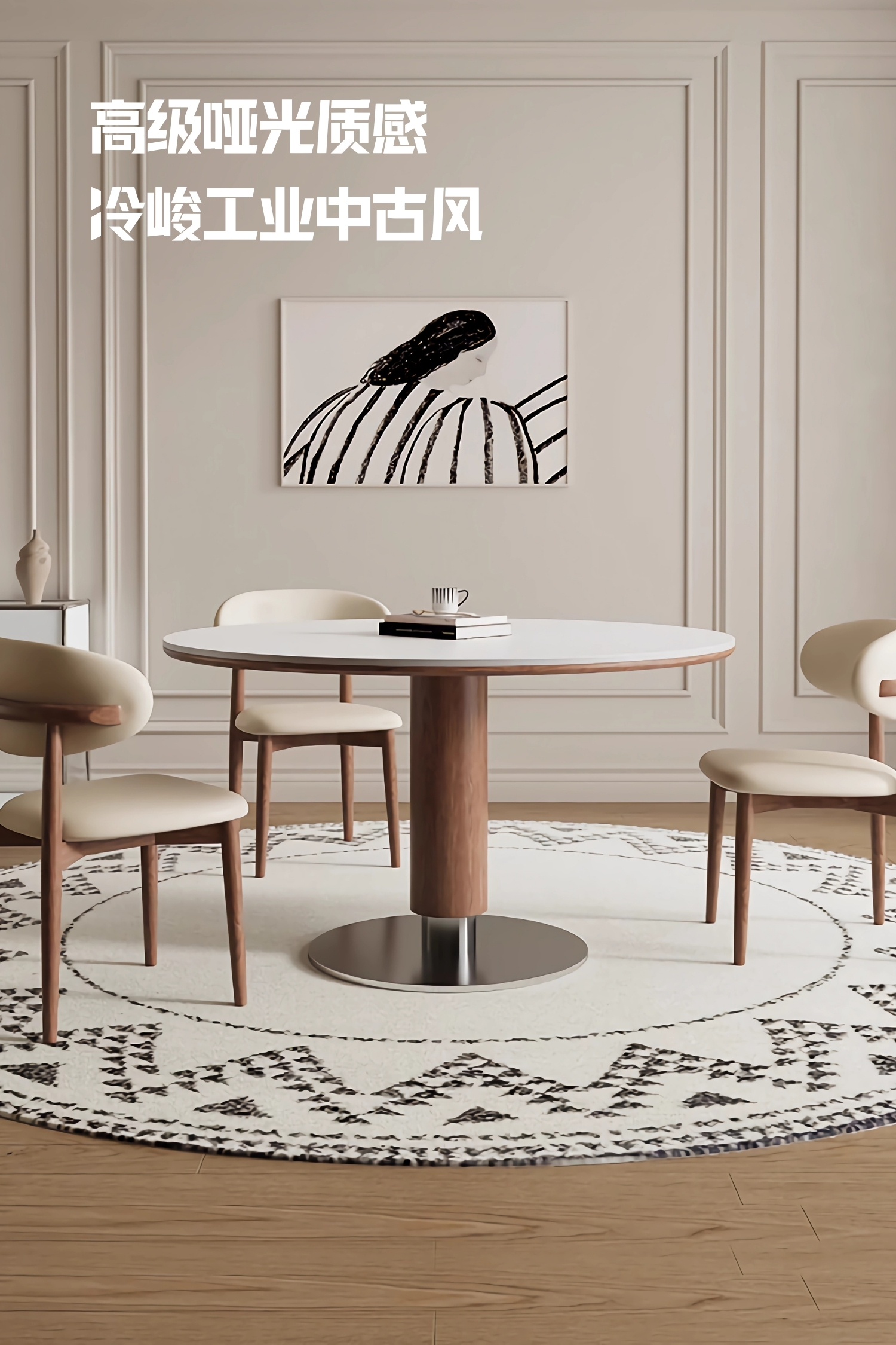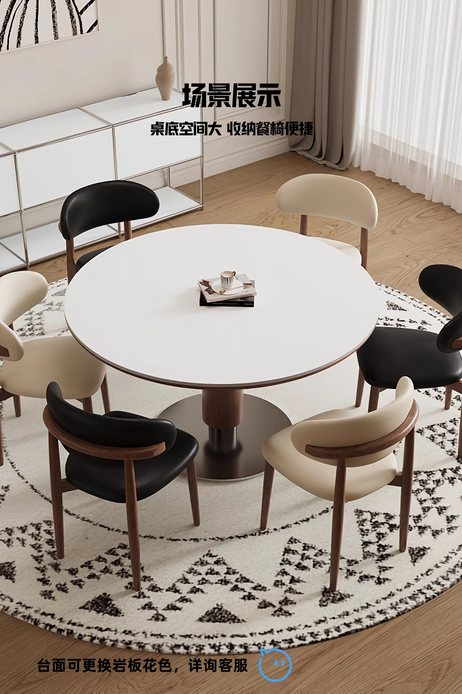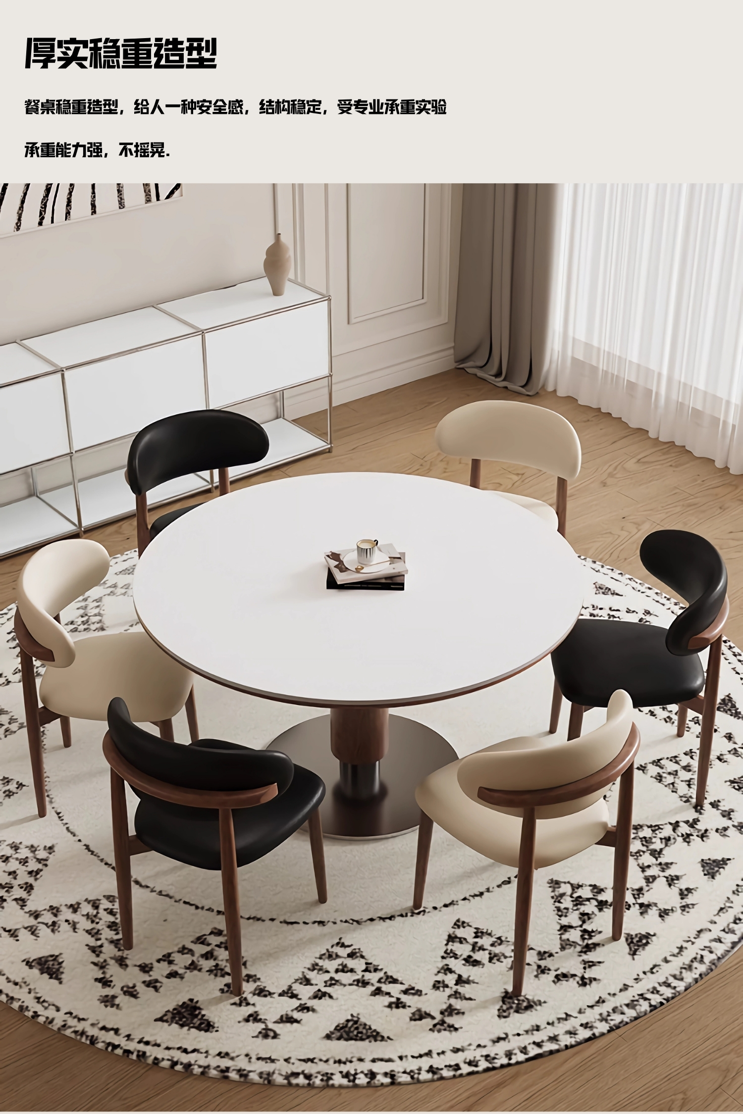 中古风实木岩板餐桌椅组合家用圆形饭桌法式复古胡桃色实木餐桌
