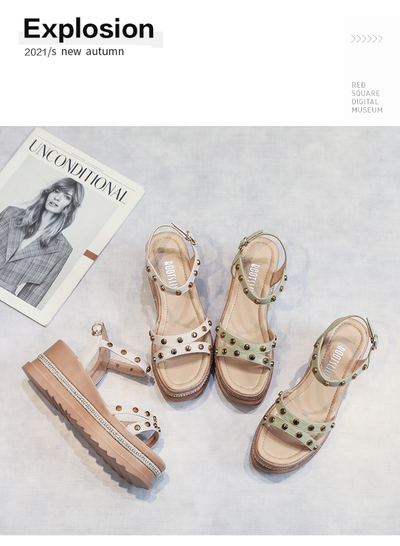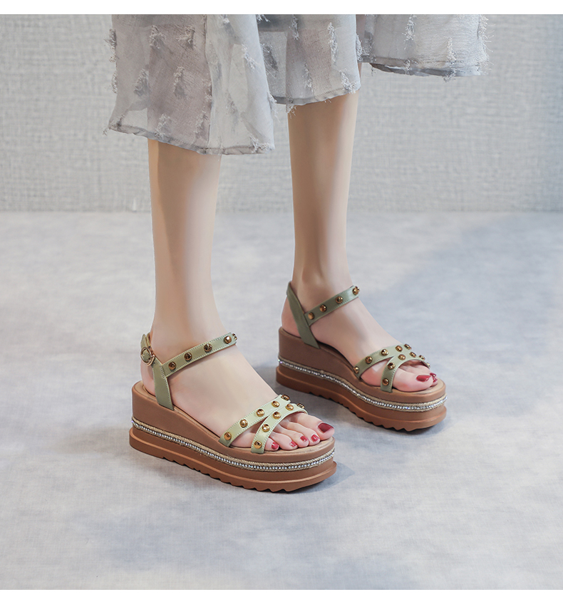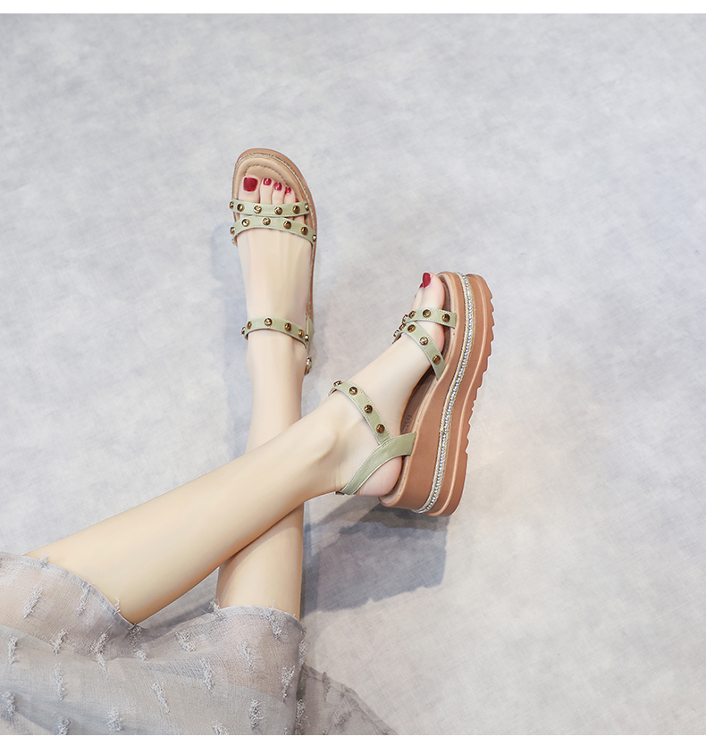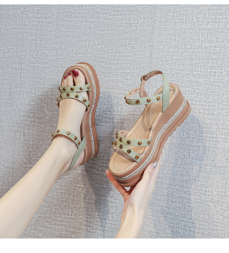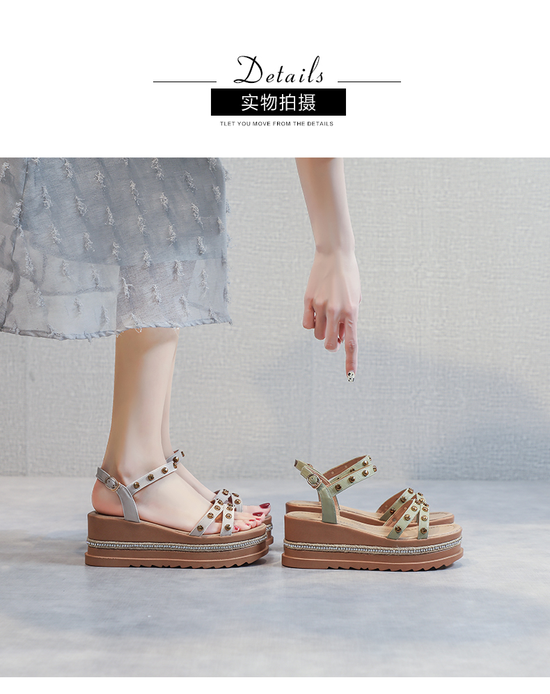 2025年新款夏季坡跟时尚厚底松糕一字扣网红气质铆钉罗马凉鞋女