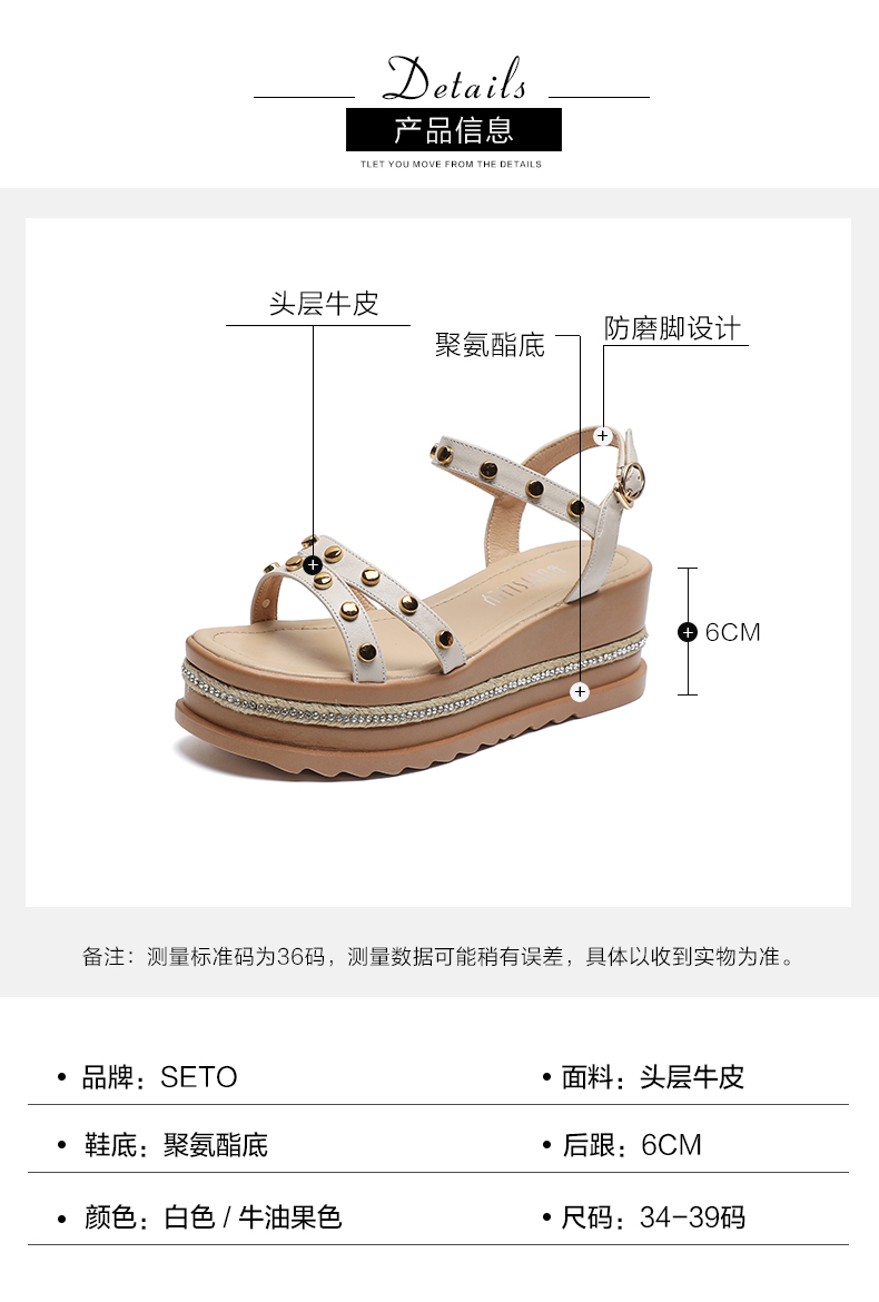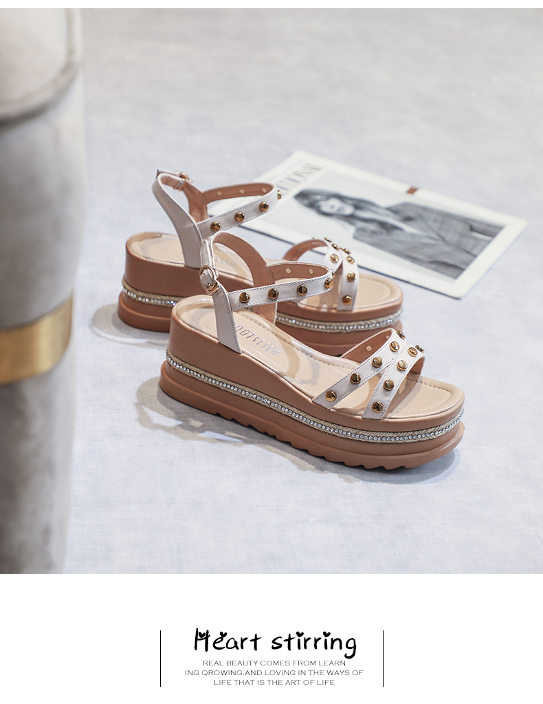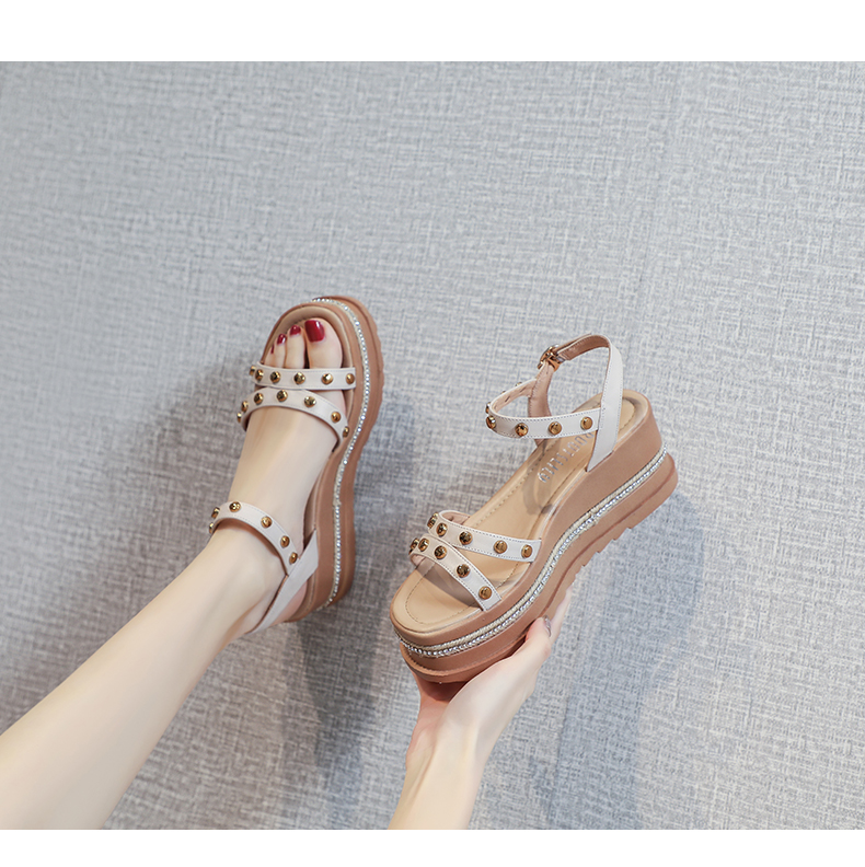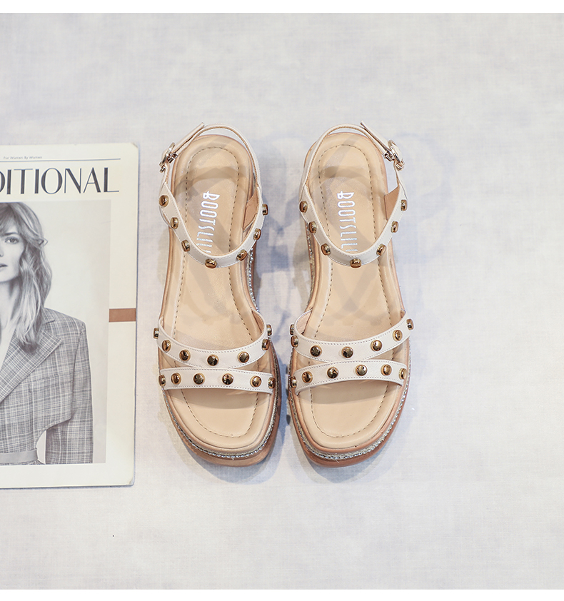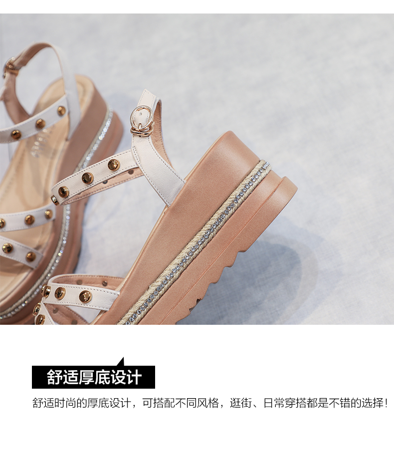 2025年新款夏季坡跟时尚厚底松糕一字扣网红气质铆钉罗马凉鞋女