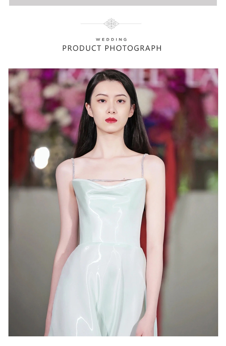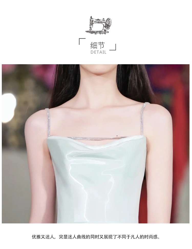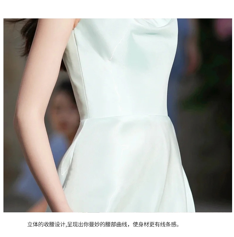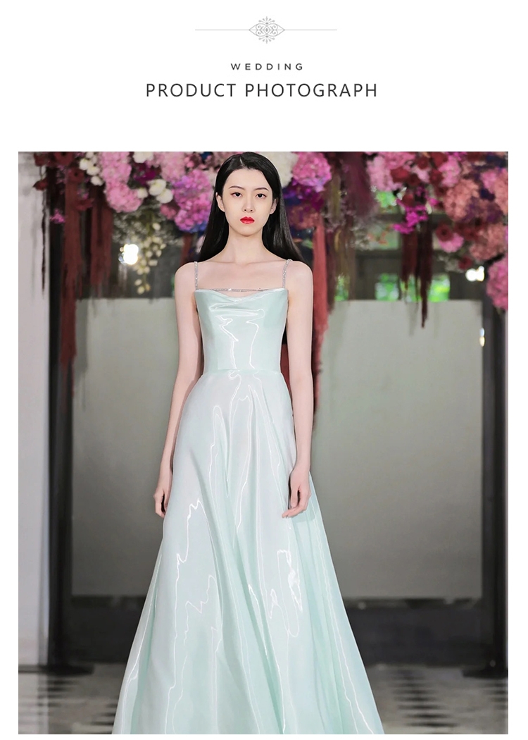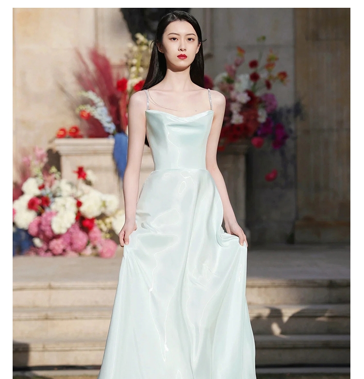 法式浅绿吊带缎面晚礼服裙气质宴会主持派对生日简约敬酒服轻婚纱