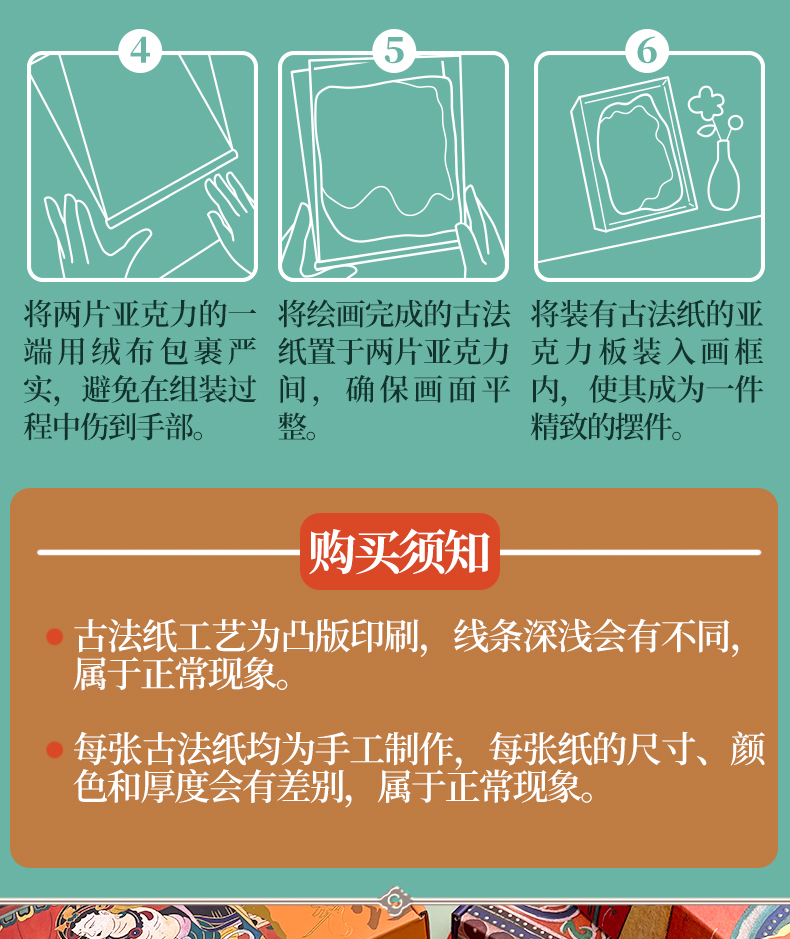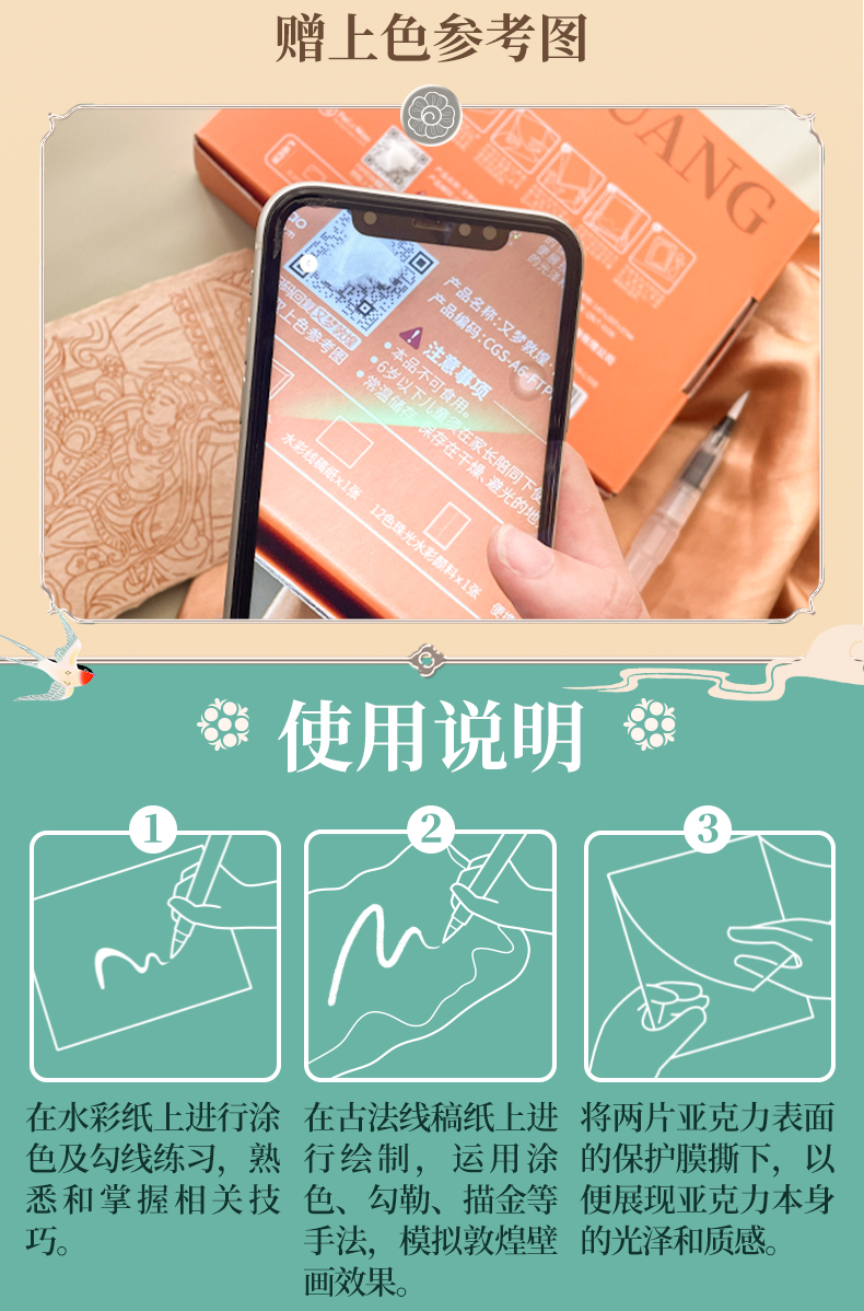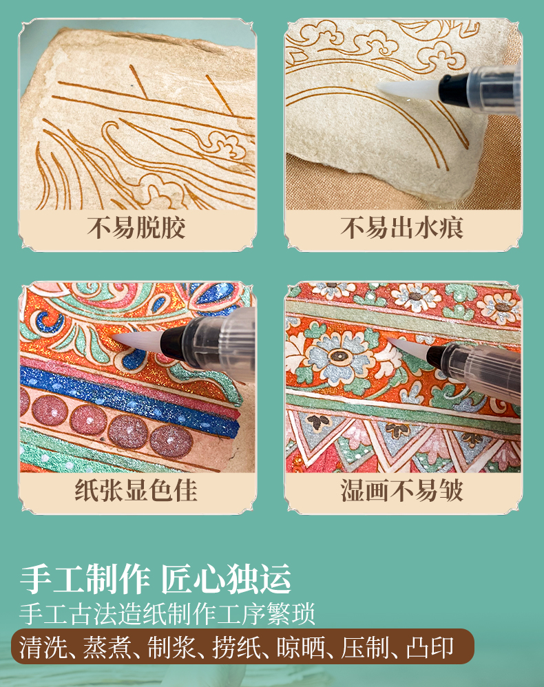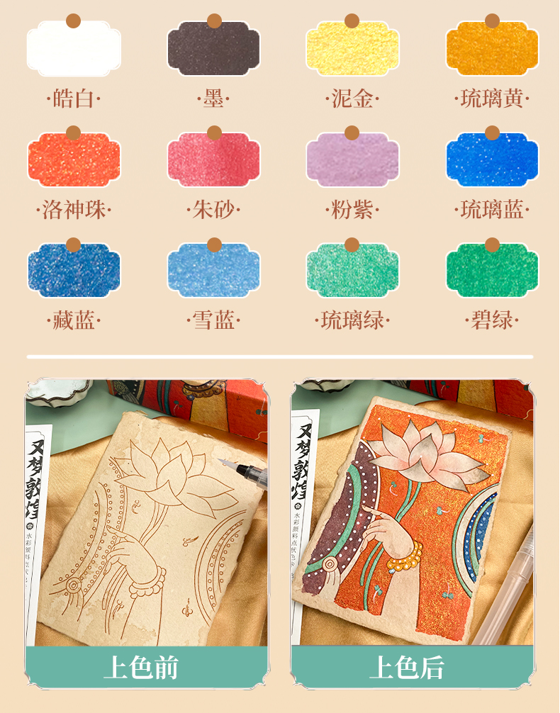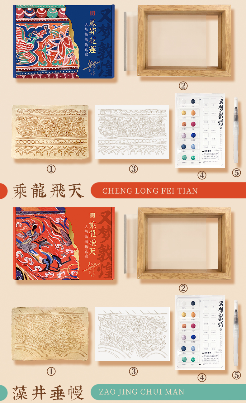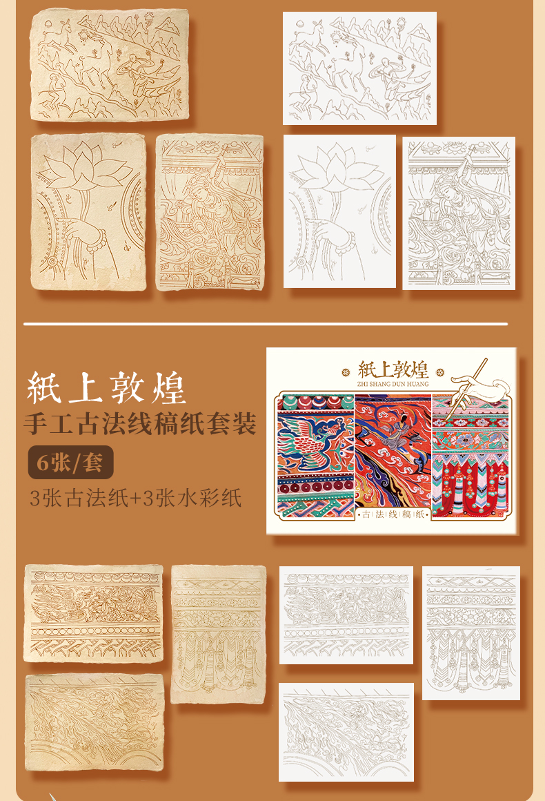 飞乐鸟又梦敦煌古法纸涂色礼盒线稿套装 珠光水彩颜料绘画线稿纸 手工古法工艺桌摆装饰画亲子手绘涂色减压