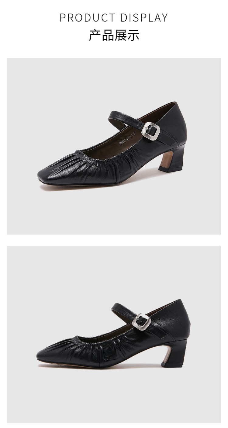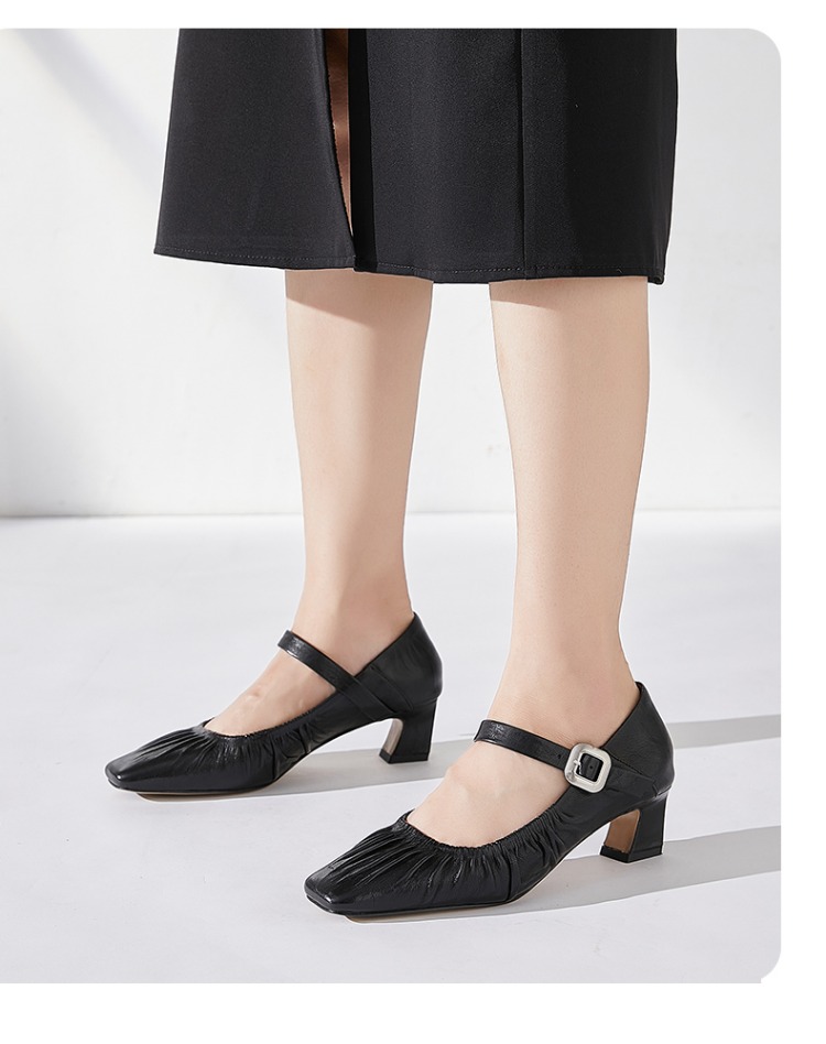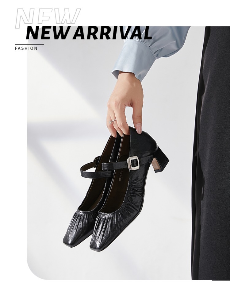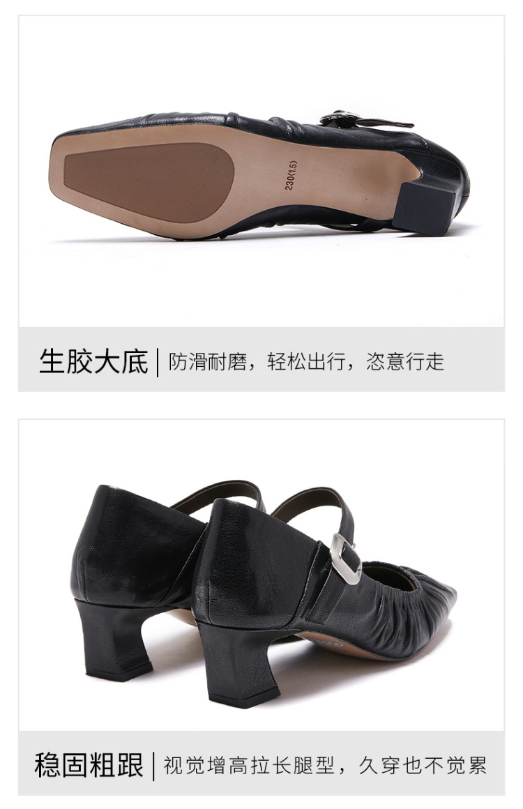 一字扣带真皮羊皮高跟单鞋女2025年新款法式方头褶皱软底女鞋
