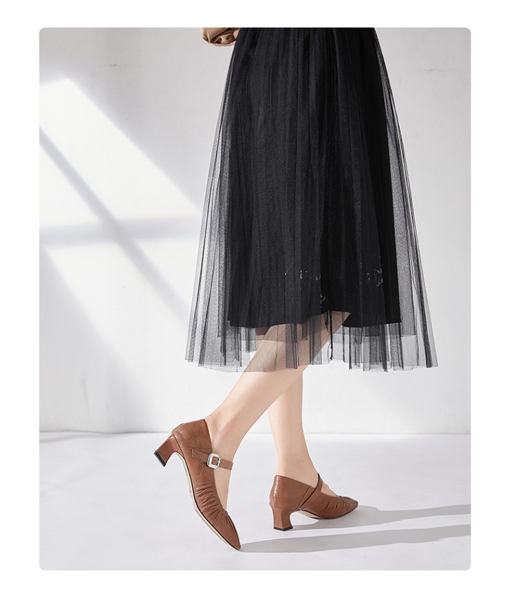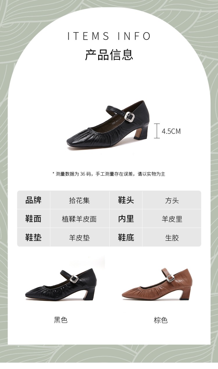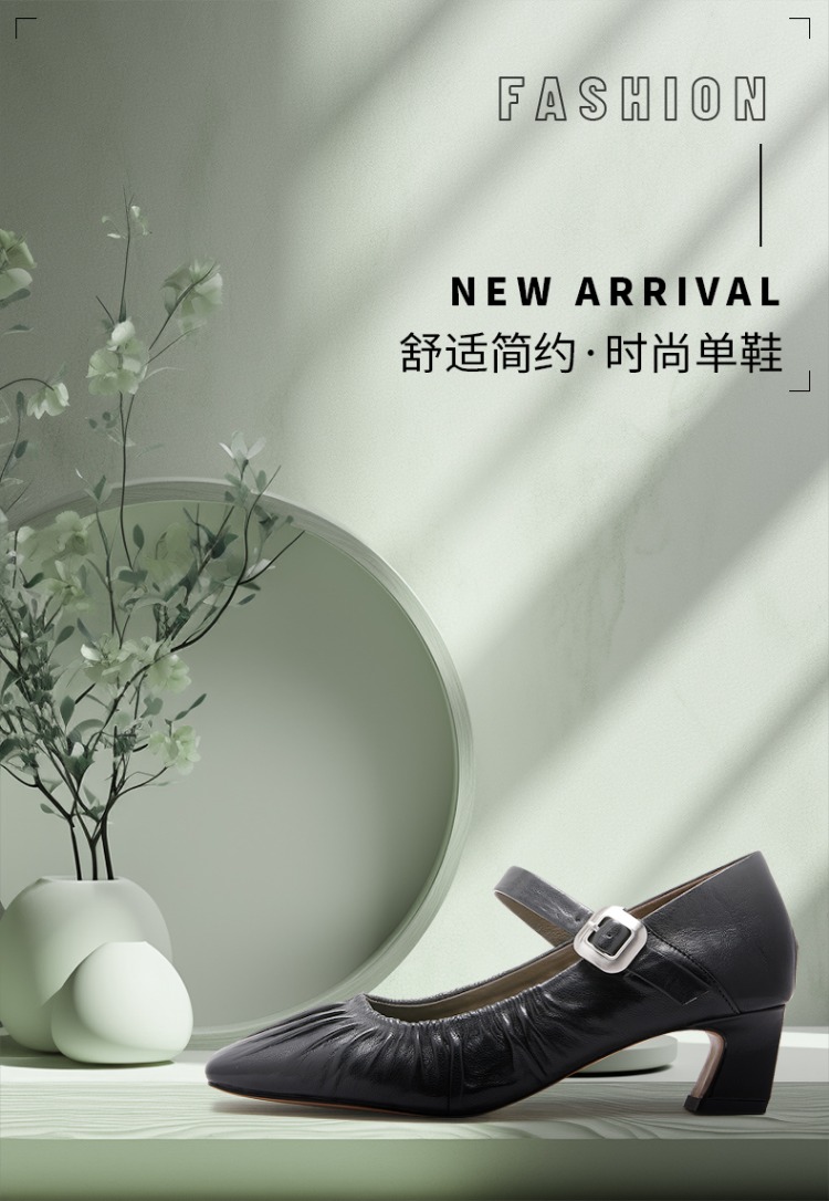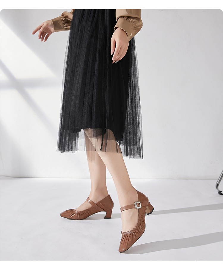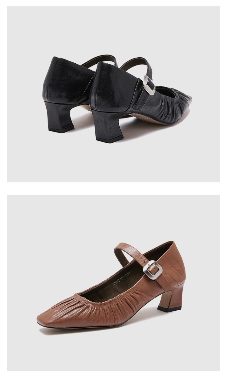 一字扣带真皮羊皮高跟单鞋女2025年新款法式方头褶皱软底女鞋