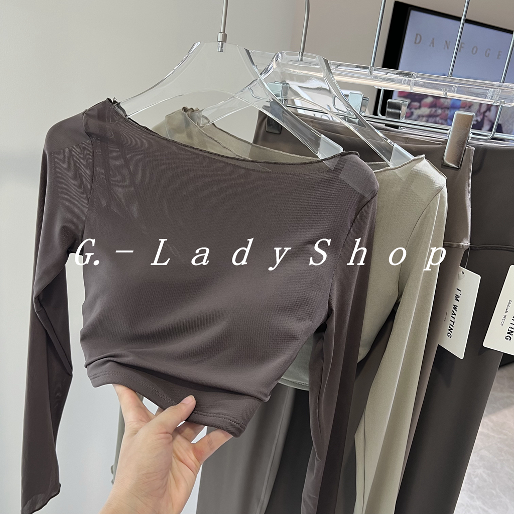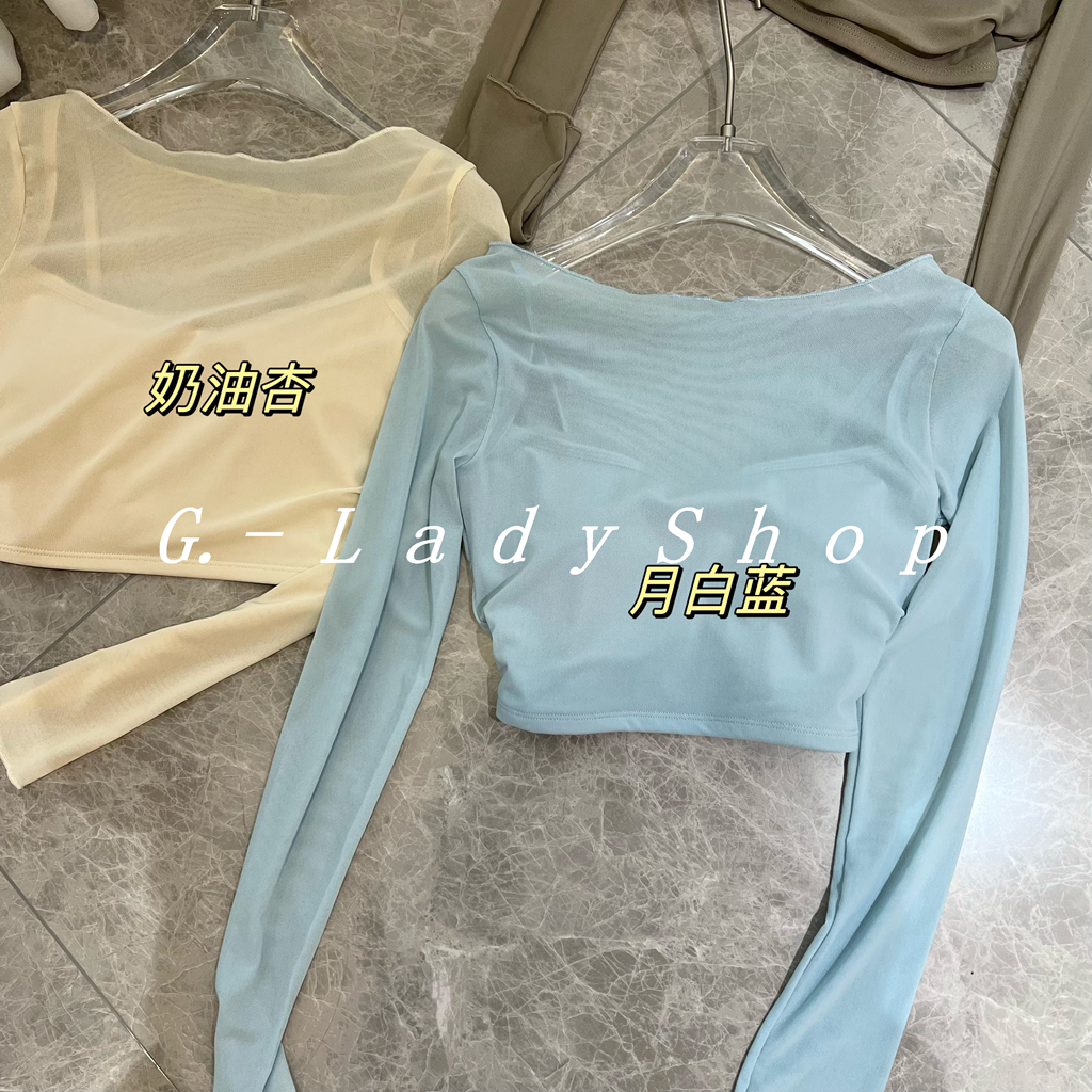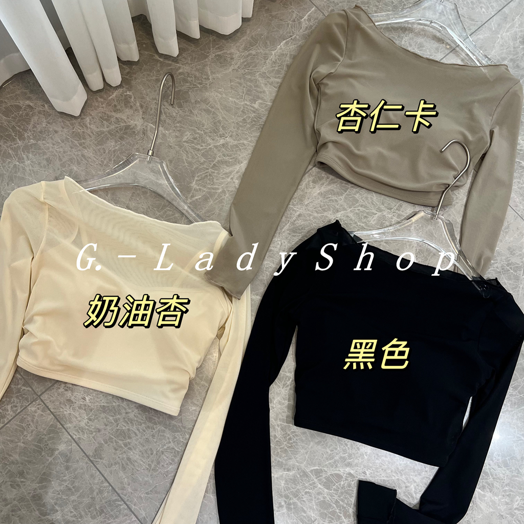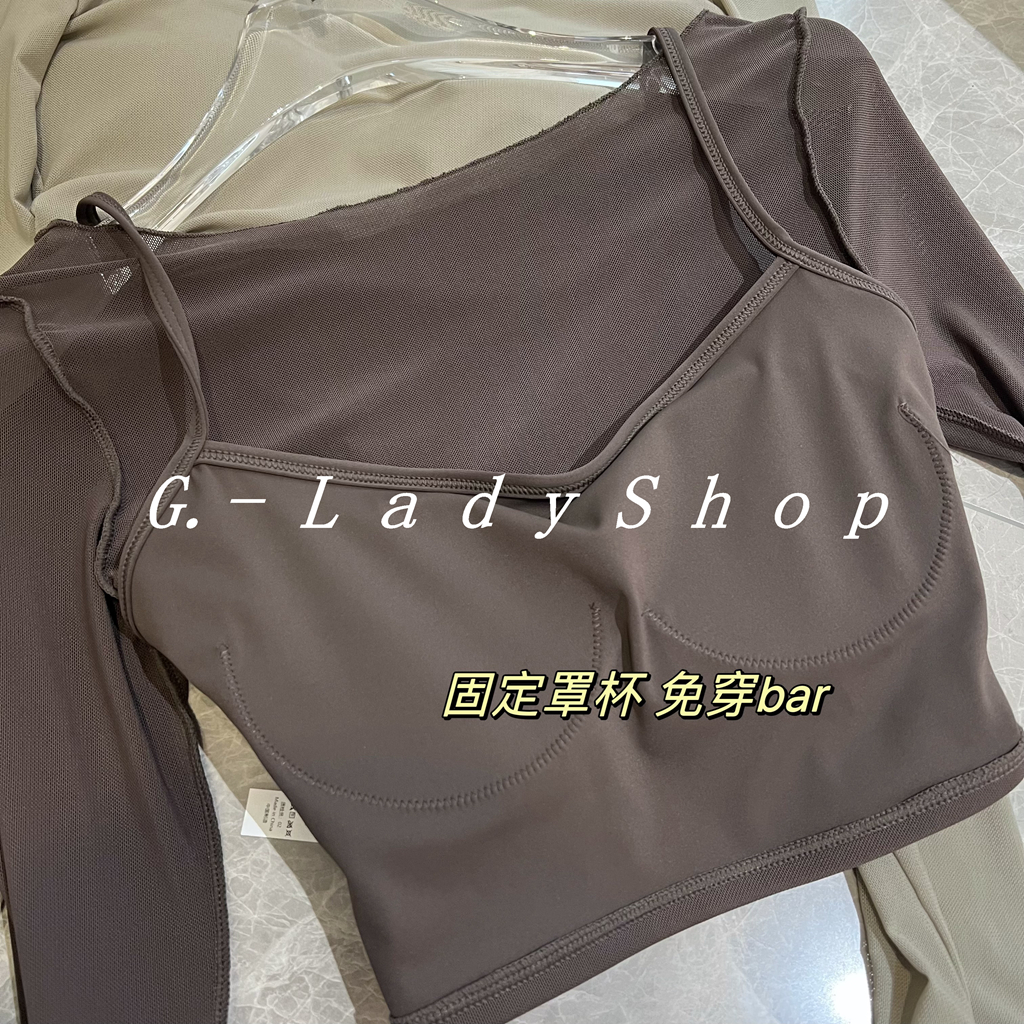随便穿都好看的一字领假两件网纱运动T恤 带胸垫短款露脐瑜伽上衣