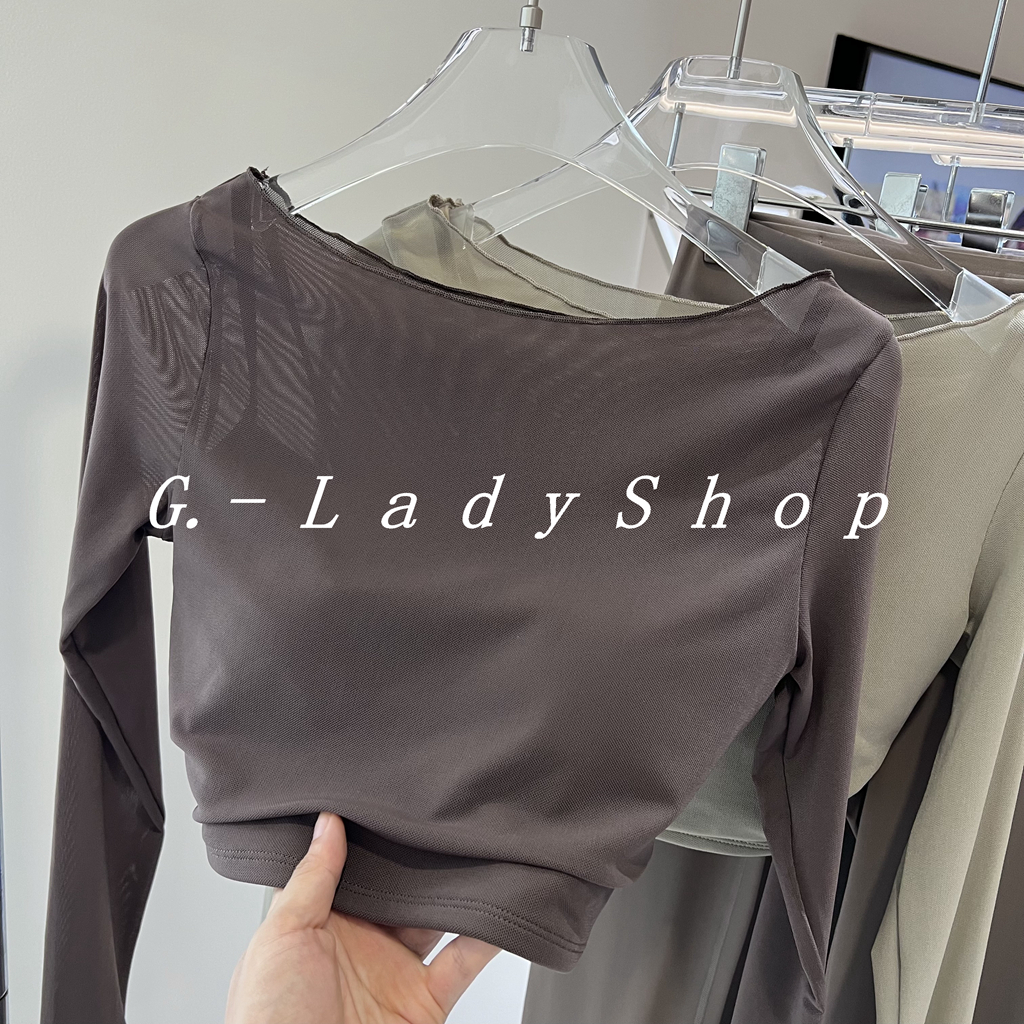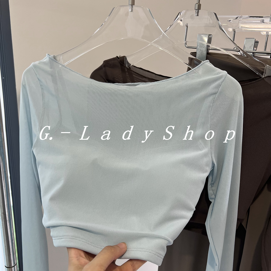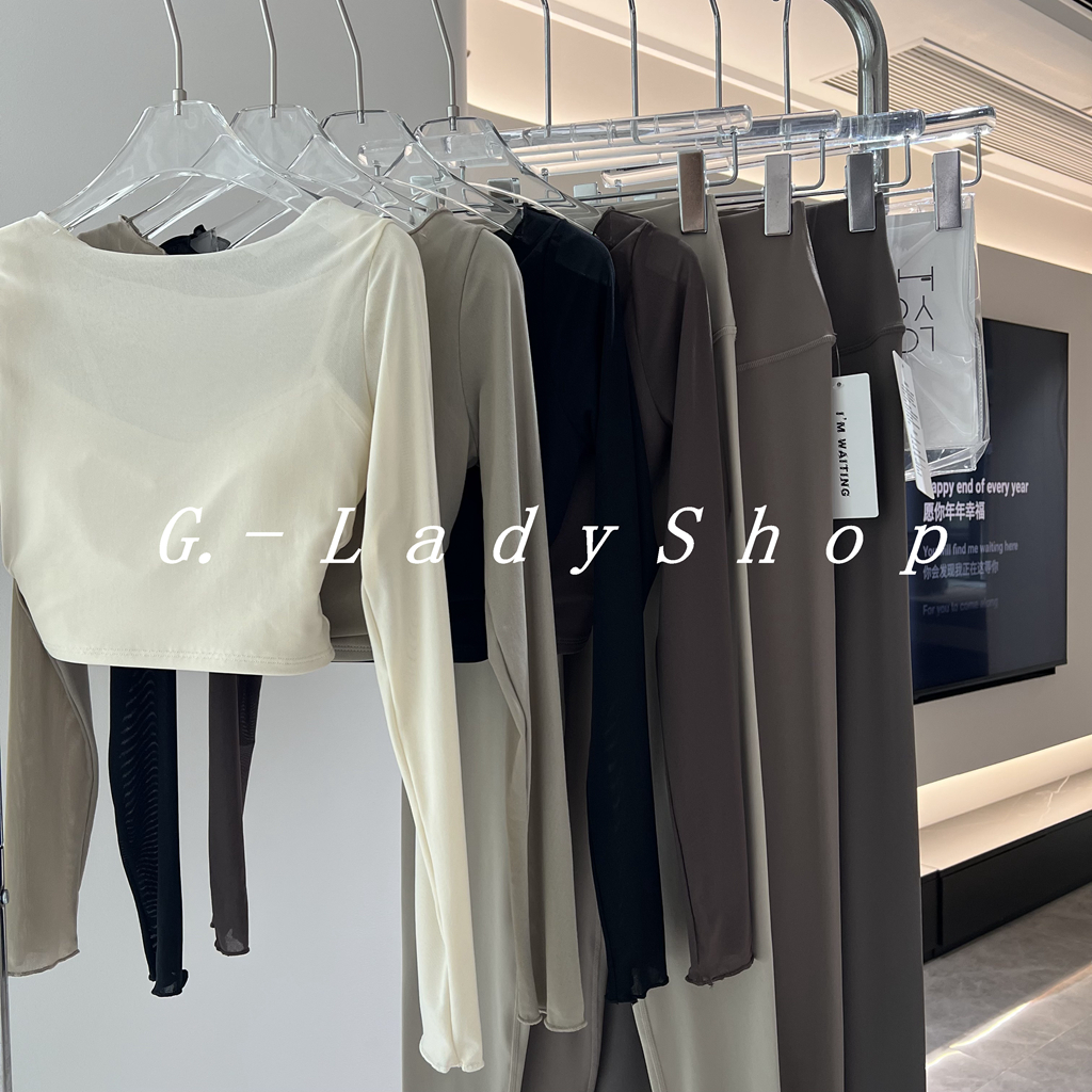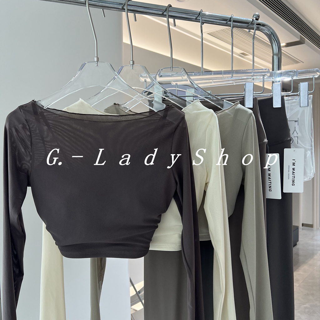 随便穿都好看的一字领假两件网纱运动T恤 带胸垫短款露脐瑜伽上衣