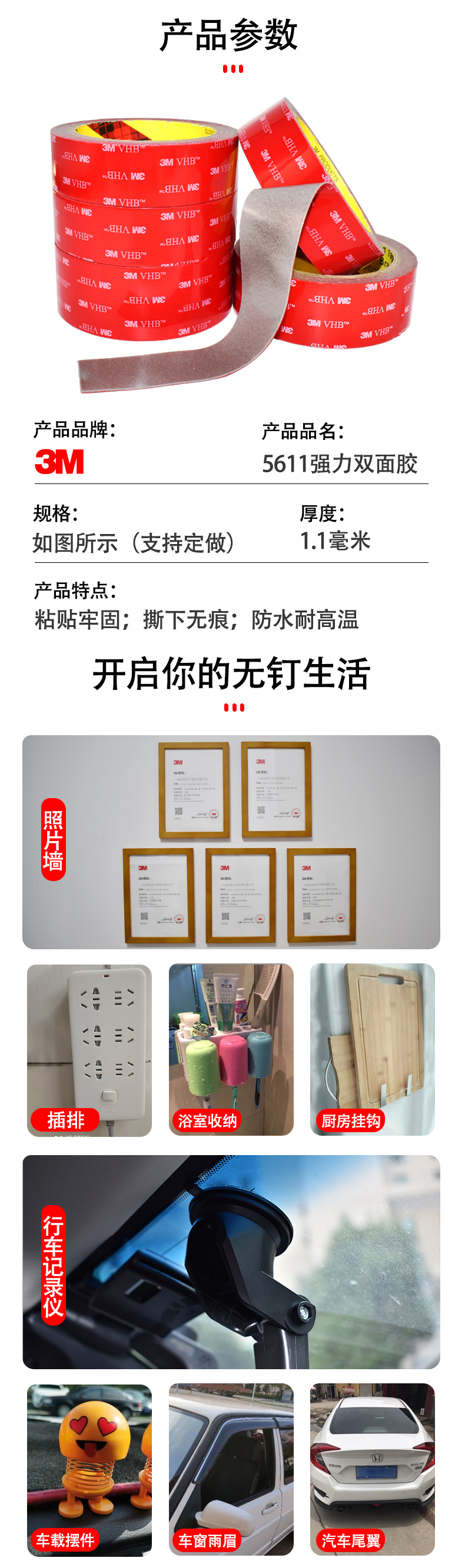 3M 5611A-GF双面胶强力泡绵胶带汽车专用胶耐高温无痕防水高粘度