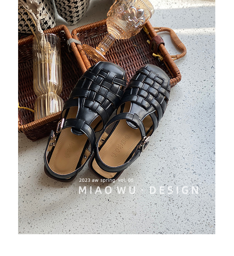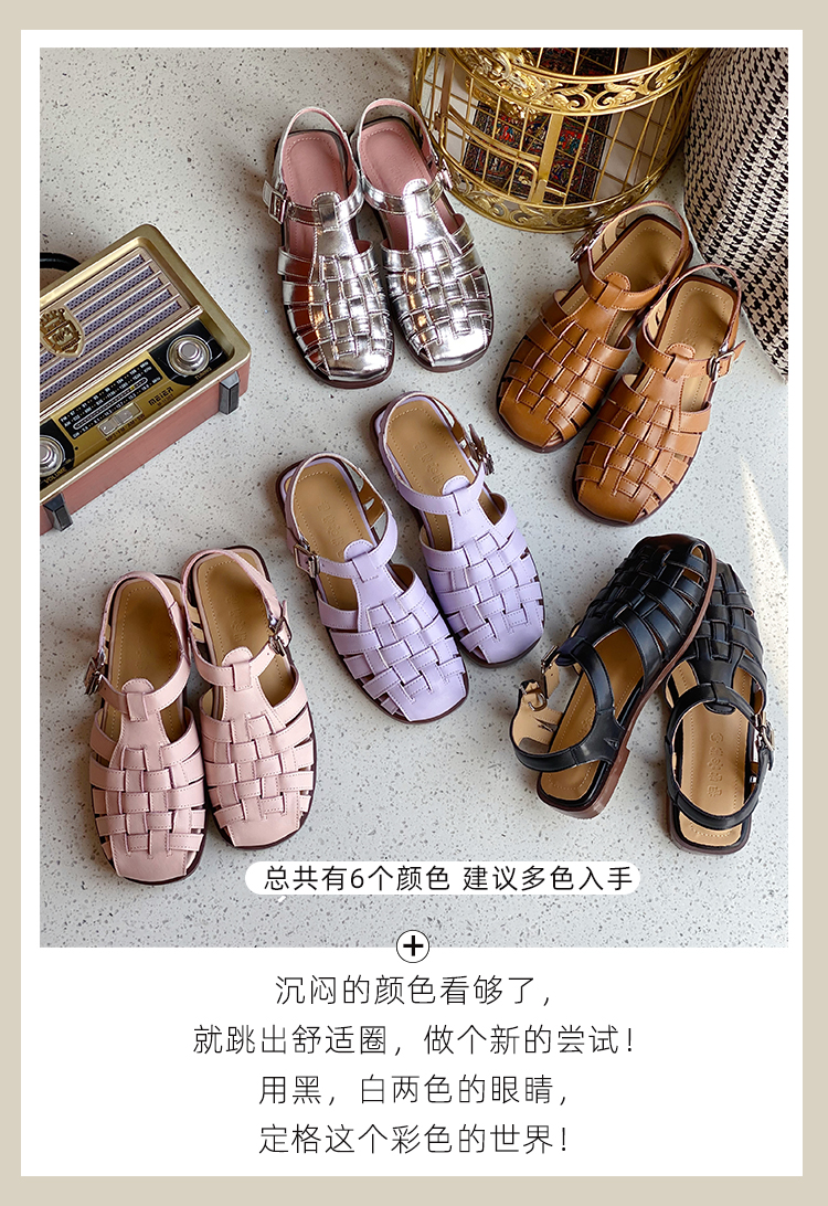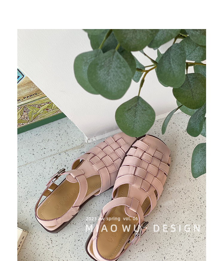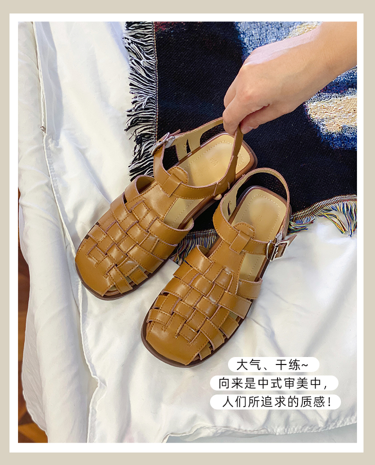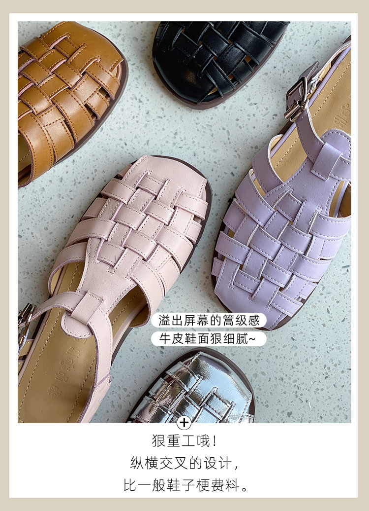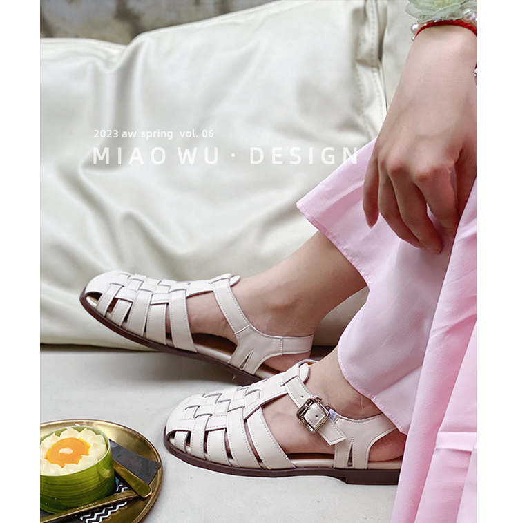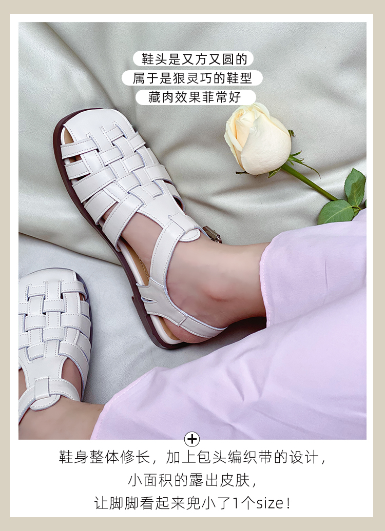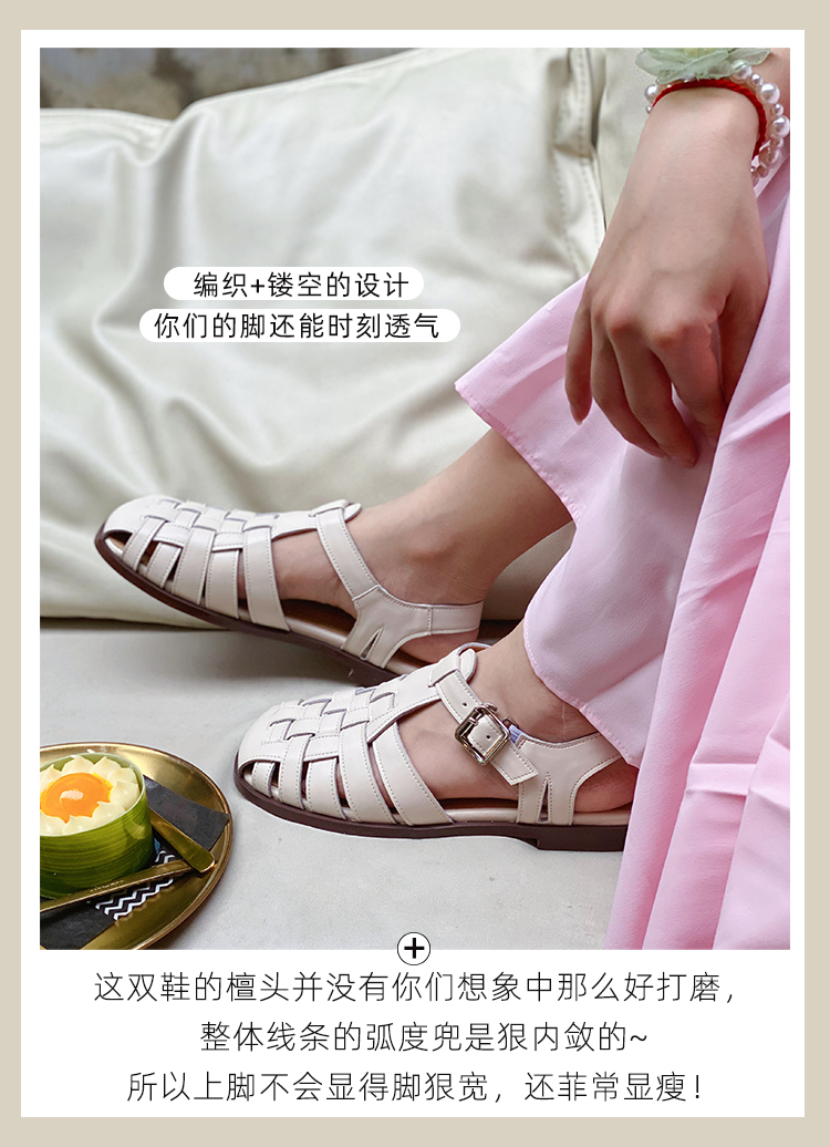 喵唔的天空包头罗马凉鞋女春夏编织平底一字扣镂空通勤沙滩鞋