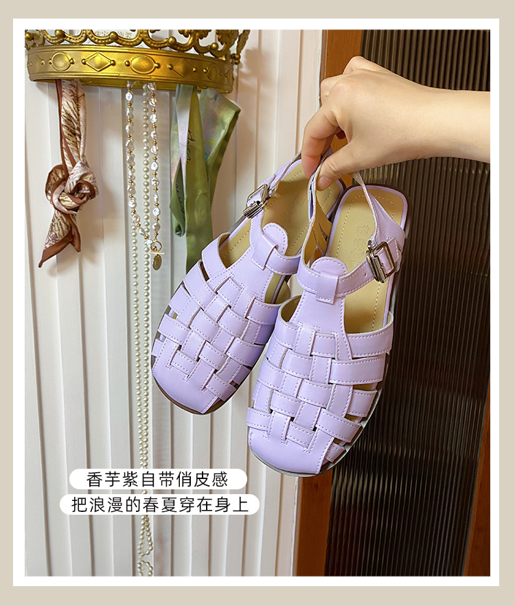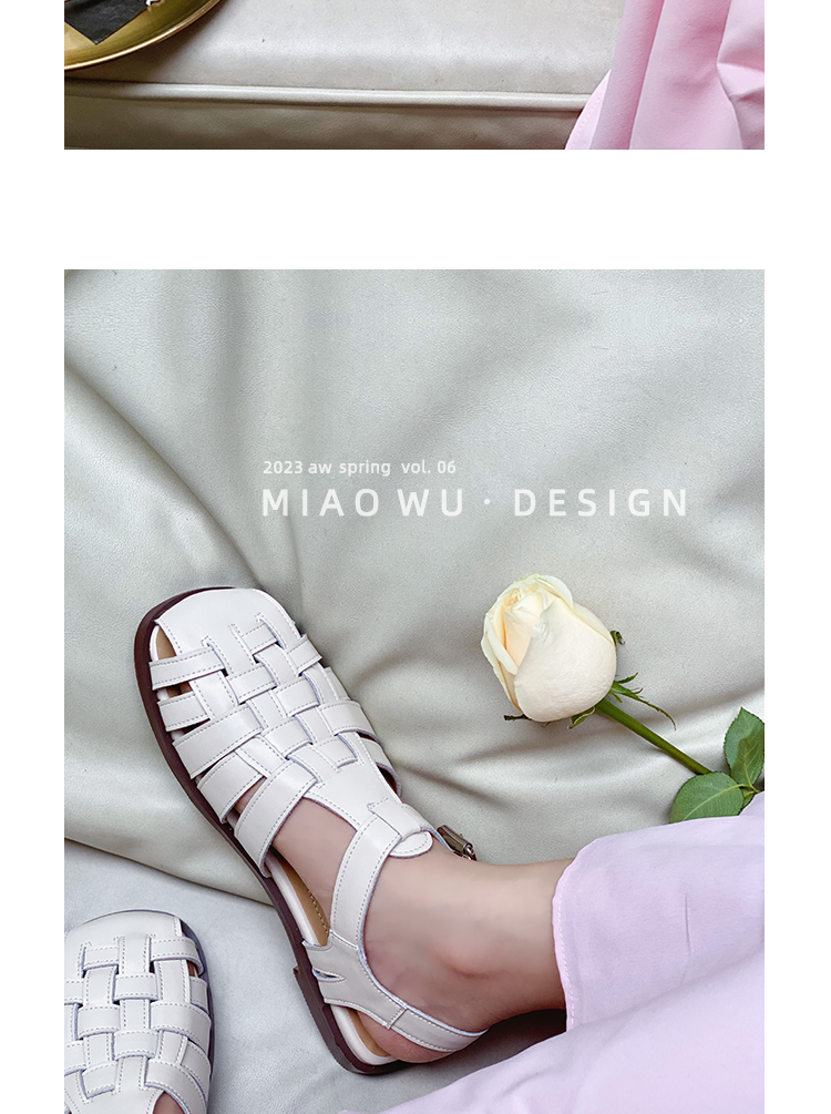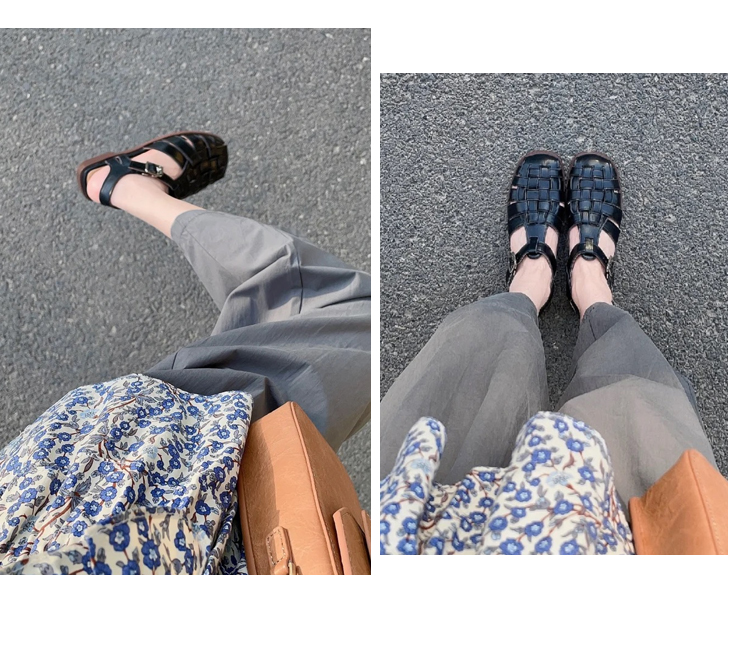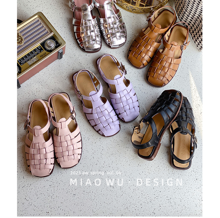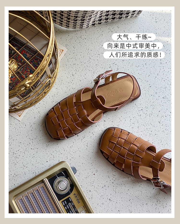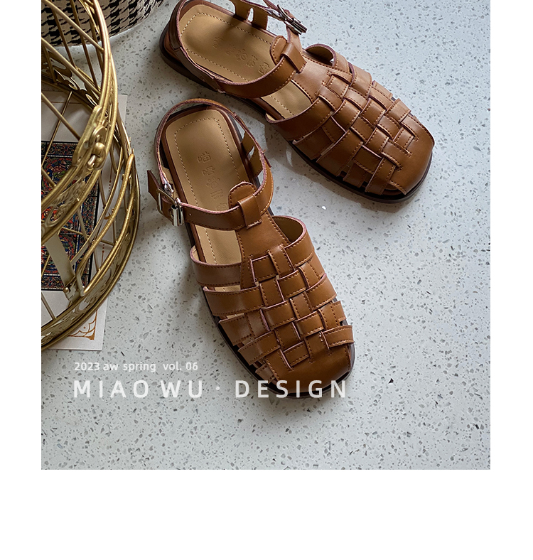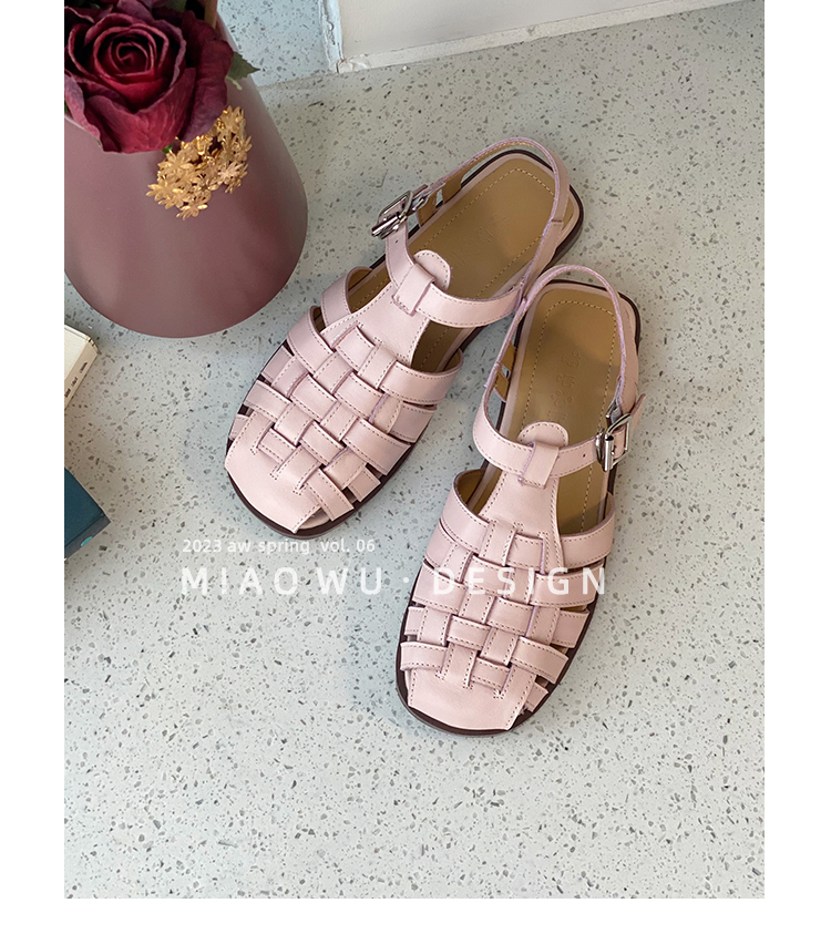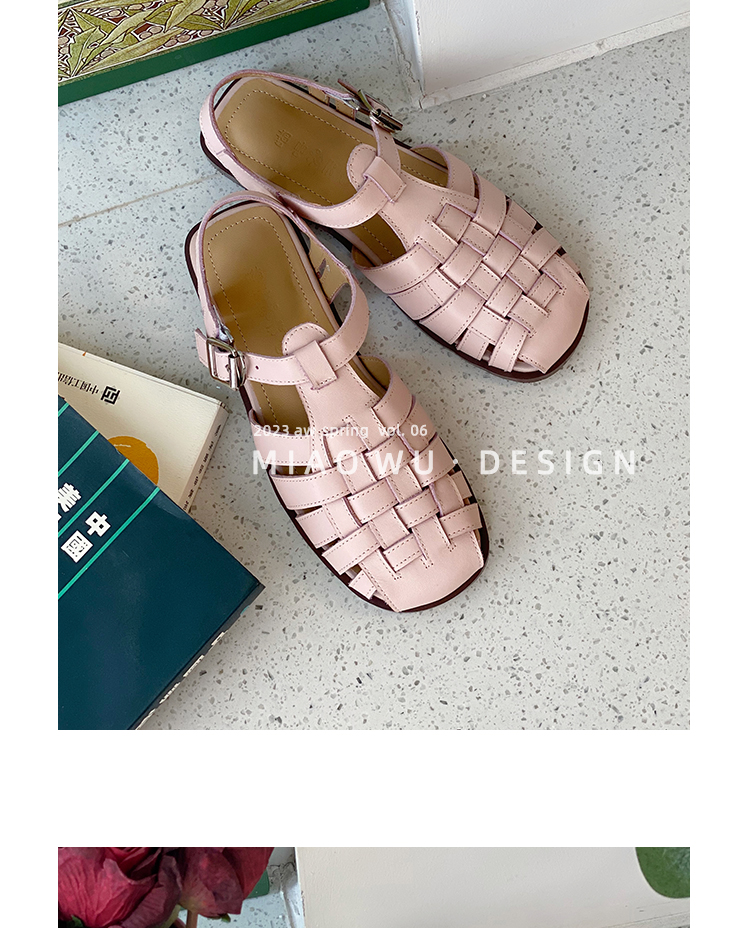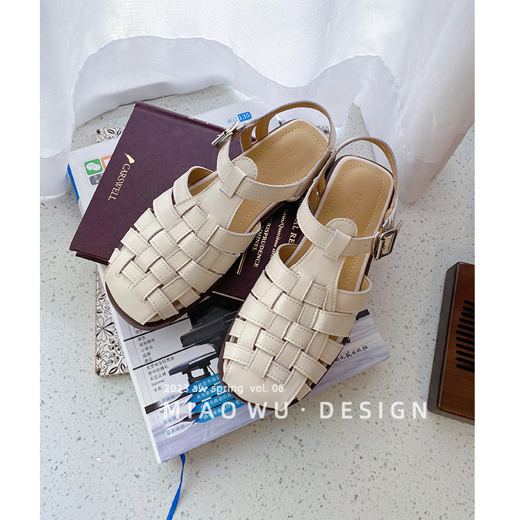 喵唔的天空包头罗马凉鞋女春夏编织平底一字扣镂空通勤沙滩鞋