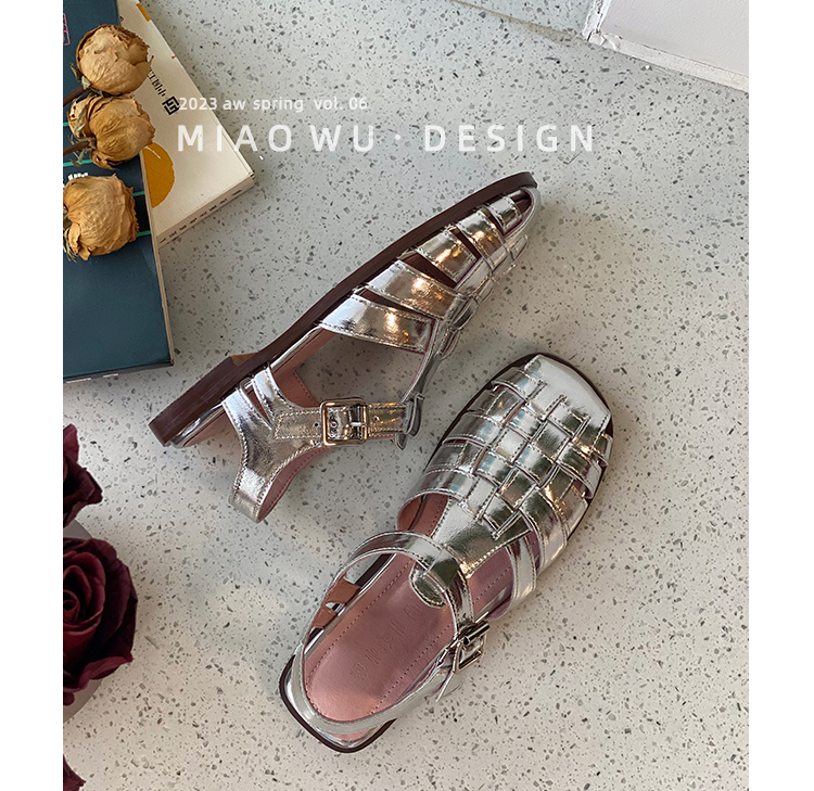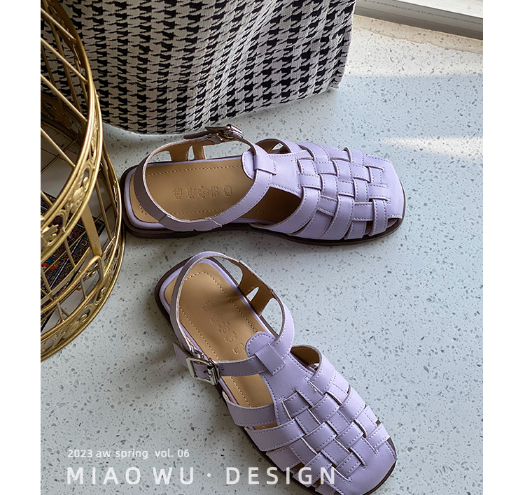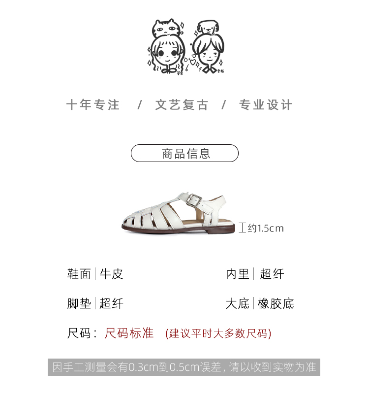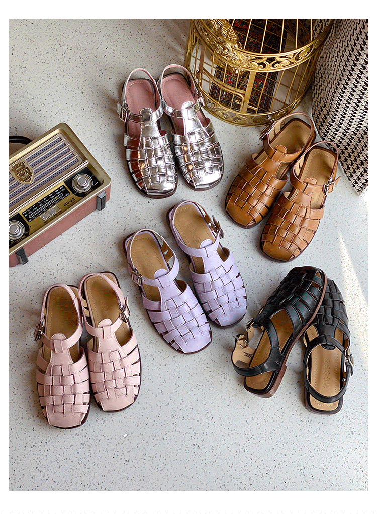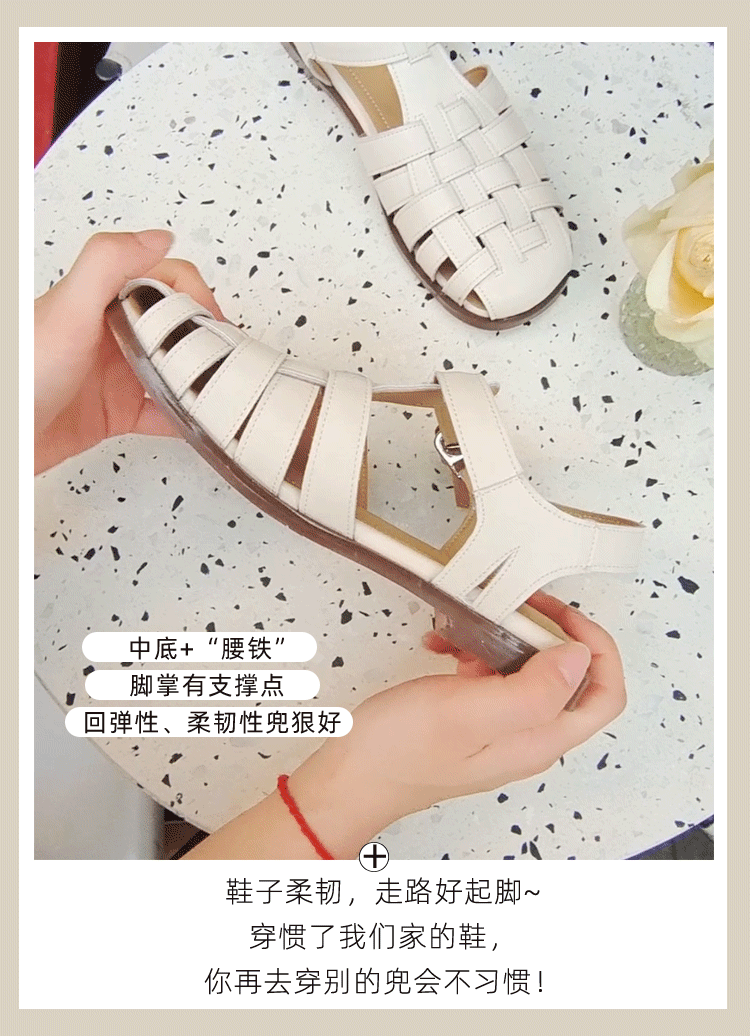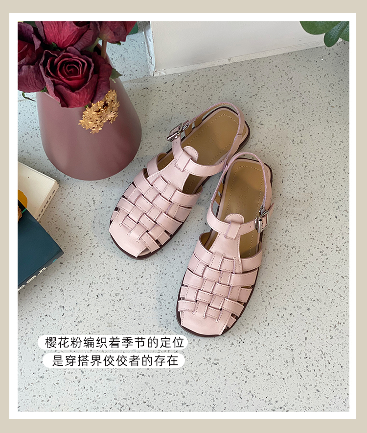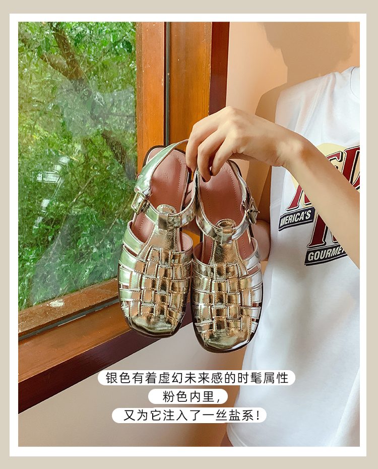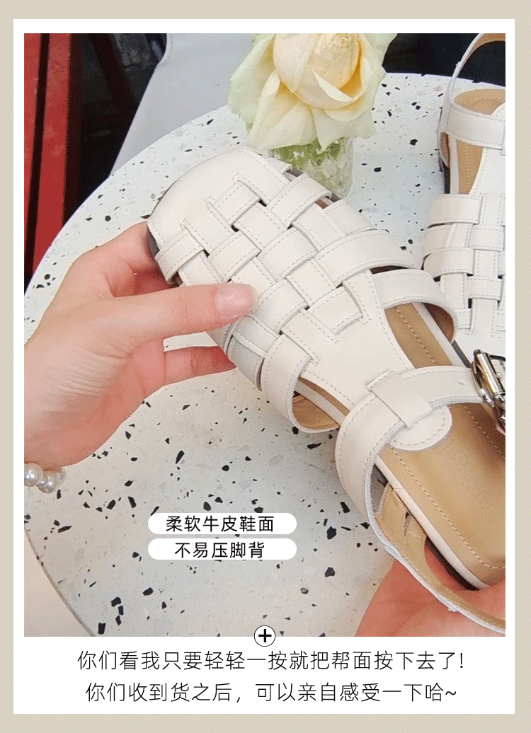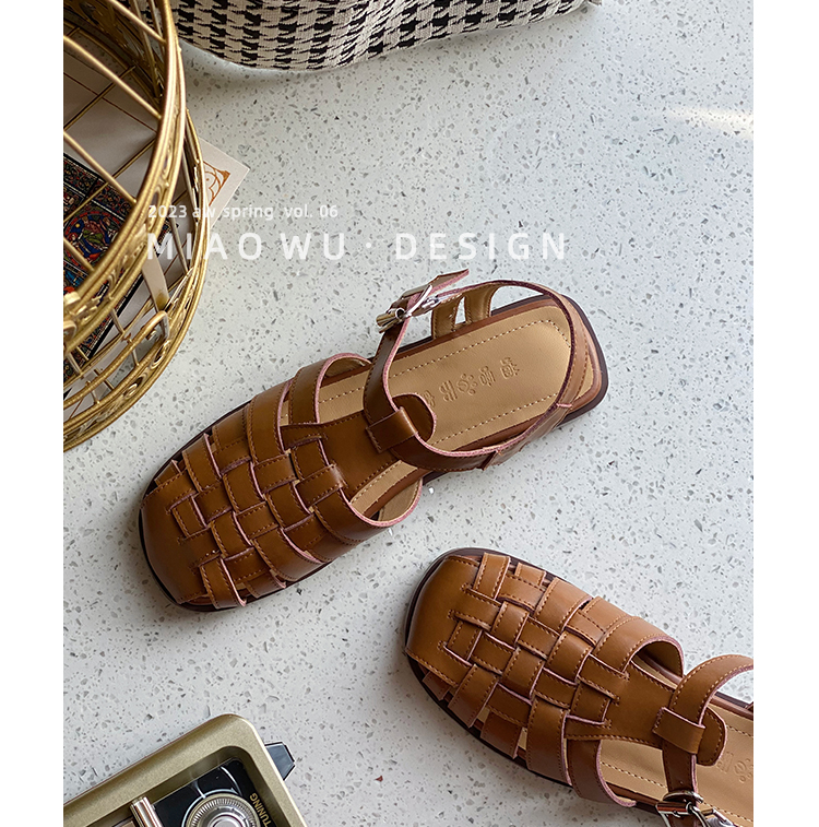喵唔的天空包头罗马凉鞋女春夏编织平底一字扣镂空通勤沙滩鞋