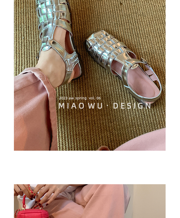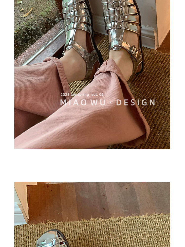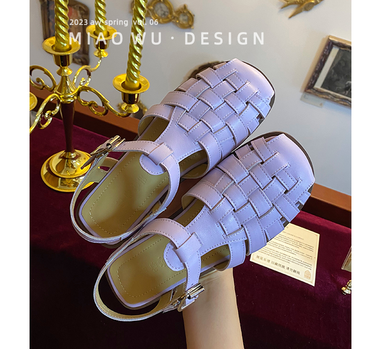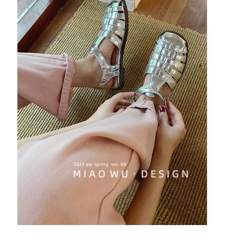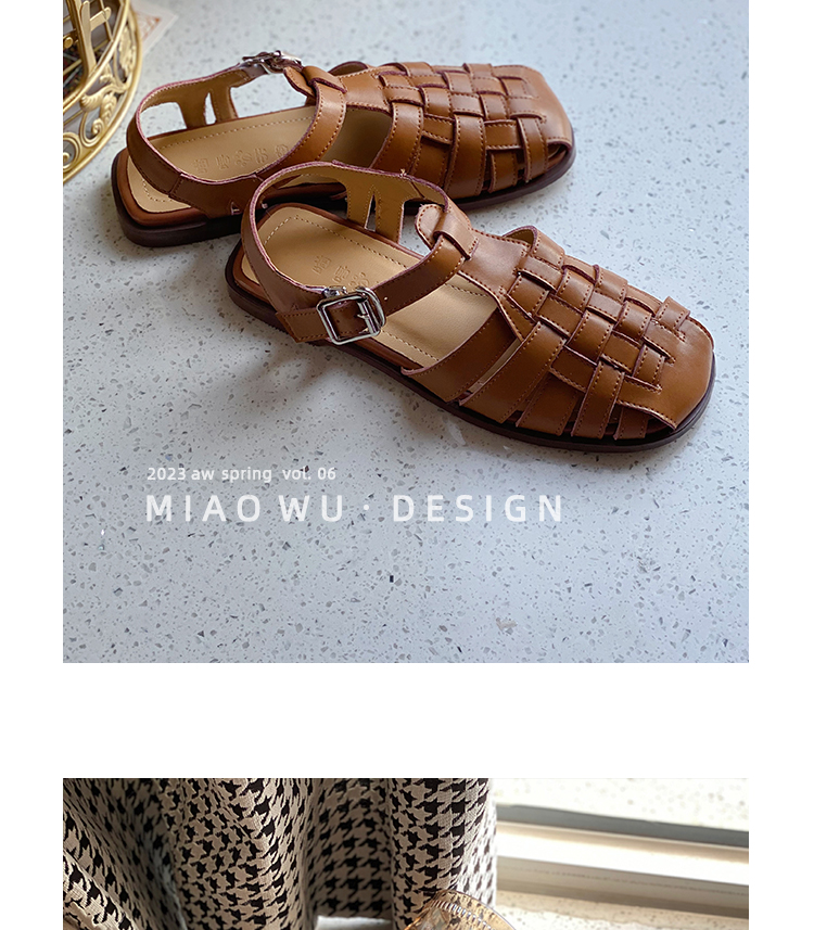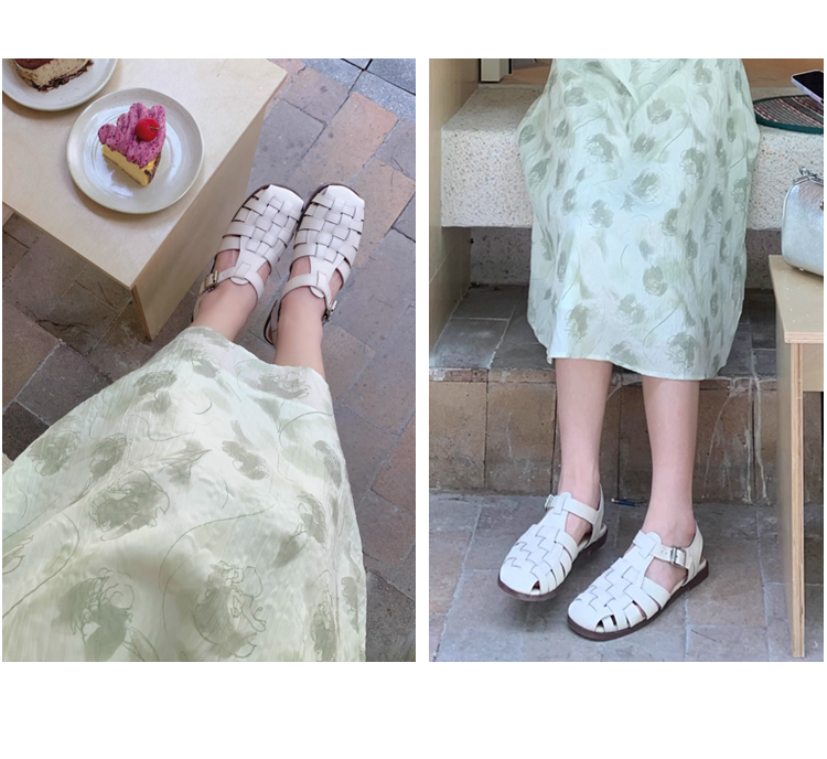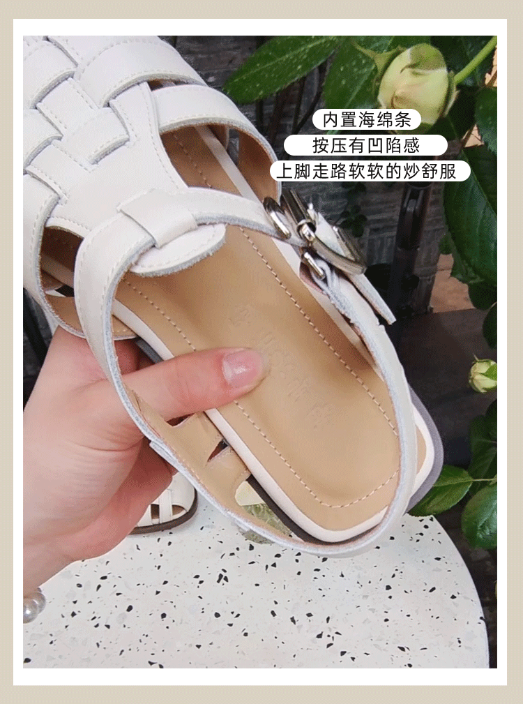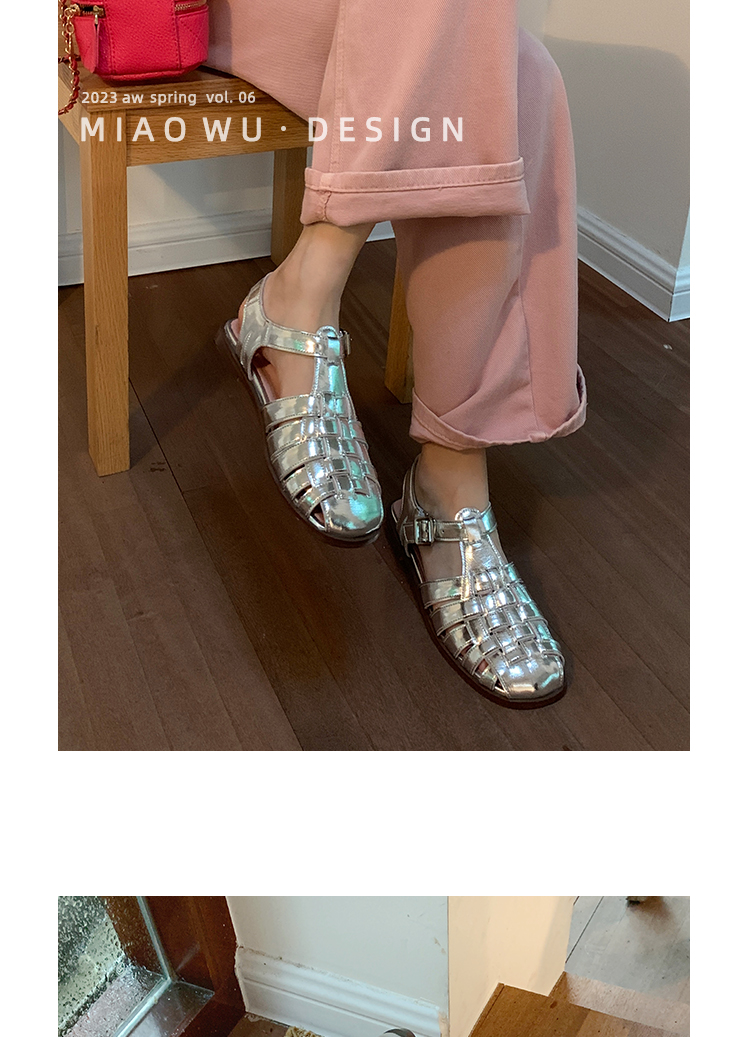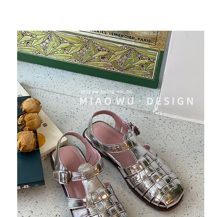 喵唔的天空包头罗马凉鞋女春夏编织平底一字扣镂空通勤沙滩鞋