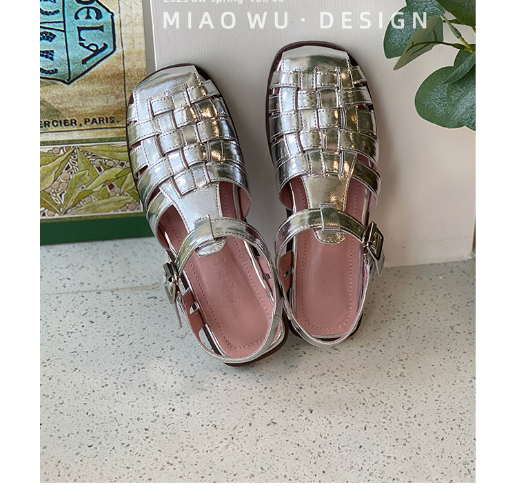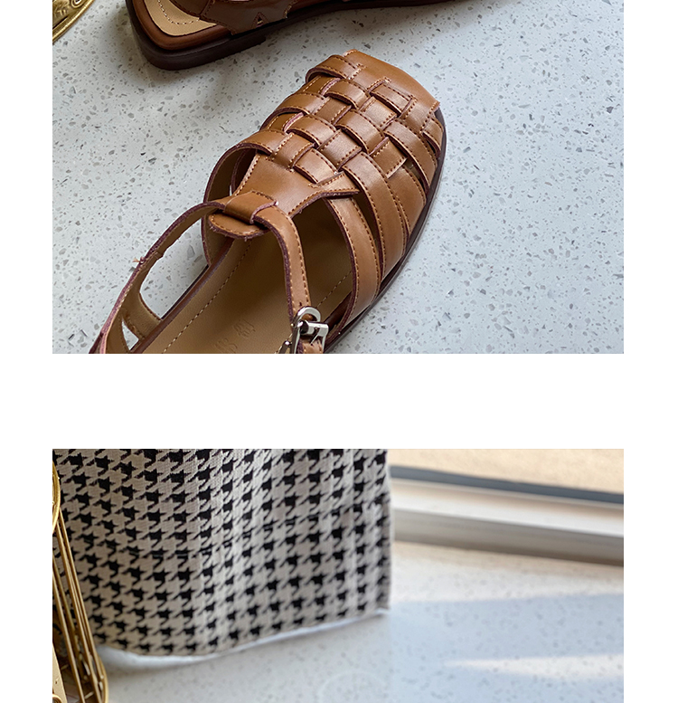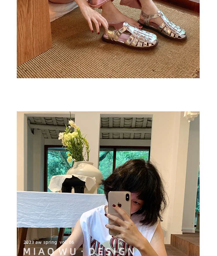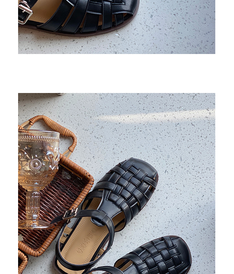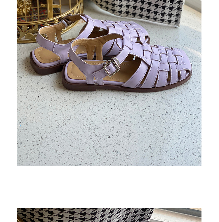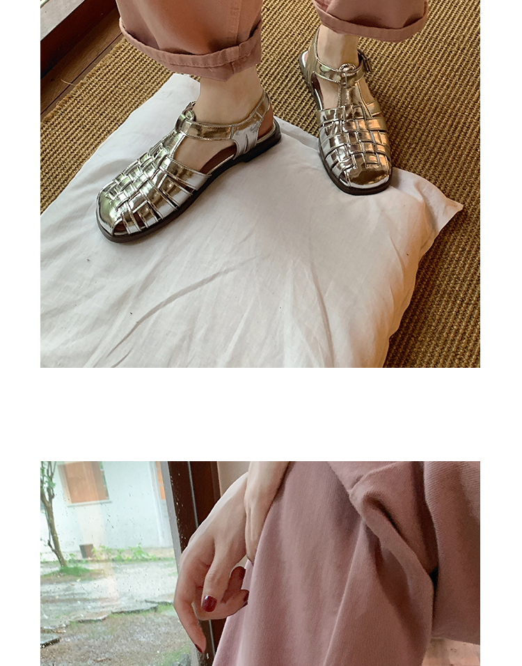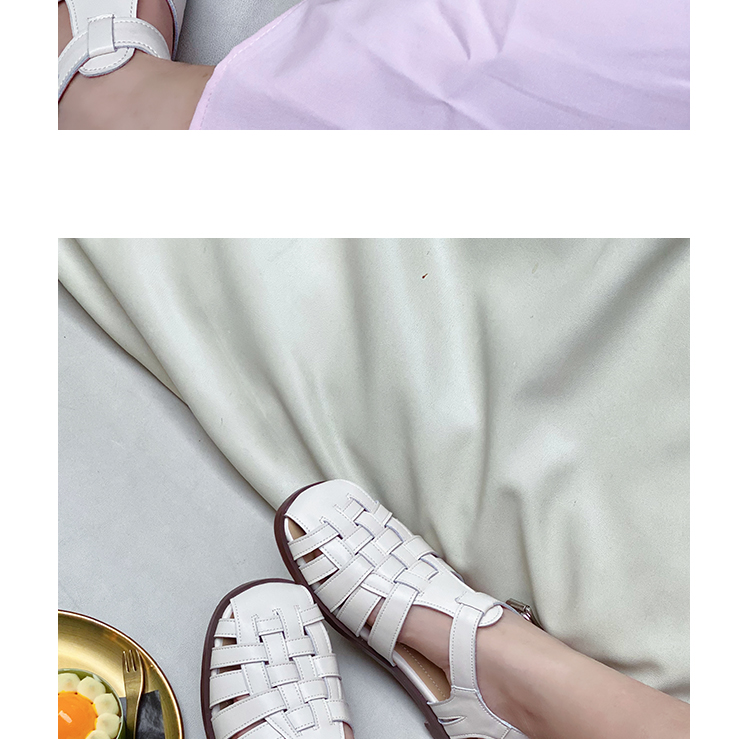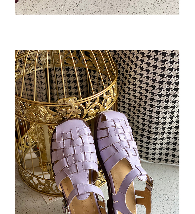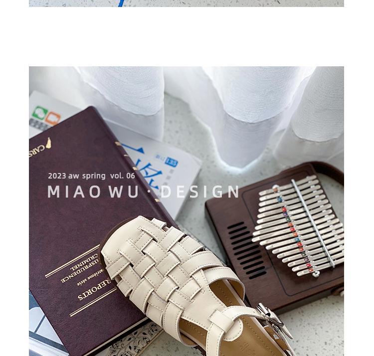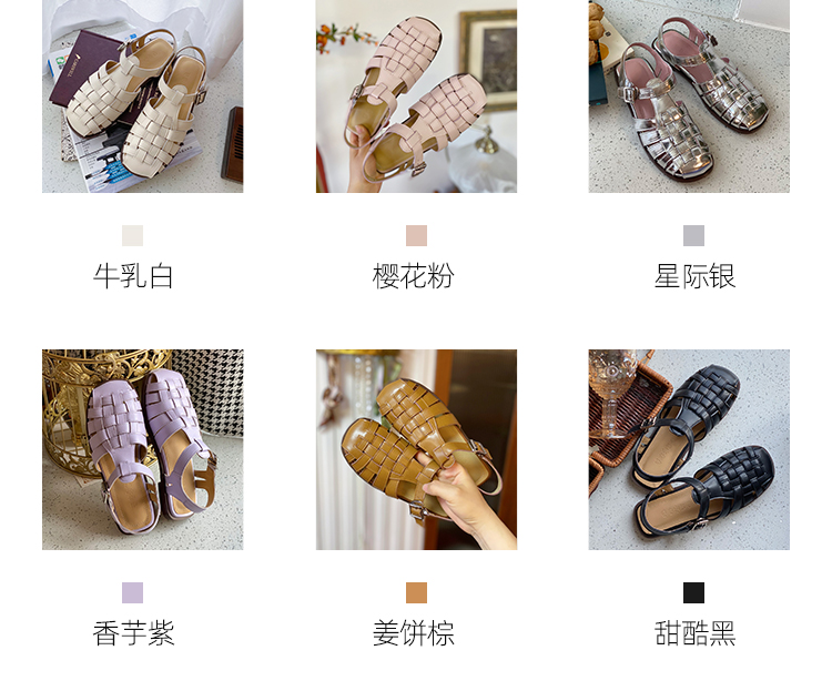 喵唔的天空包头罗马凉鞋女春夏编织平底一字扣镂空通勤沙滩鞋