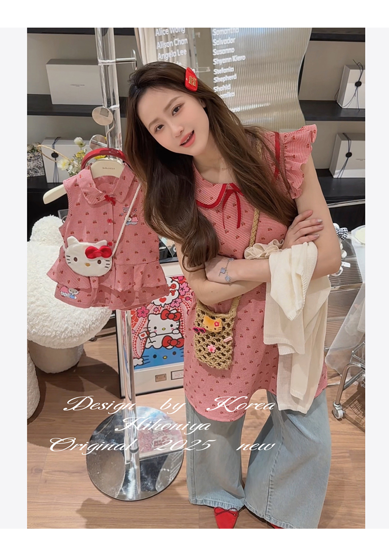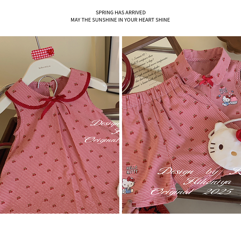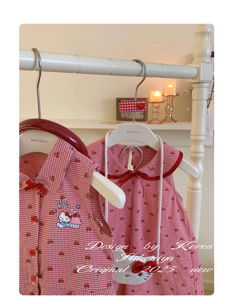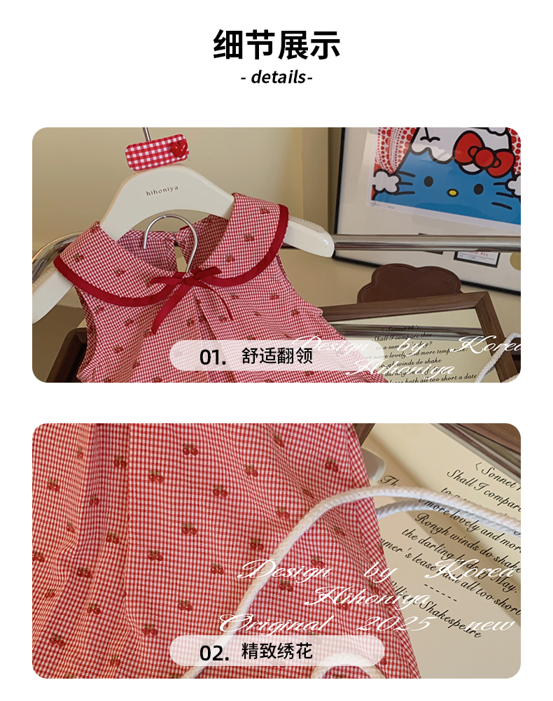 Spring韩国童装2025夏季新款亲子红格小樱桃连衣裙套装女童套装裙