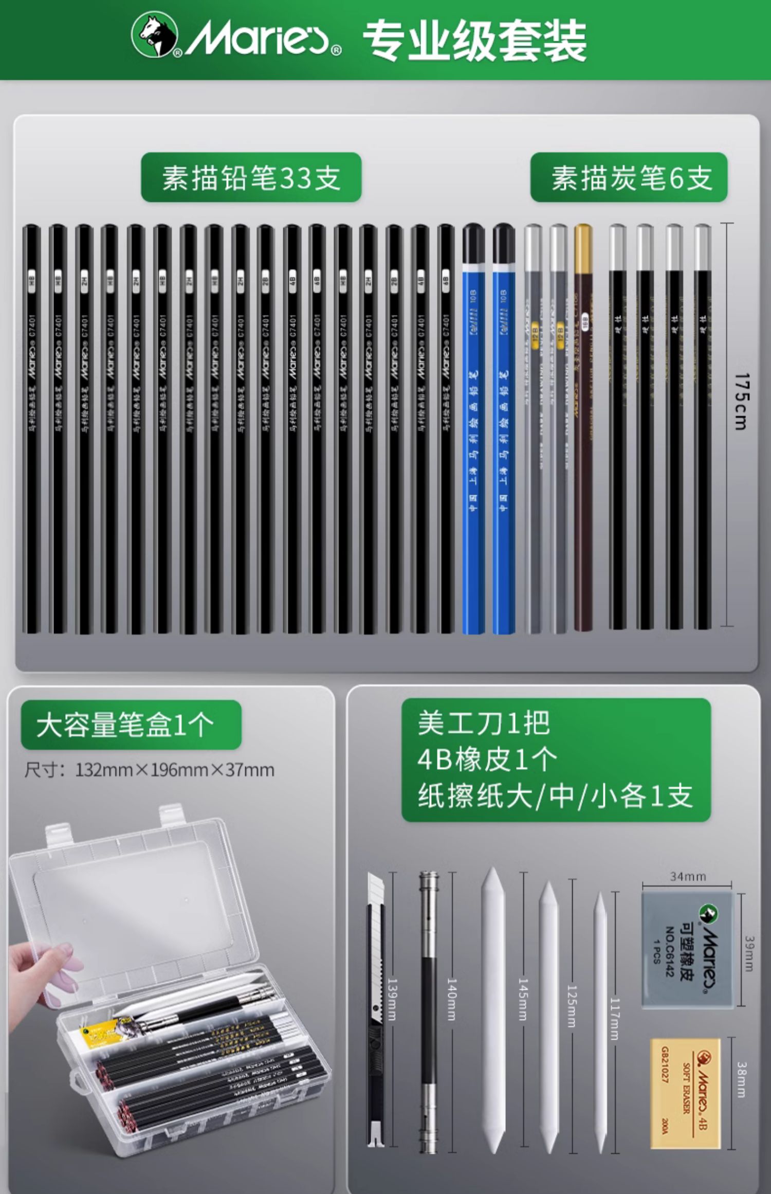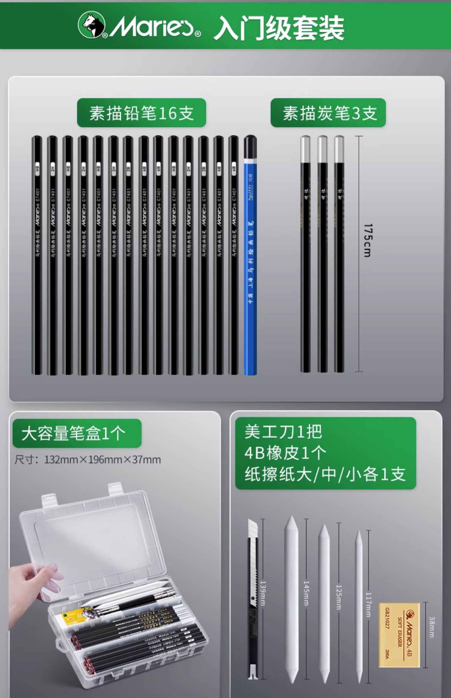 马利素描工具套装全套初学者入门铅笔素描软炭笔套装美术生专用速写素描炭笔学生专用绘画专业用品2b铅笔碳笔