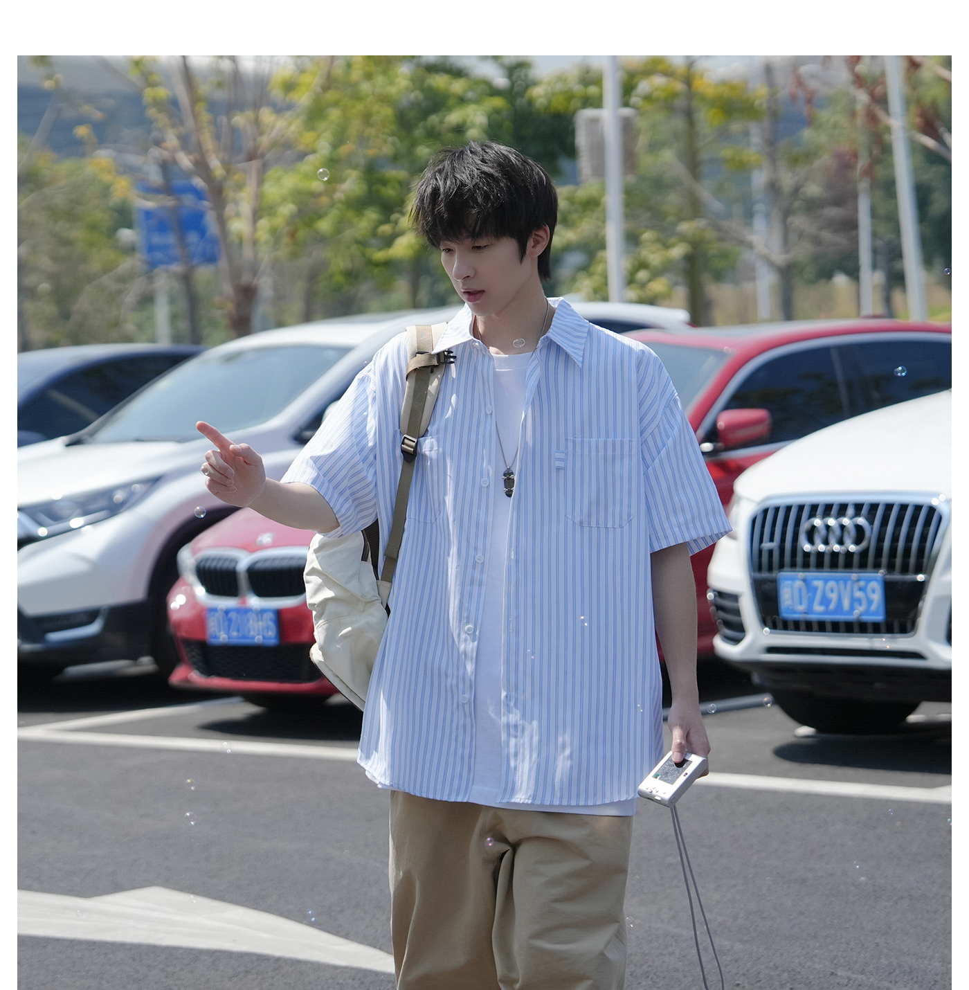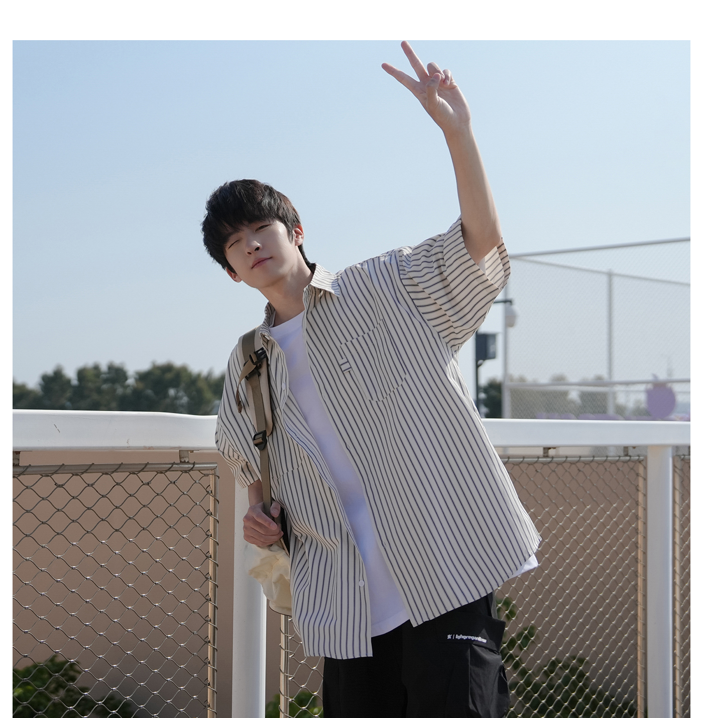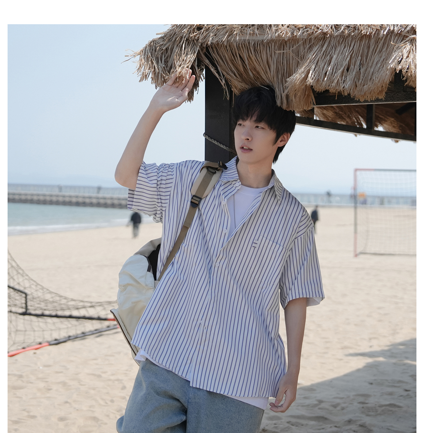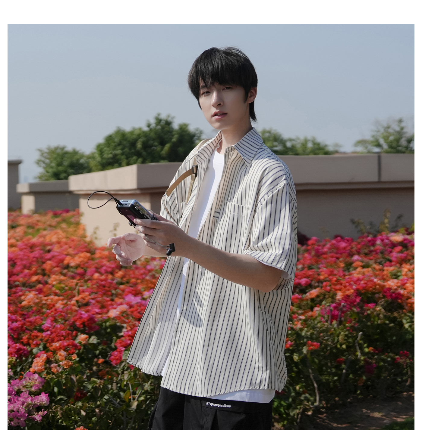 @港仔文艺男 日系竖条纹短袖衬衫男款夏季少年感翻领半袖衬衣外套