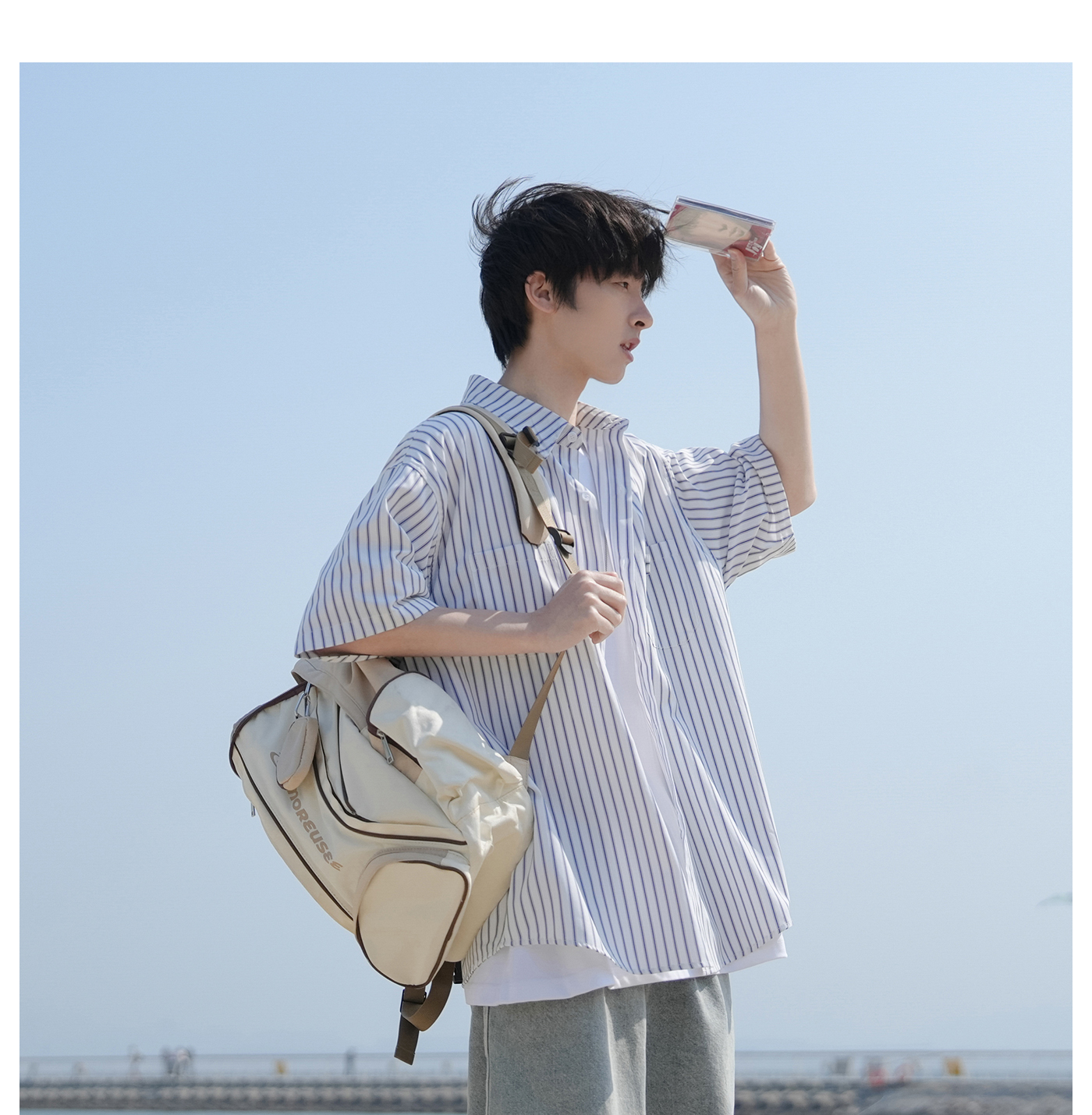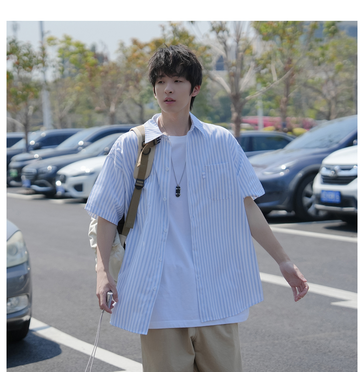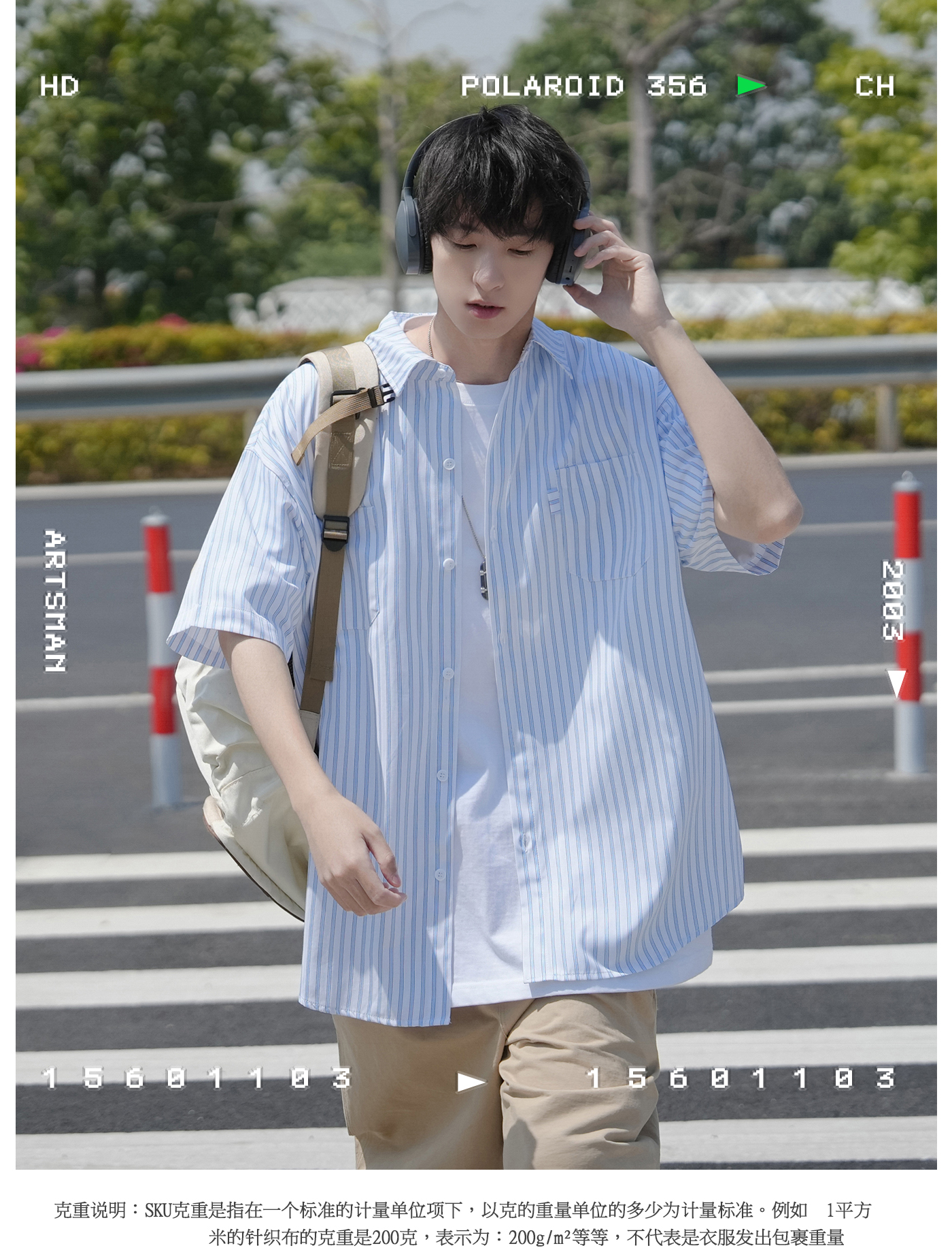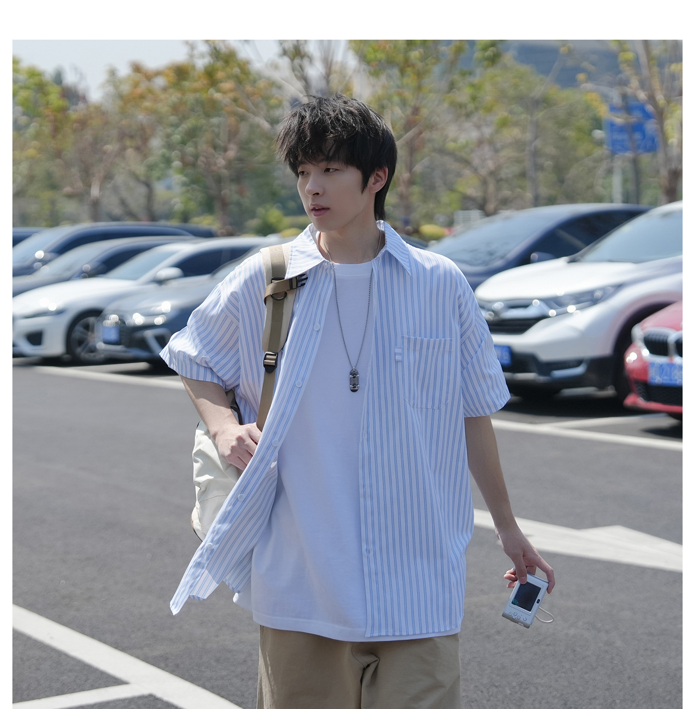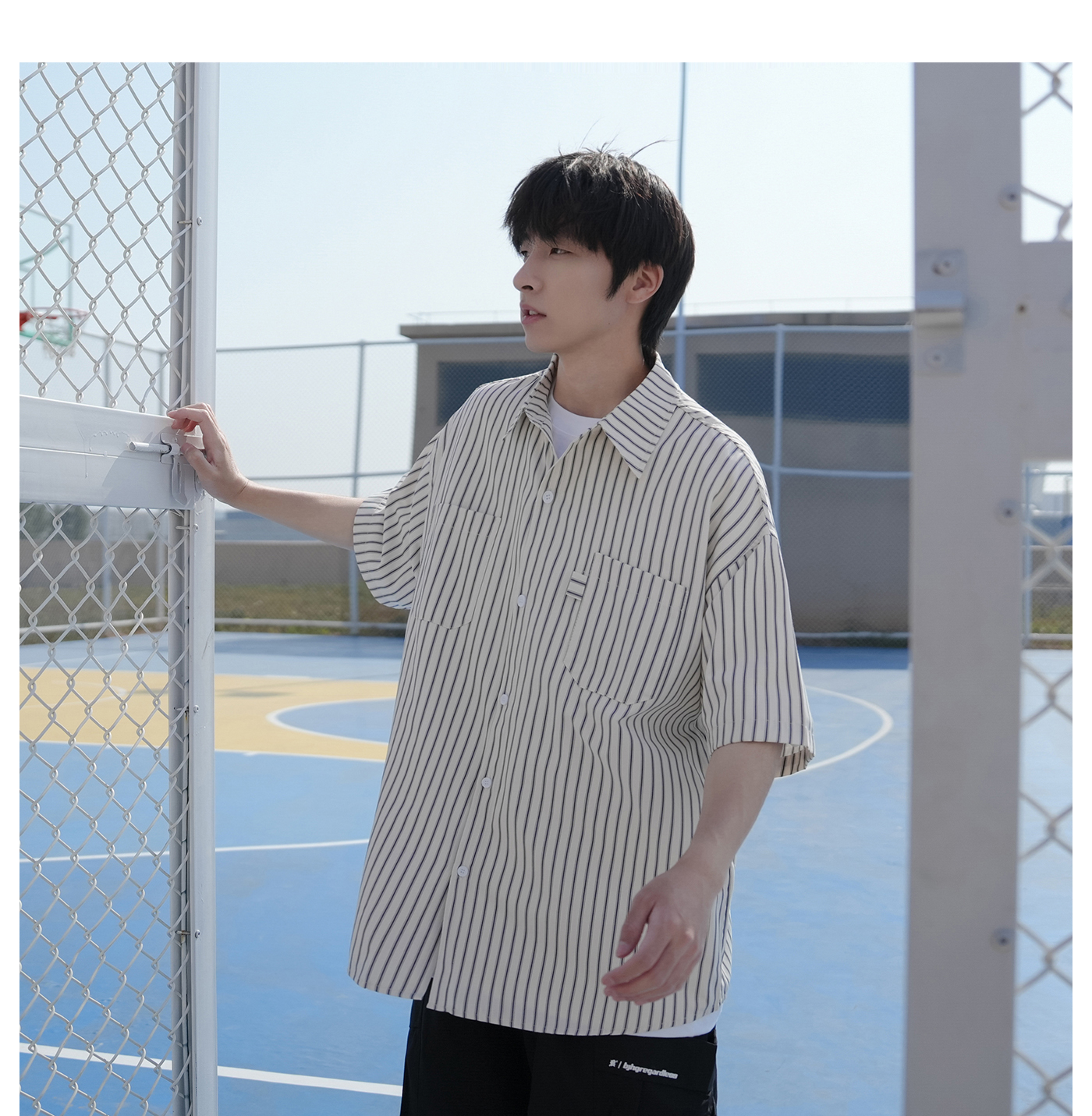 @港仔文艺男 日系竖条纹短袖衬衫男款夏季少年感翻领半袖衬衣外套