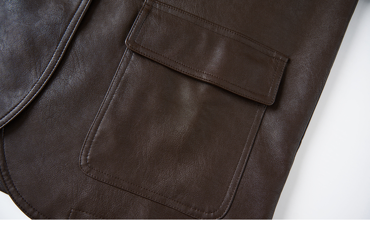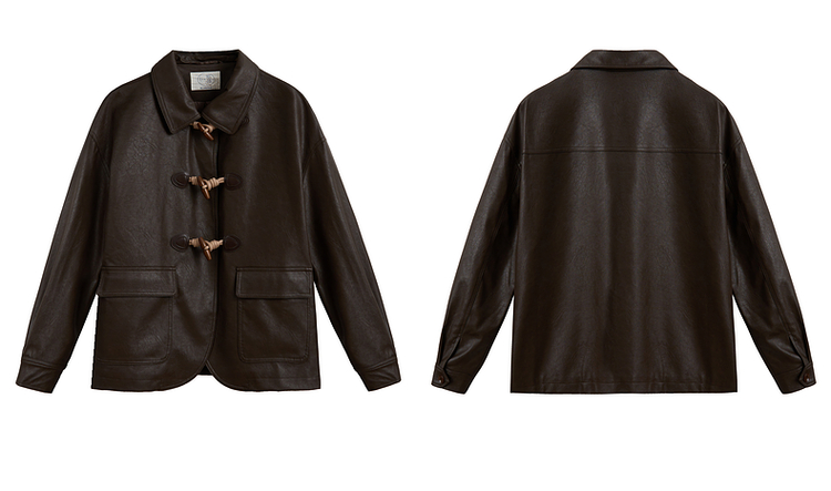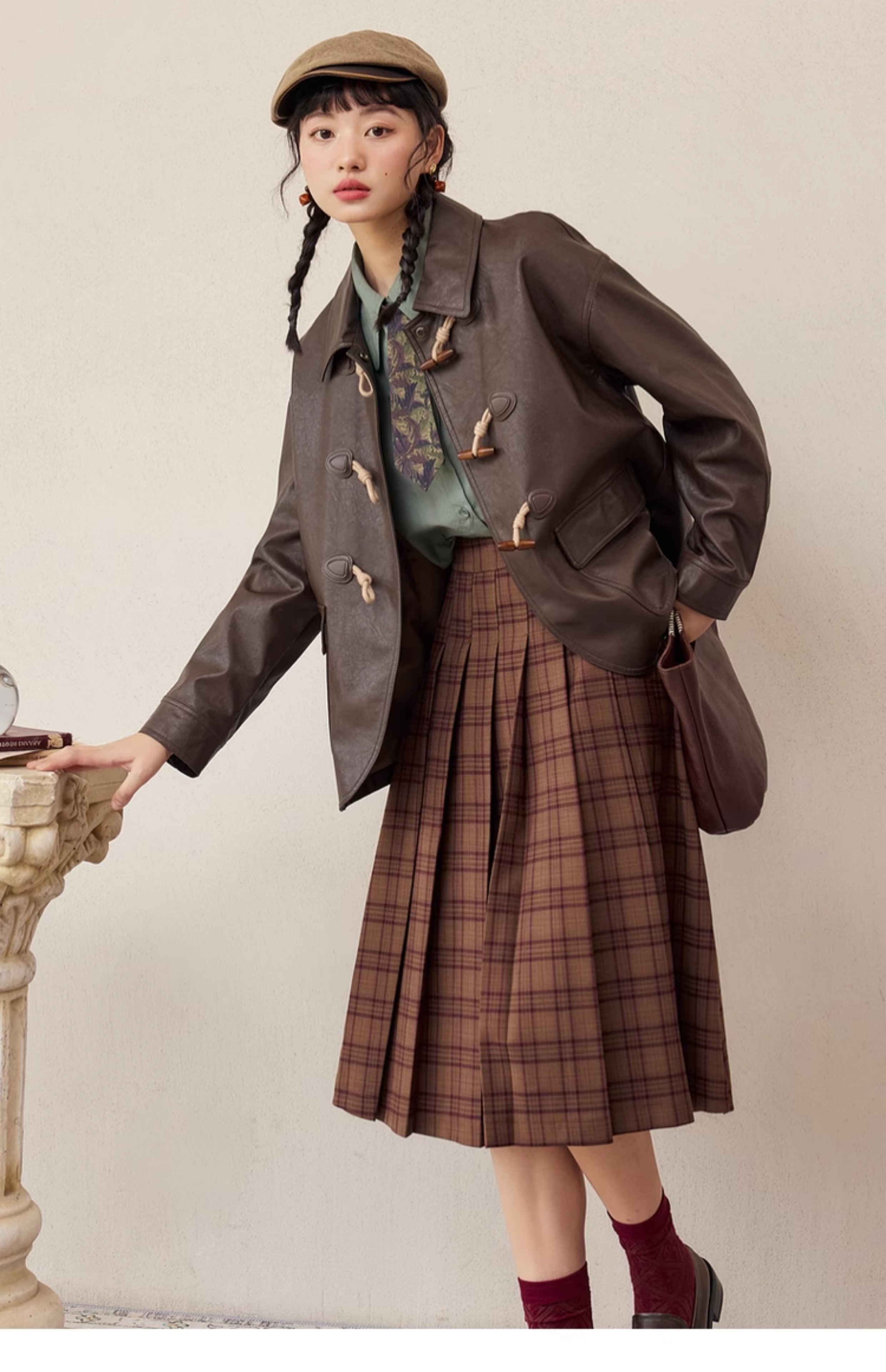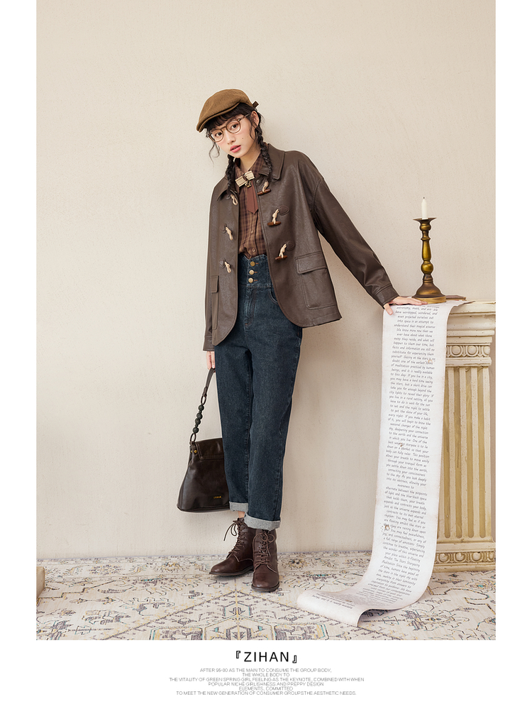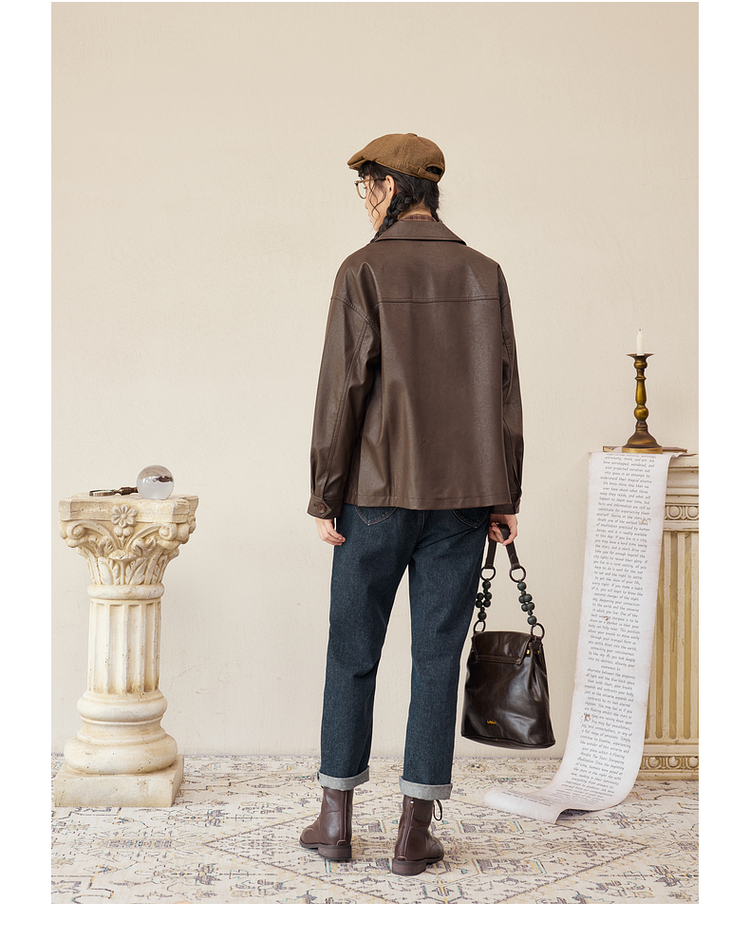 紫涵复古落肩袖皮衣女仿皮上衣秋季新款通勤文艺港风牛角扣外套
