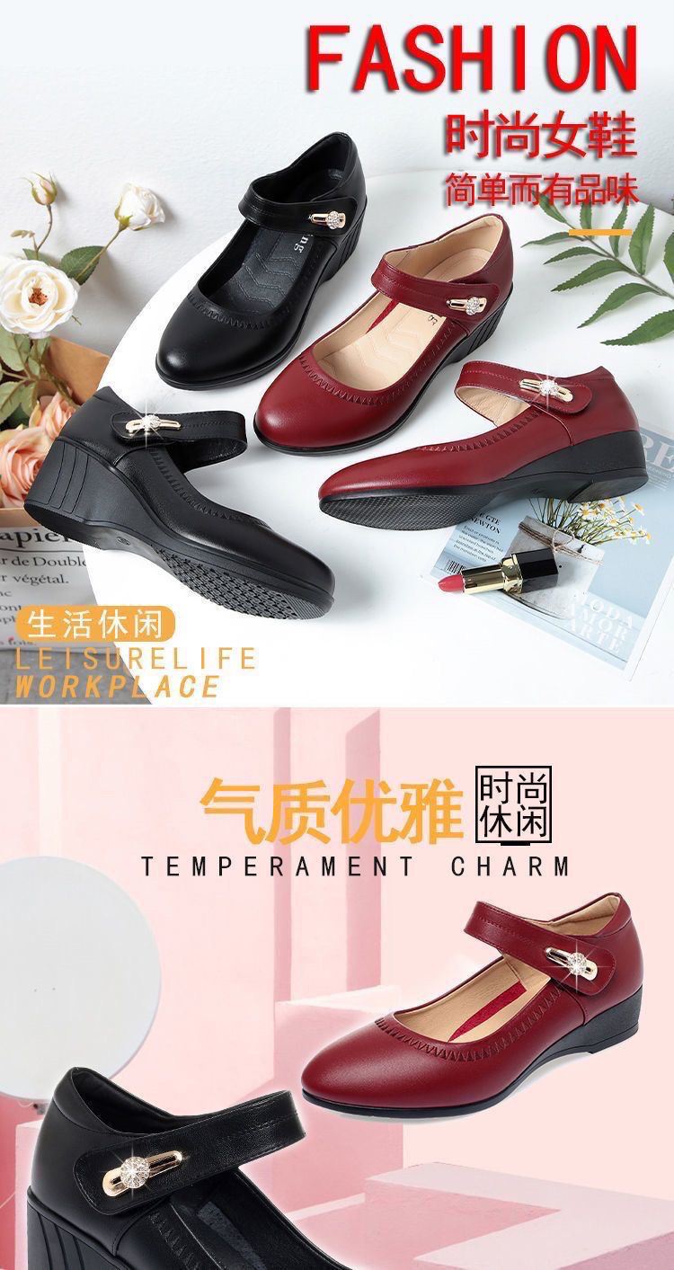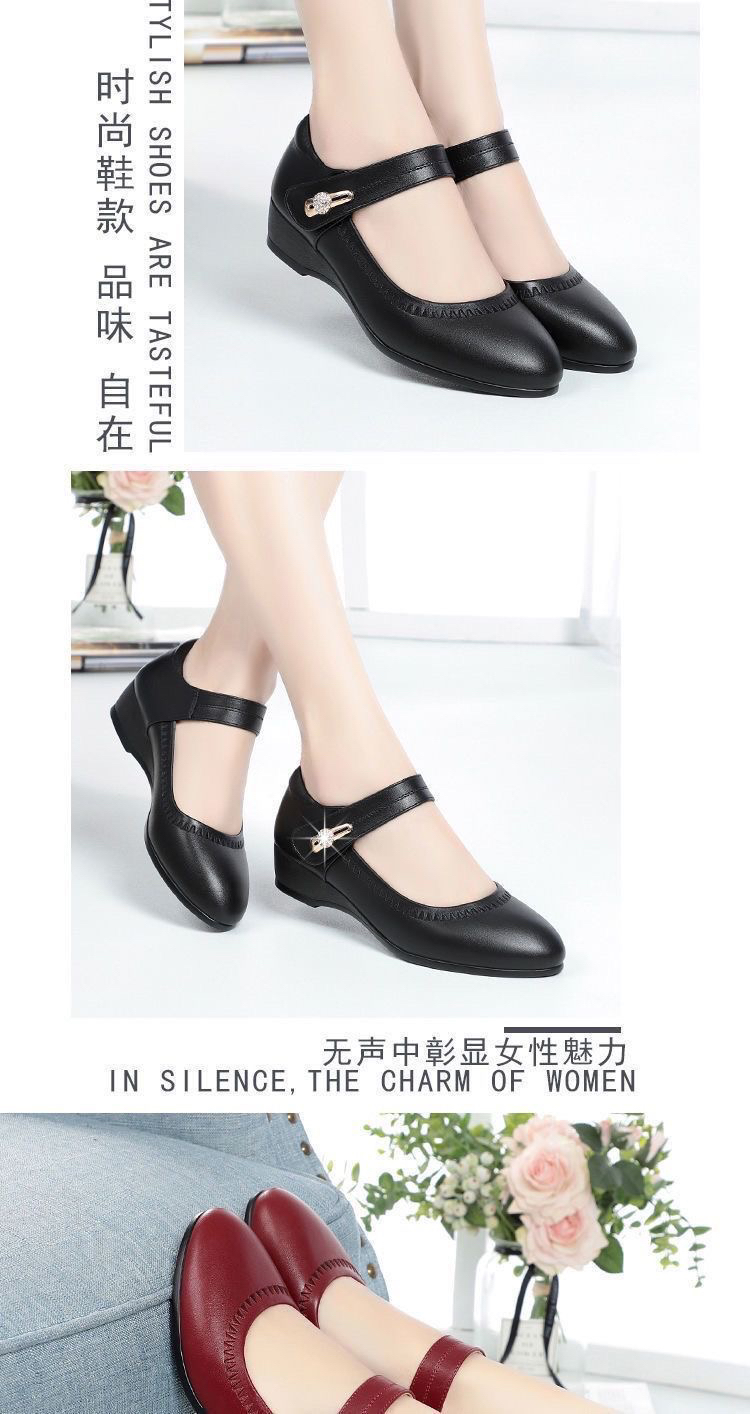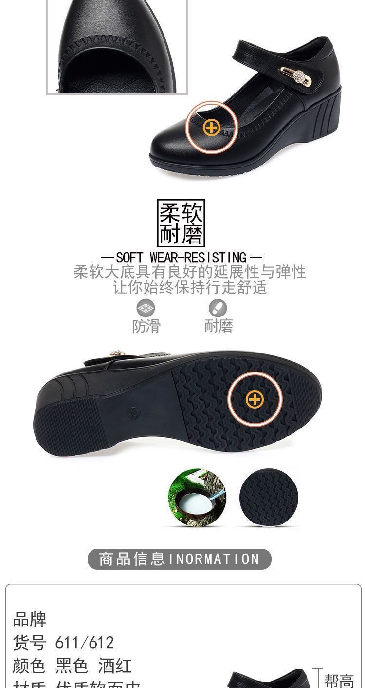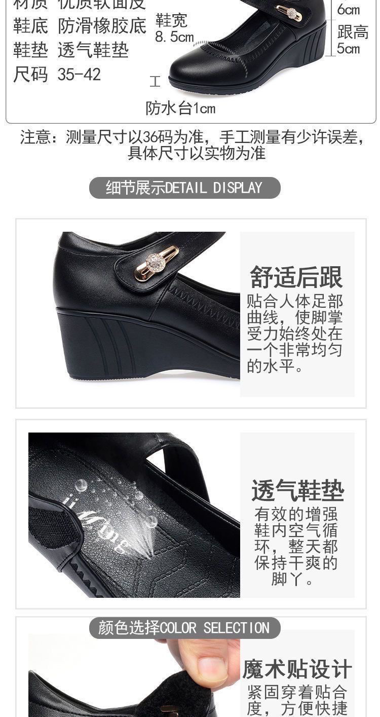 红青蜓妈妈鞋舒适坡跟软底真皮春秋中老年单鞋大码魔术贴女士皮鞋