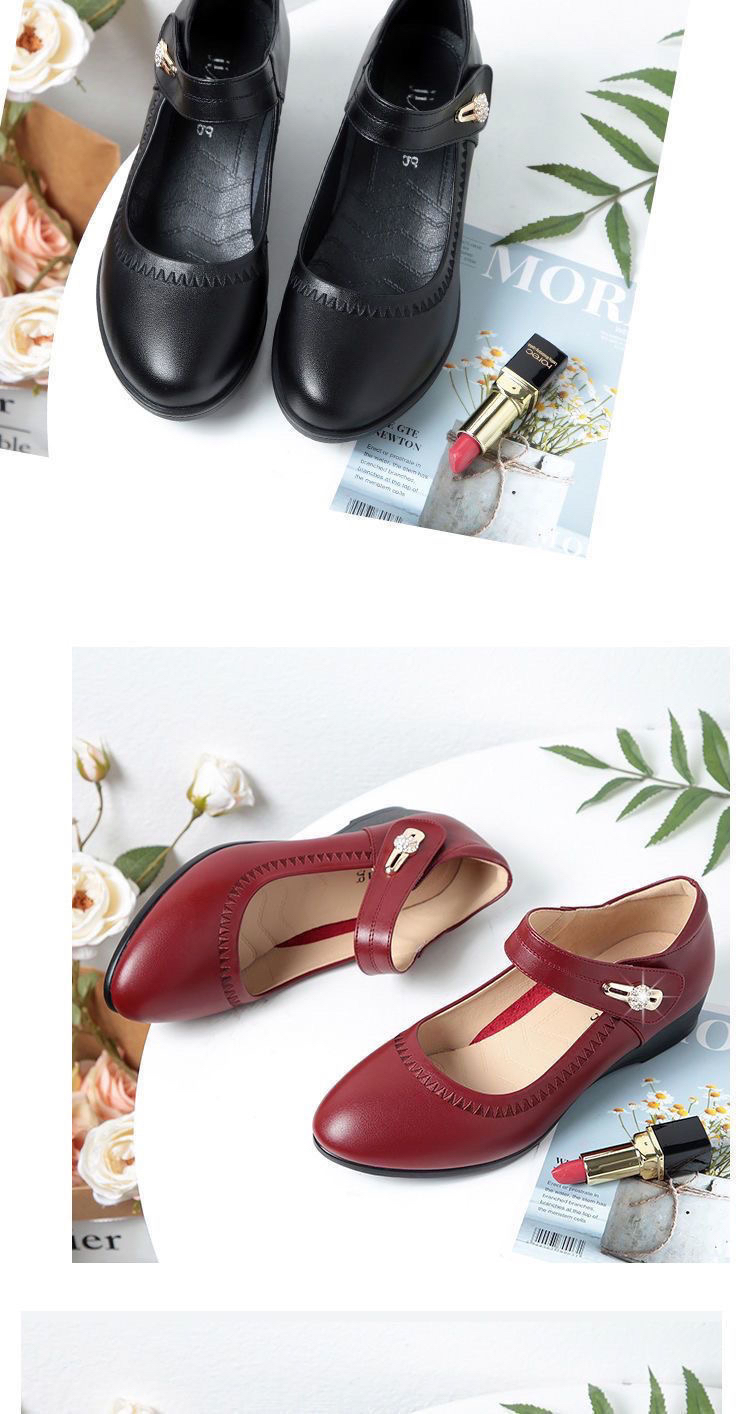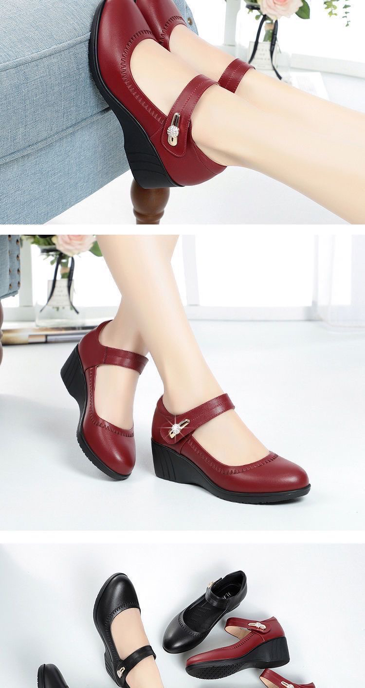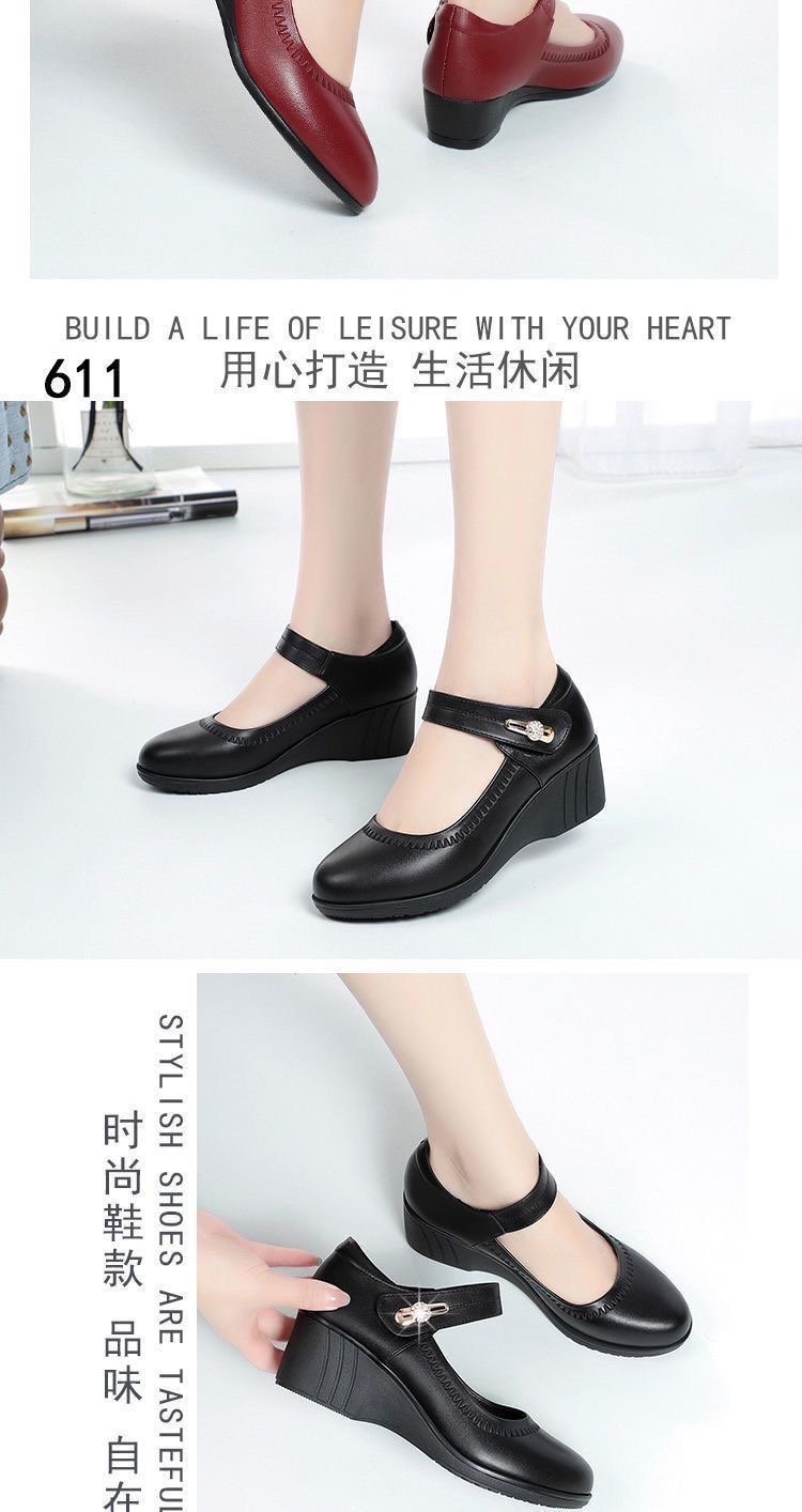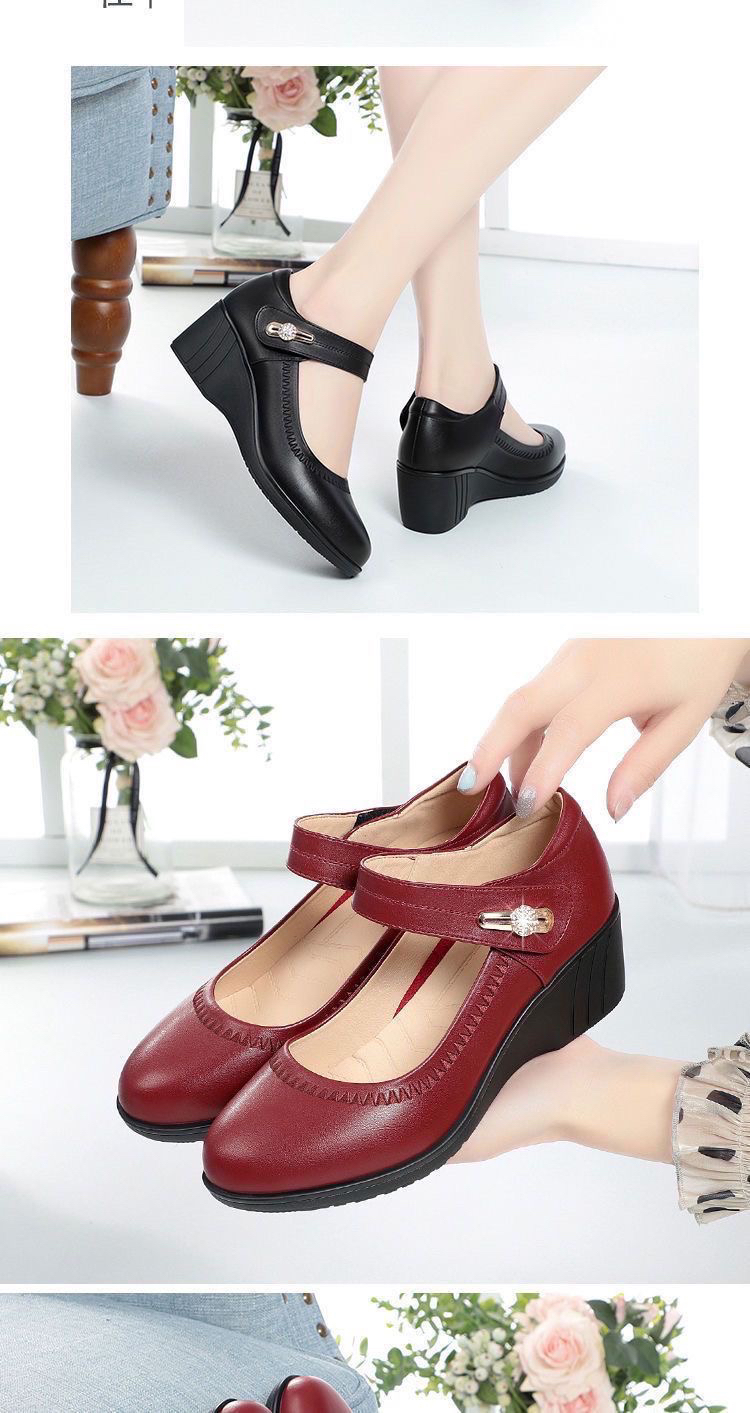 红青蜓妈妈鞋舒适坡跟软底真皮春秋中老年单鞋大码魔术贴女士皮鞋