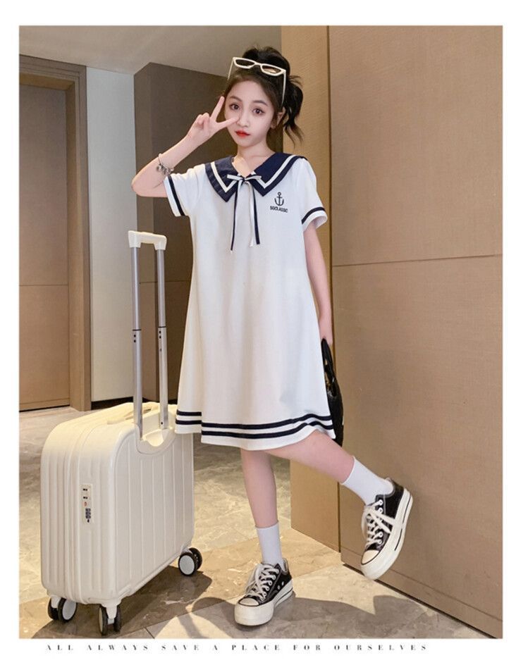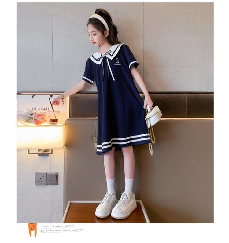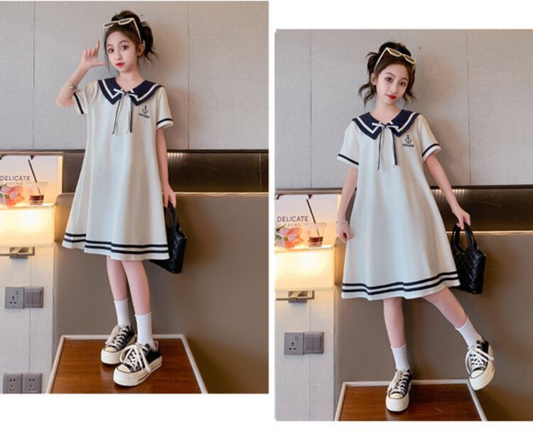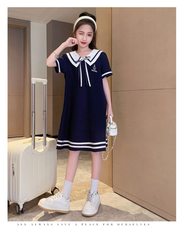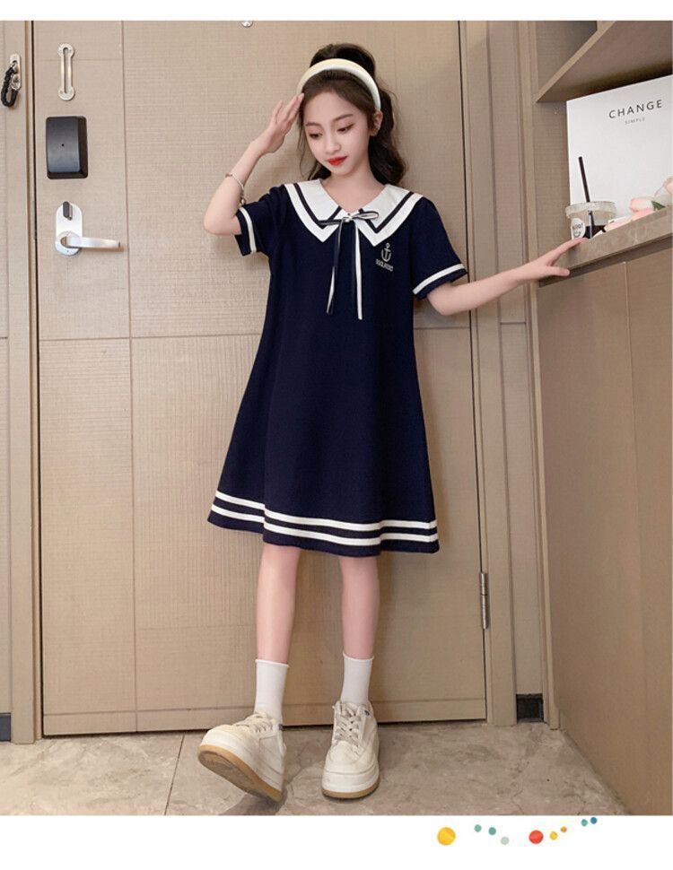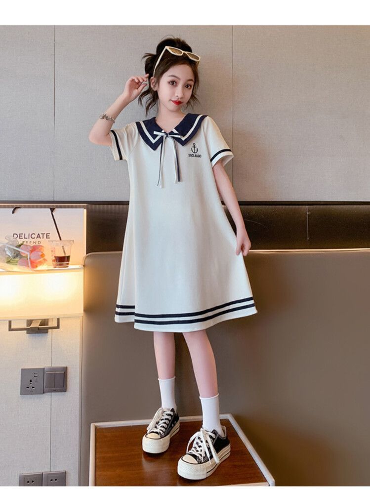 女孩子裙子夏季2025新款女大童装洋气显瘦学院风海军领学生连衣裙