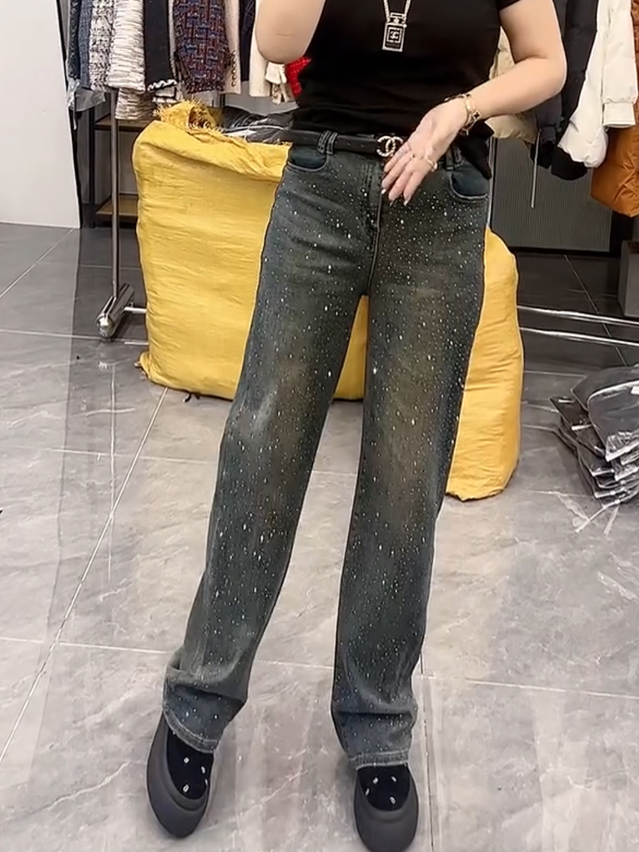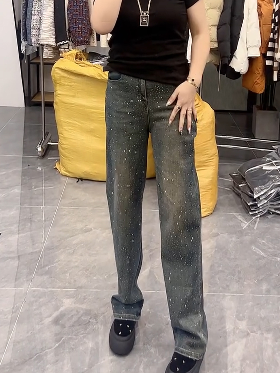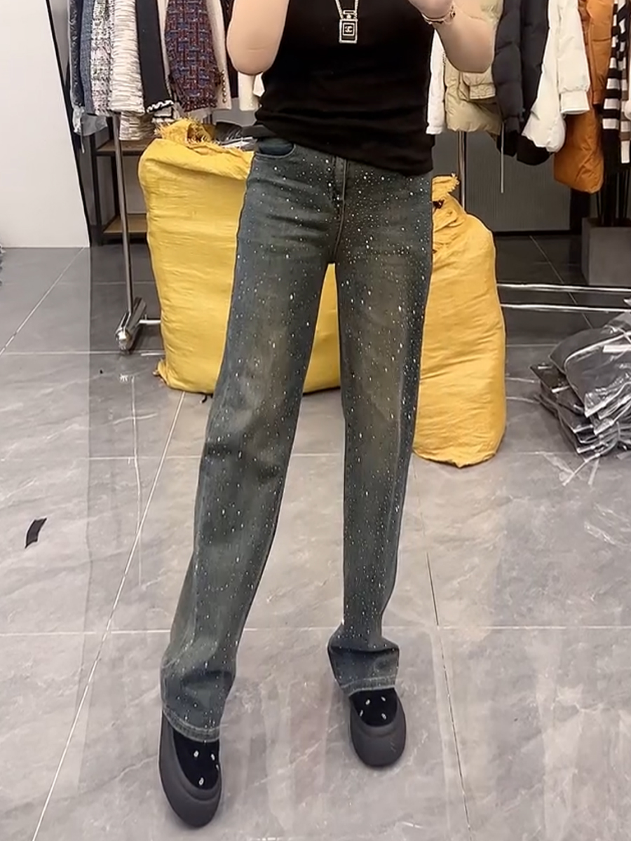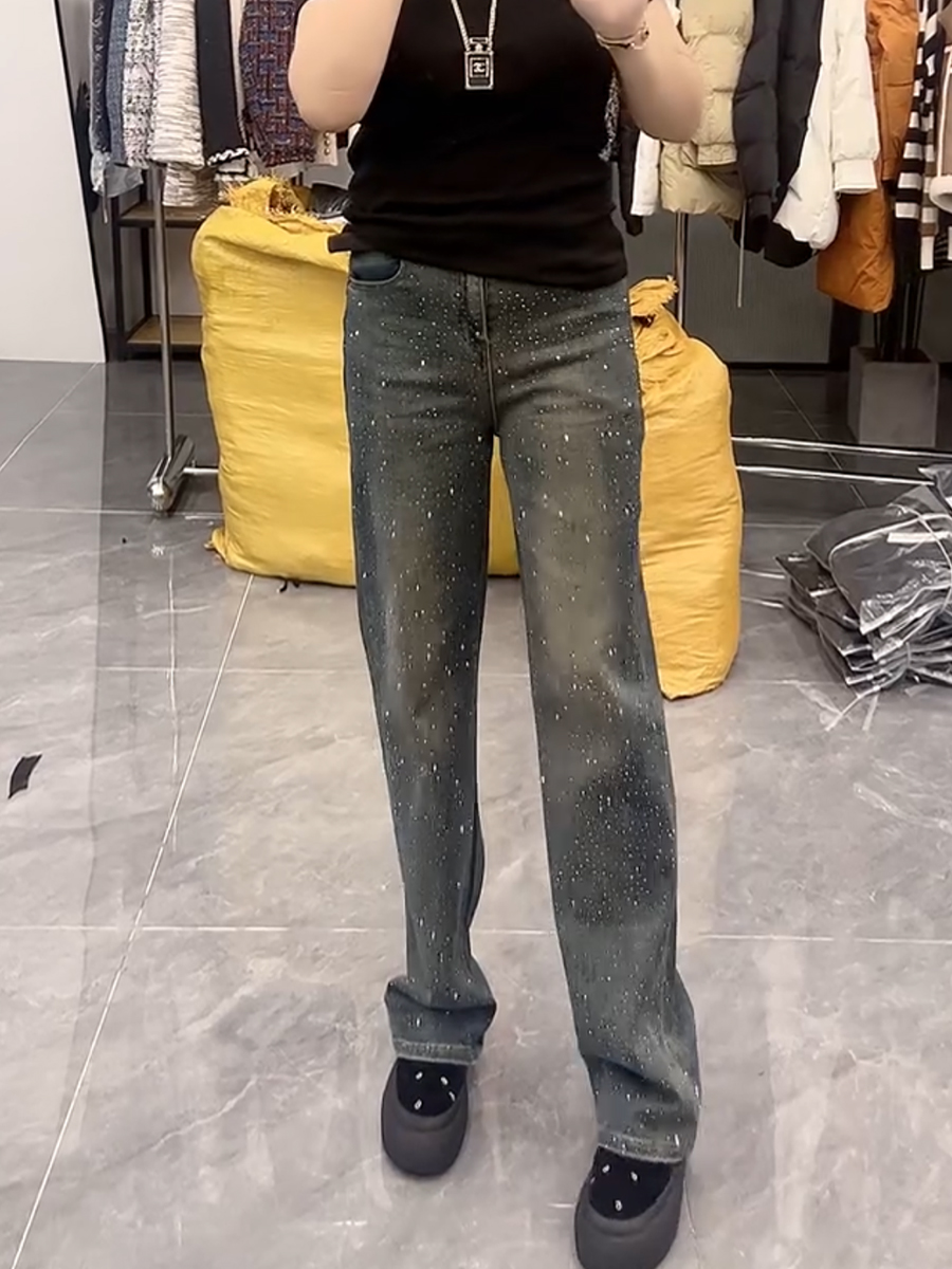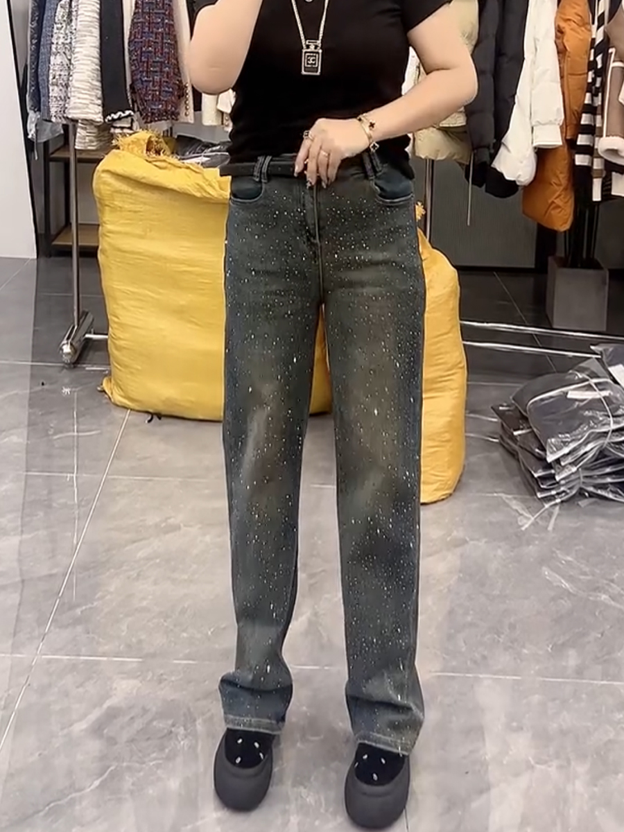 春季新款高腰弹力显瘦直筒牛仔裤大码百搭遮胯重工满天星阔腿裤子