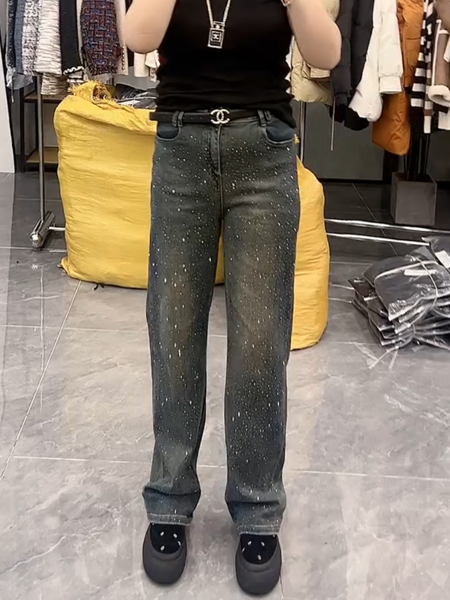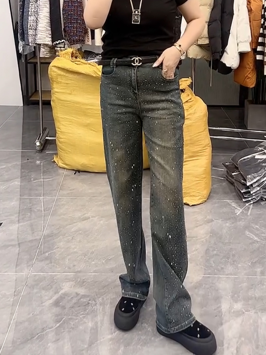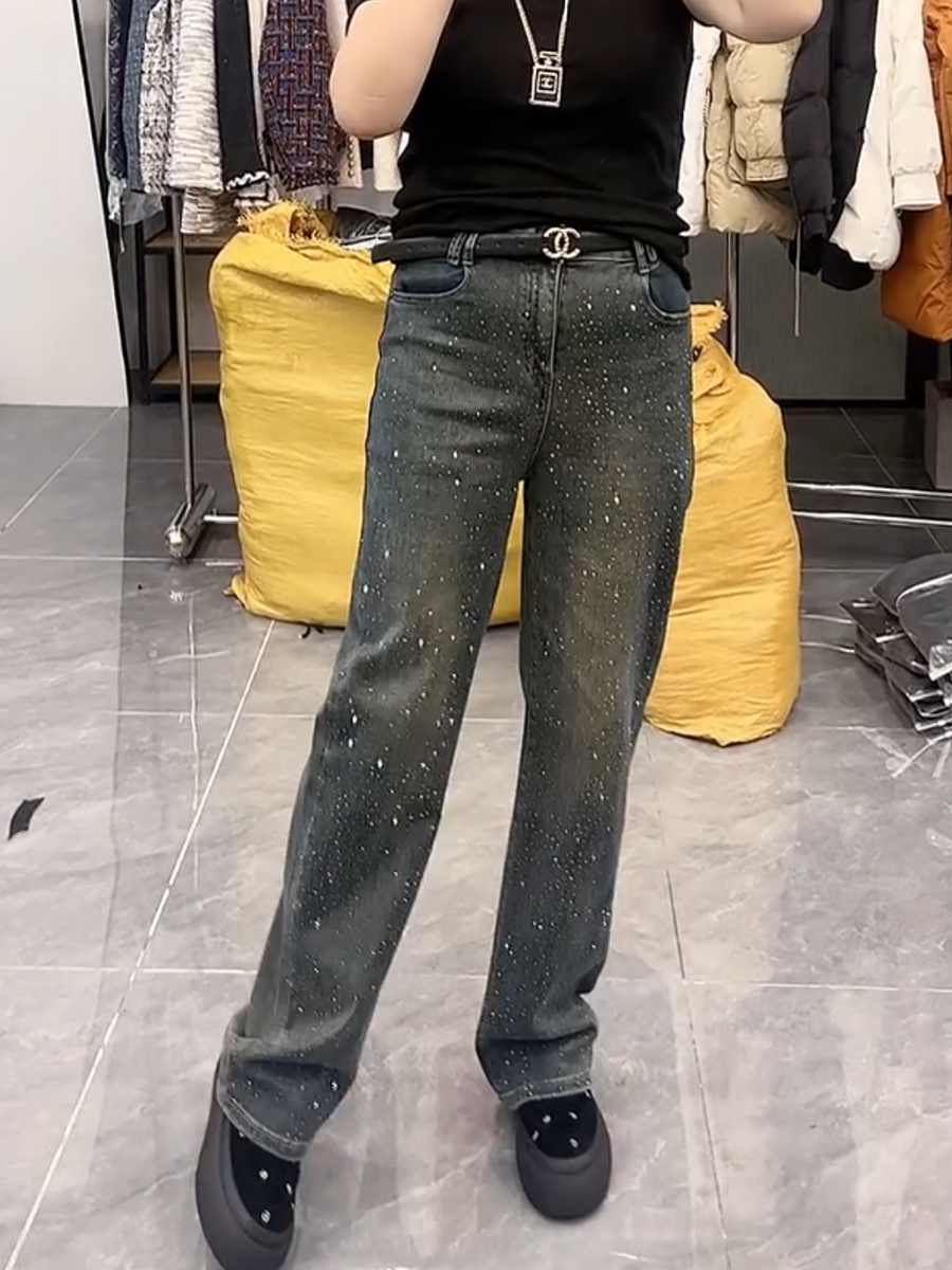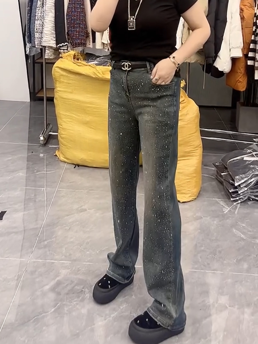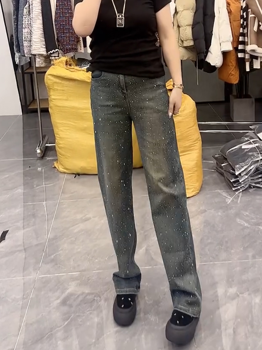 春季新款高腰弹力显瘦直筒牛仔裤大码百搭遮胯重工满天星阔腿裤子