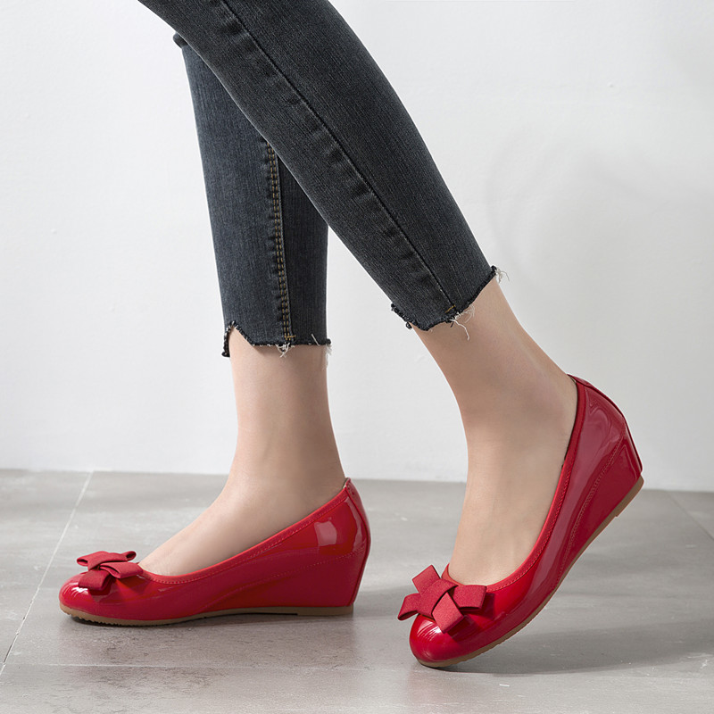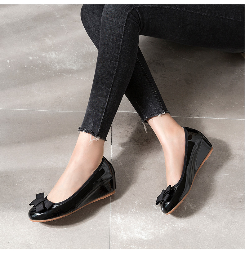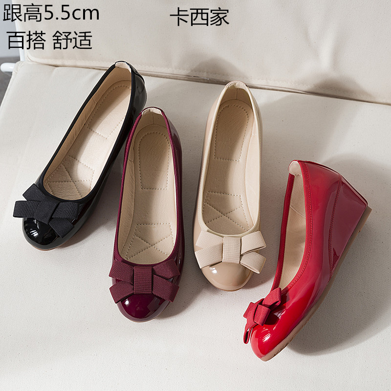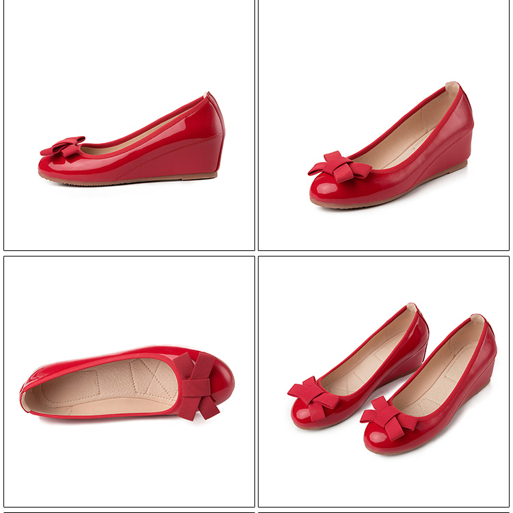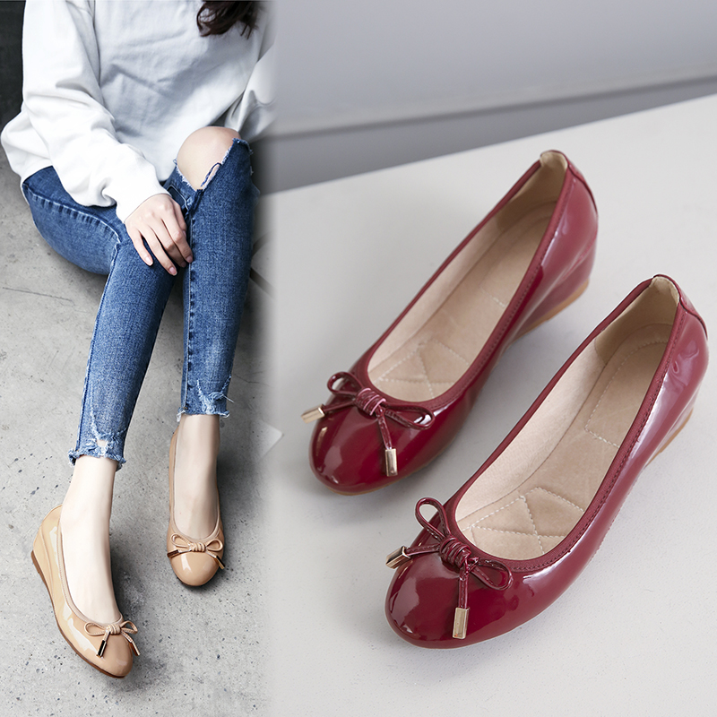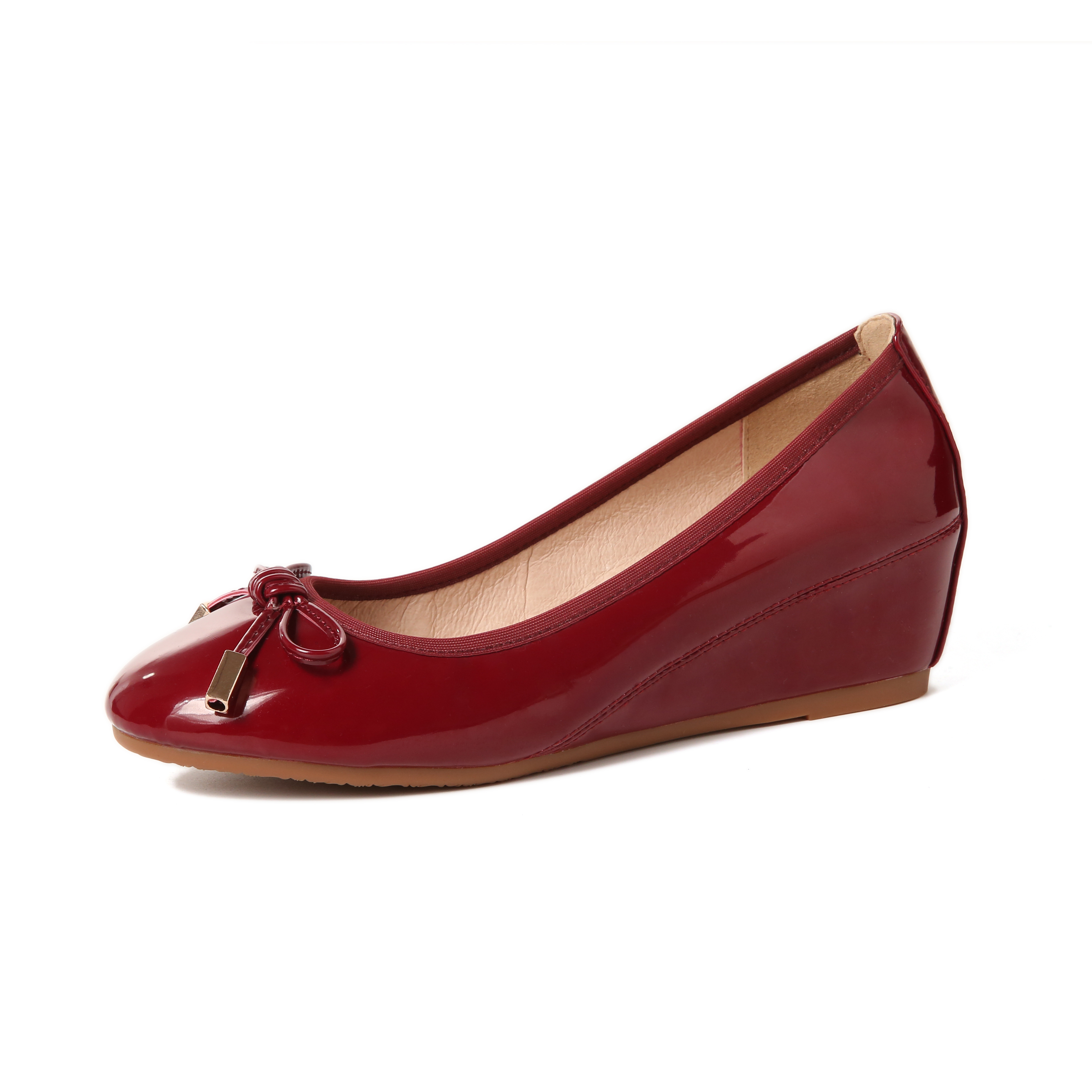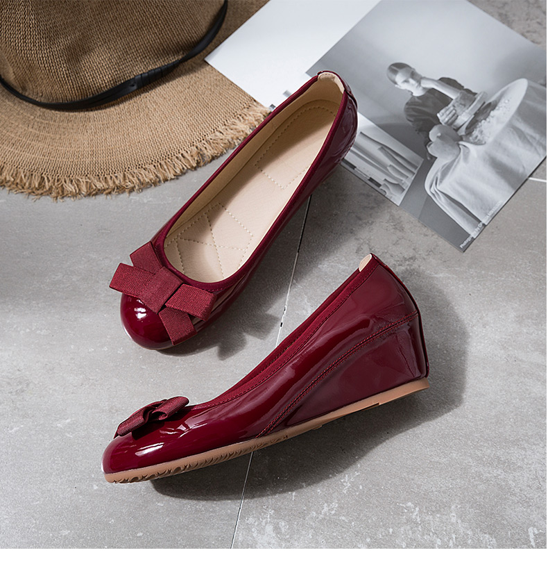 内增高坡跟软底鞋女中跟单鞋蝴蝶结真皮酒红色小码蛋卷豆豆鞋船鞋