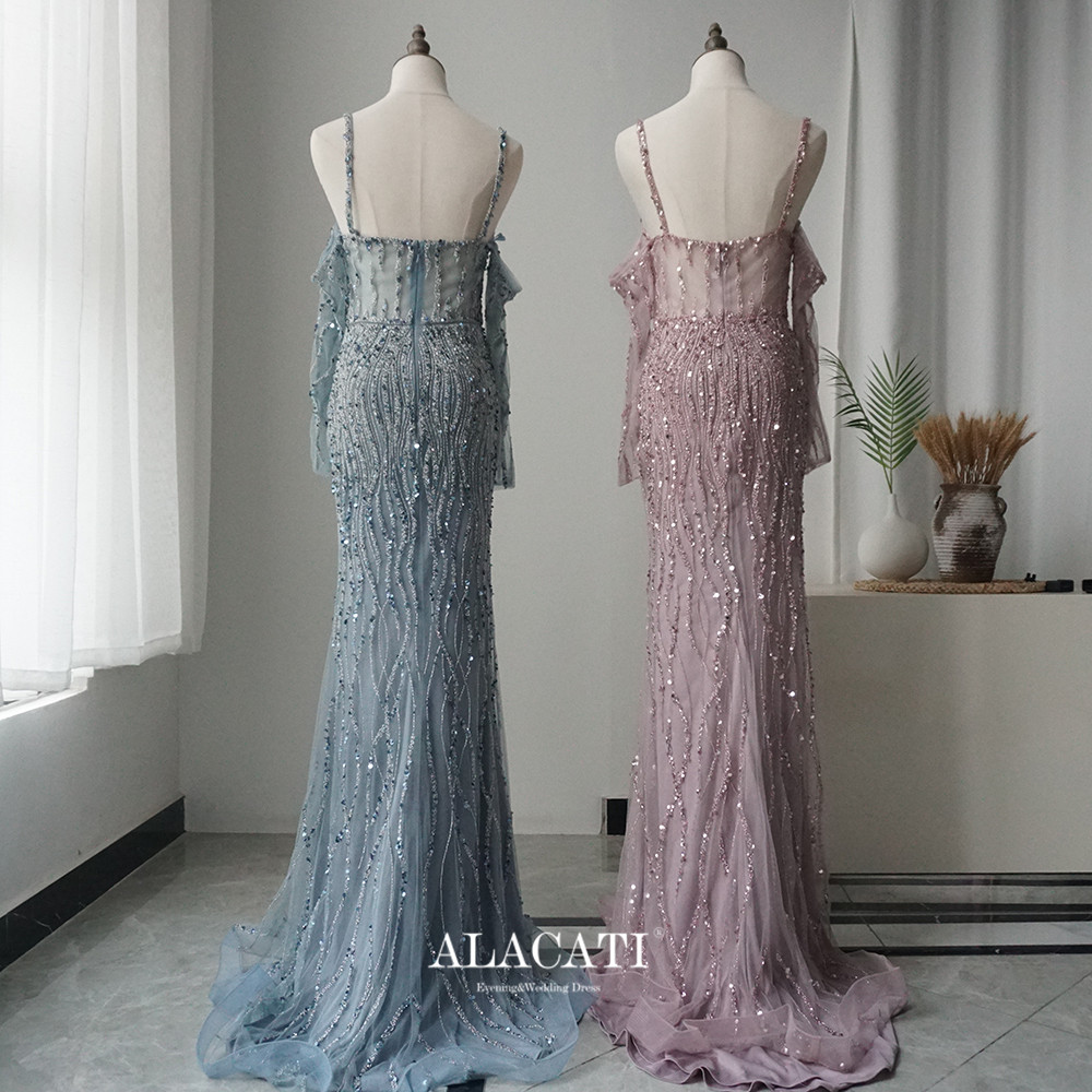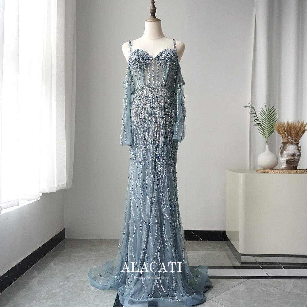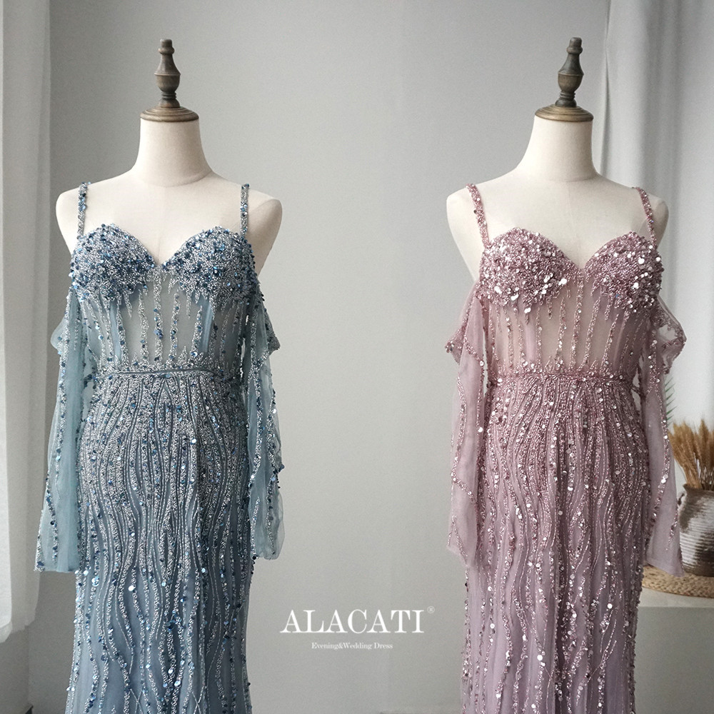 新款高端奢华时尚性感吊带长袖鱼尾显瘦晚礼服婚礼主持名媛演出口