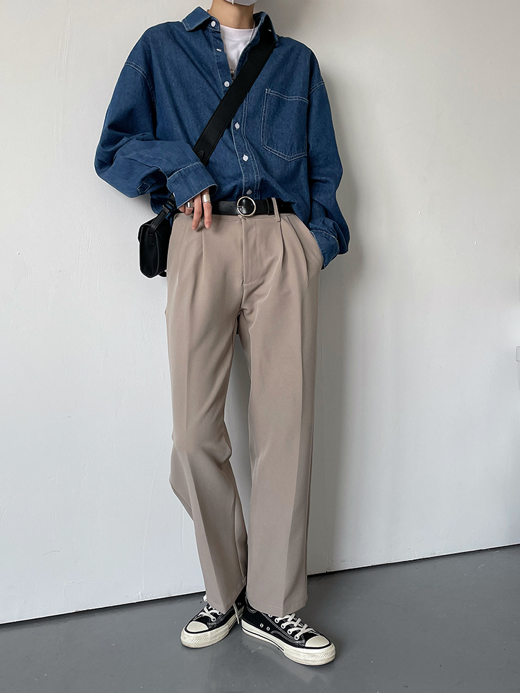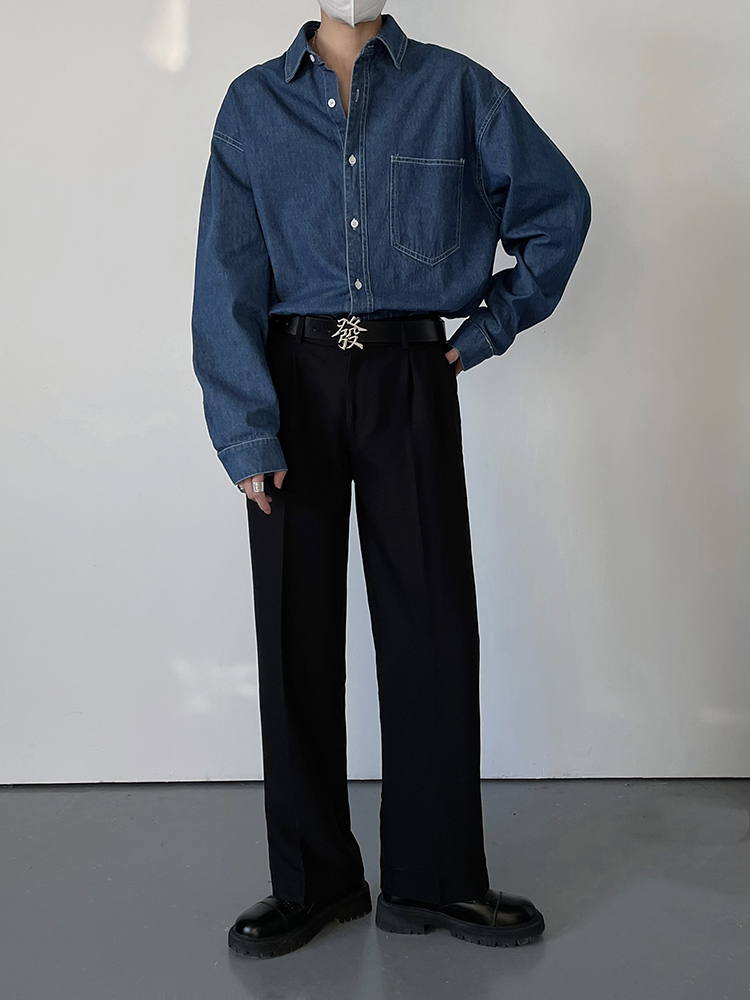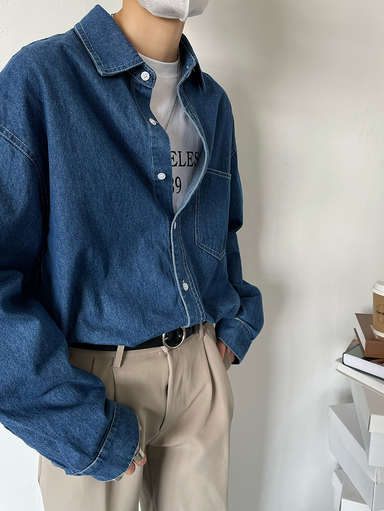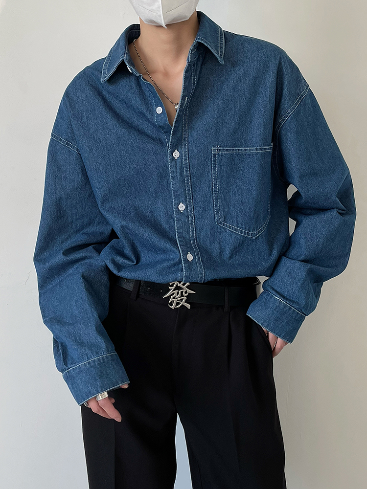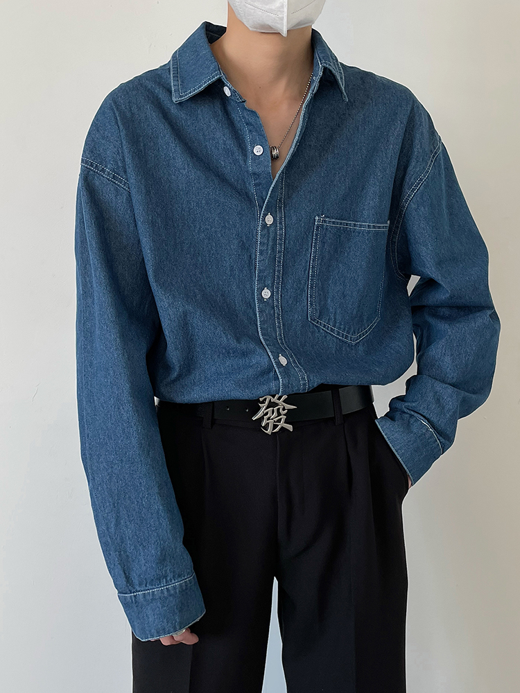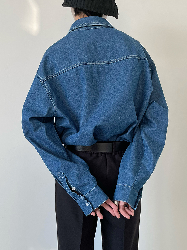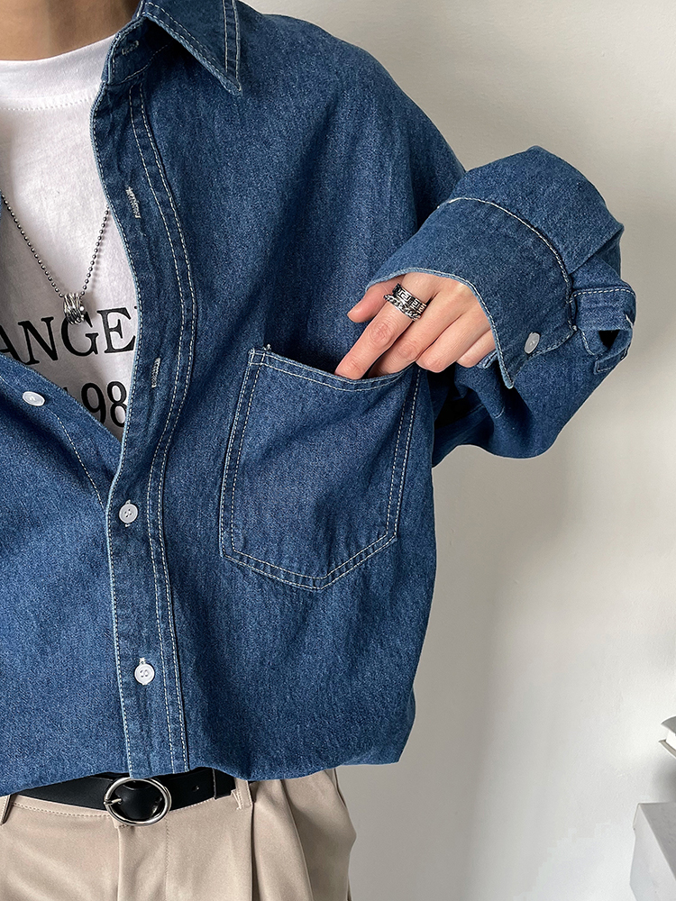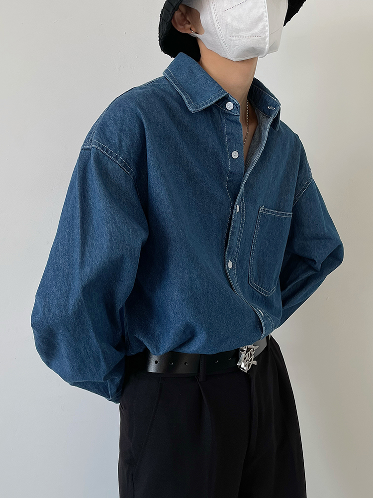 SF/春季新品韩风气质复古蓝色牛仔衬衫男士宽松版水洗工装风外套