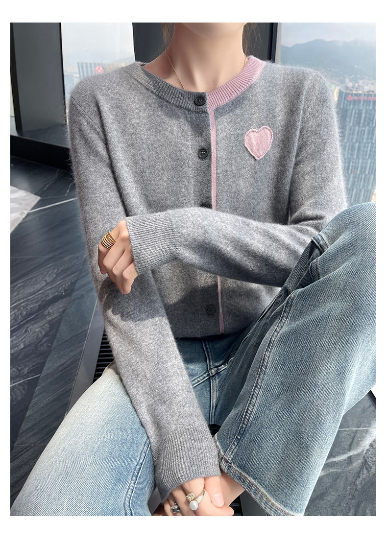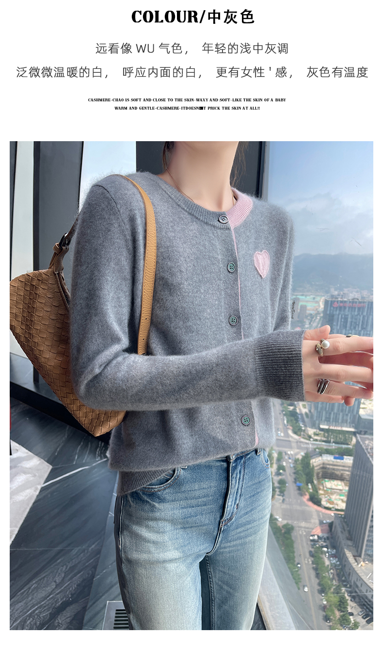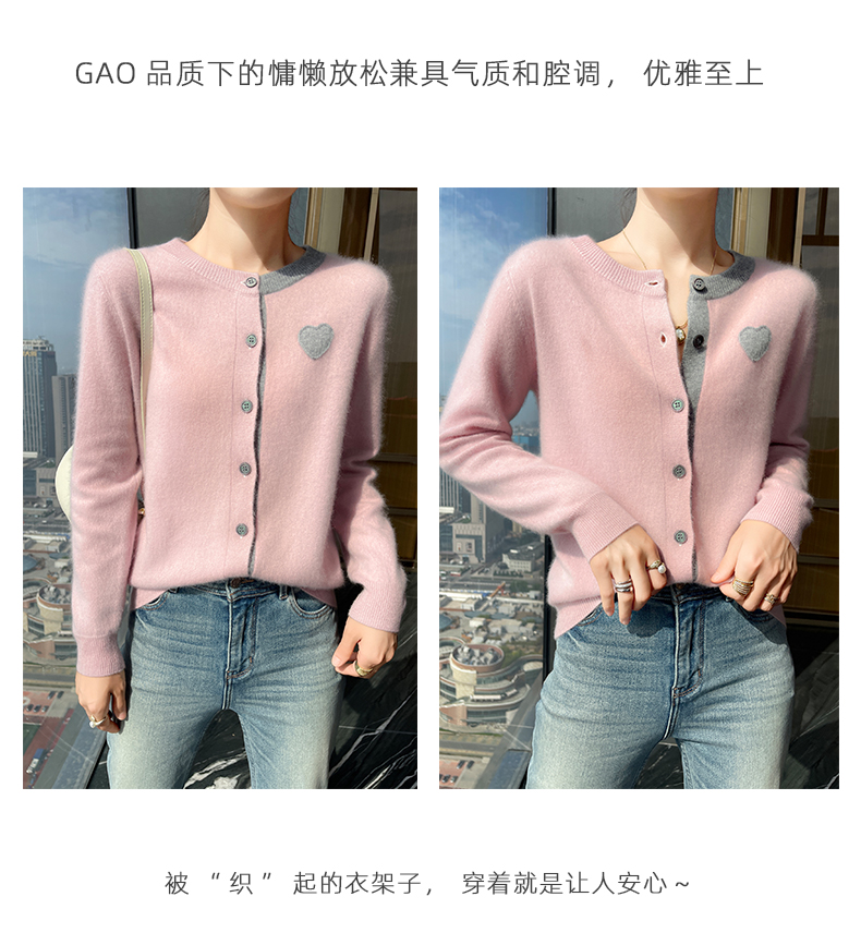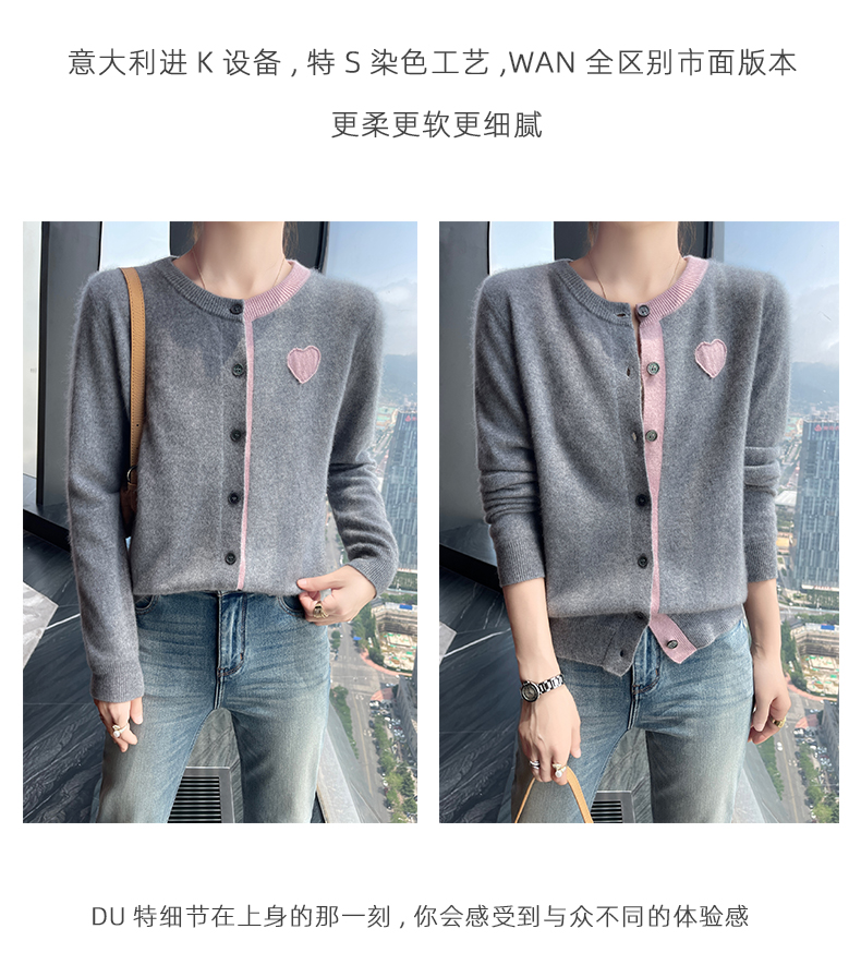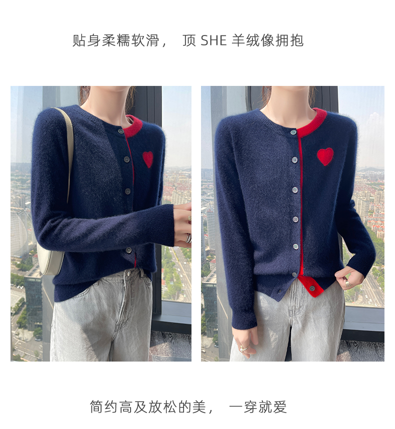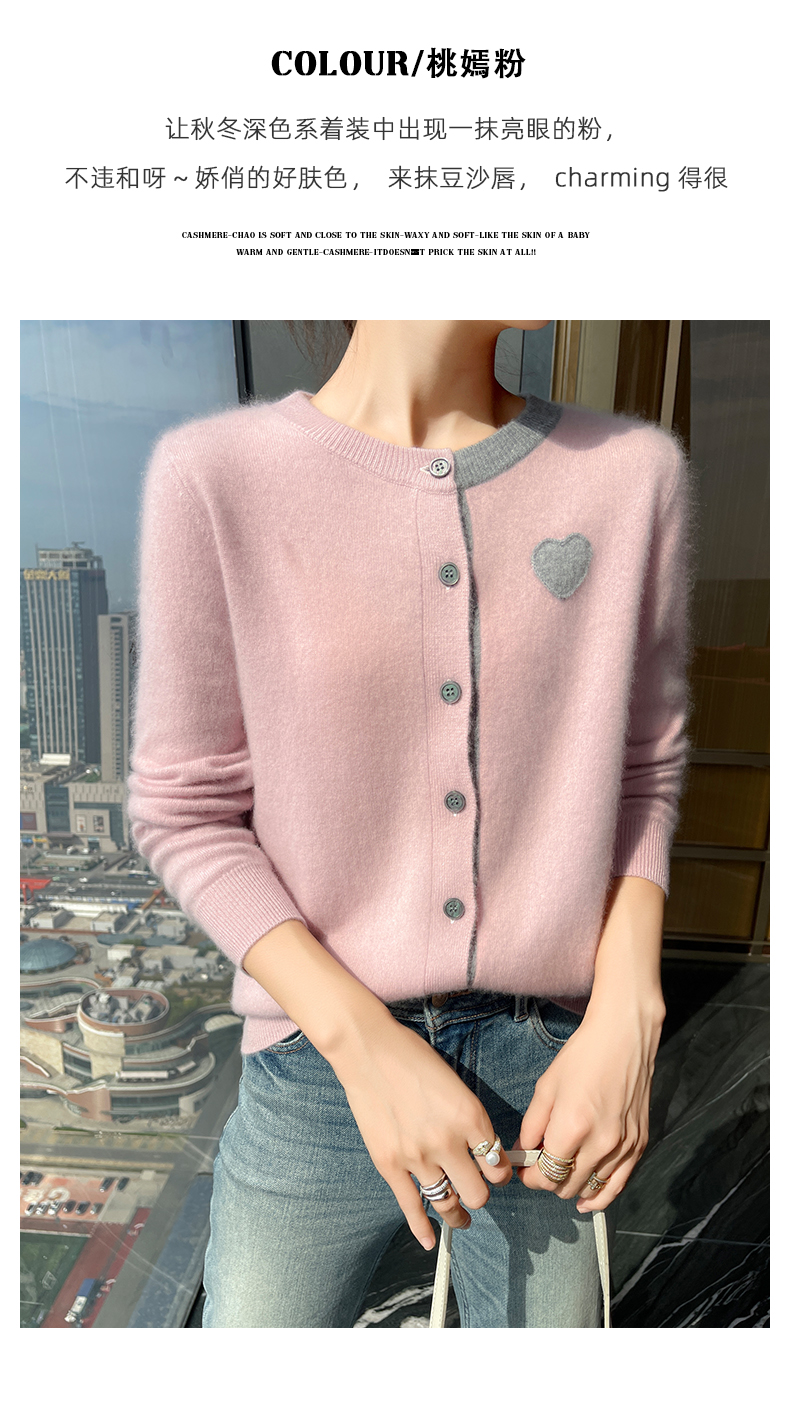高级感山羊绒开衫女圆领甜美爱心拼色外套宽松羊毛衫上衣慵懒外搭