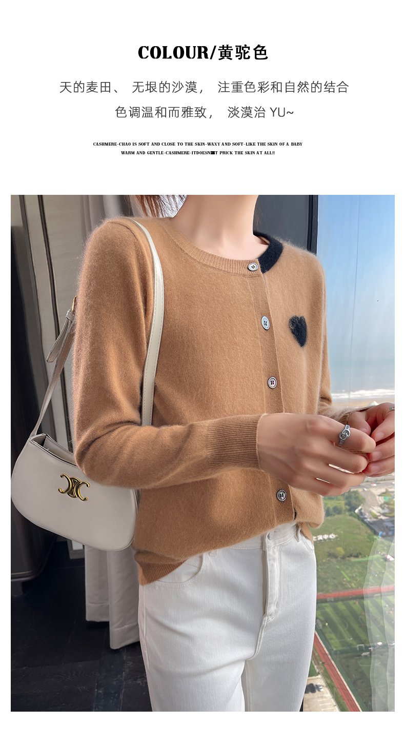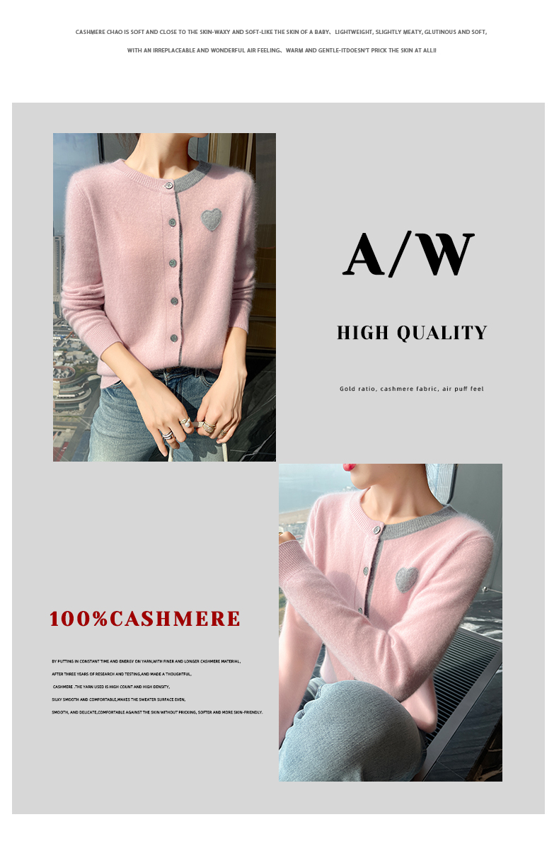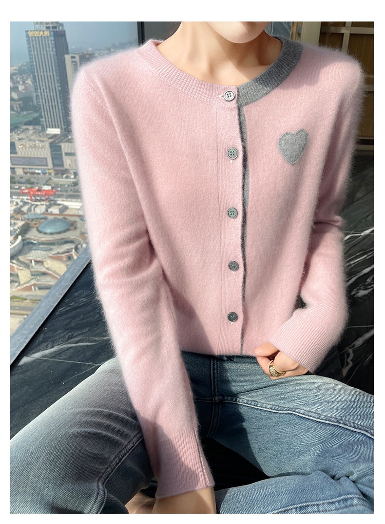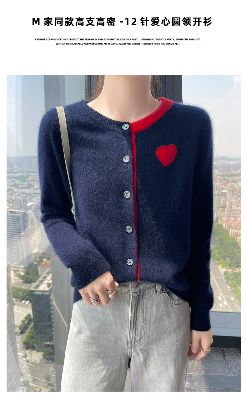 高级感山羊绒开衫女圆领甜美爱心拼色外套宽松羊毛衫上衣慵懒外搭