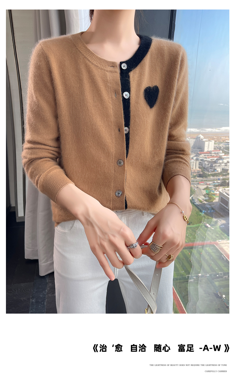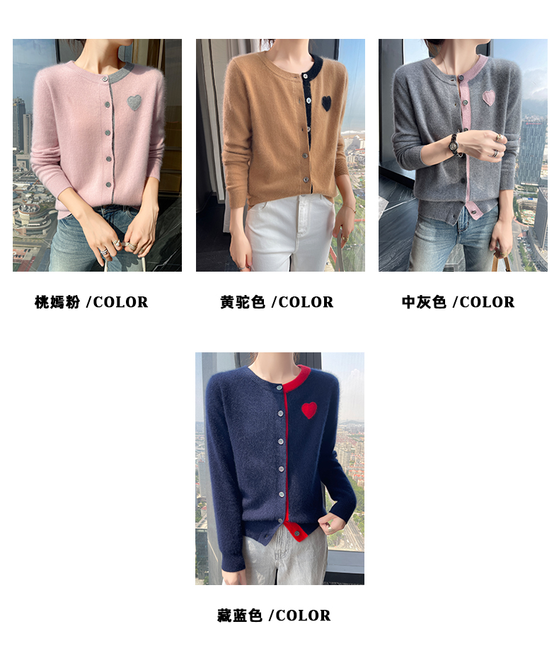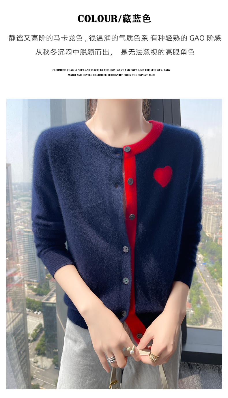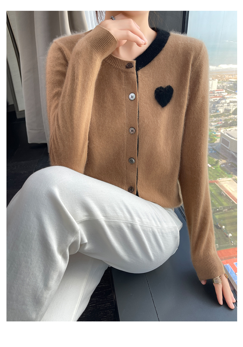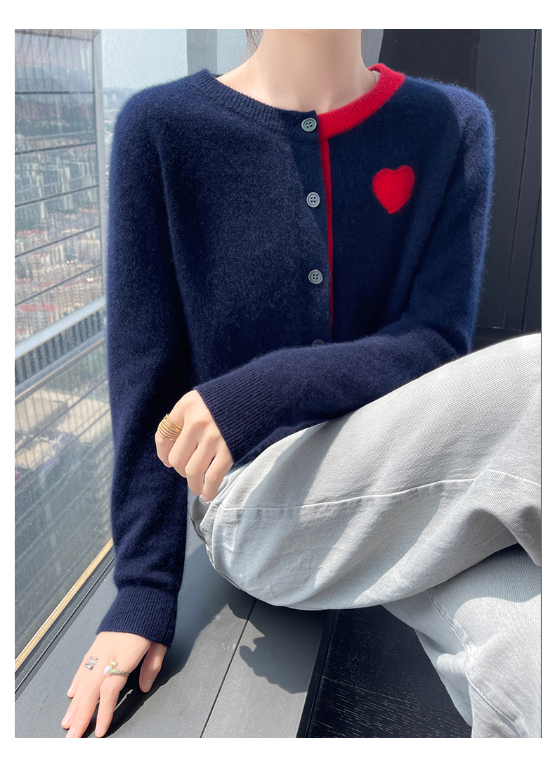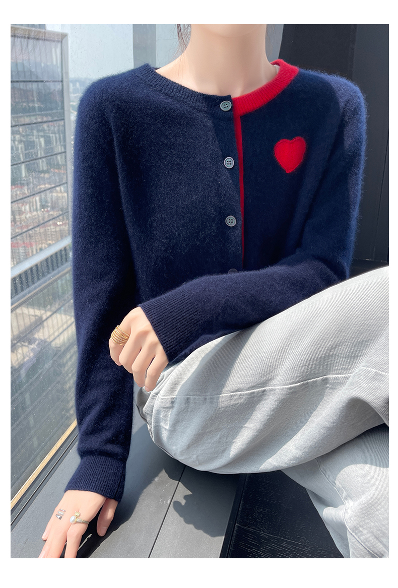 高级感山羊绒开衫女圆领甜美爱心拼色外套宽松羊毛衫上衣慵懒外搭