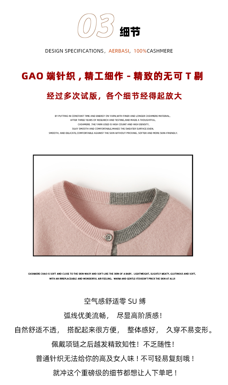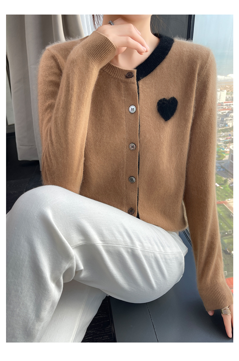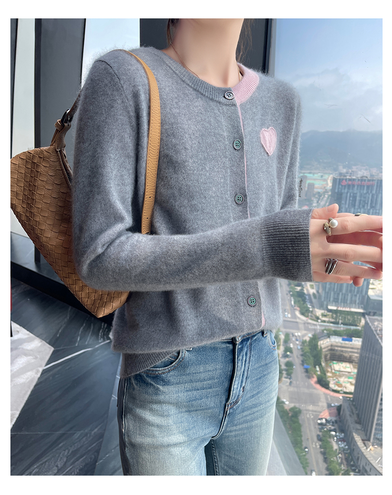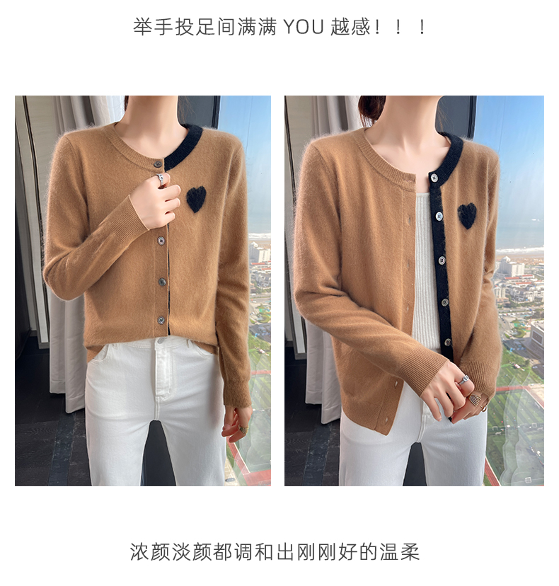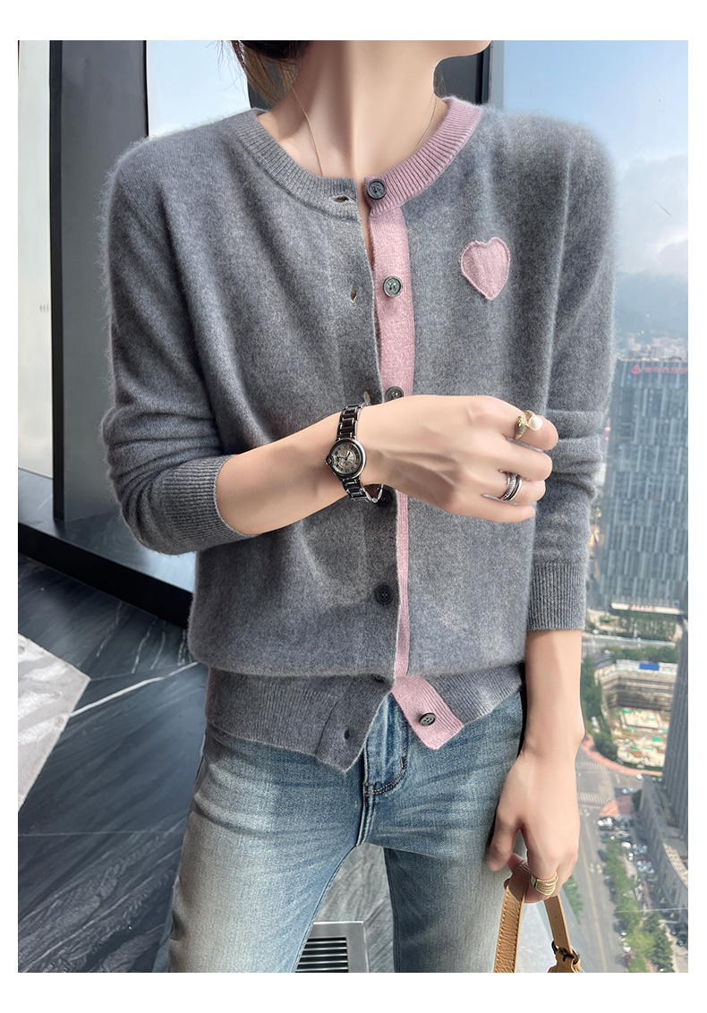 高级感山羊绒开衫女圆领甜美爱心拼色外套宽松羊毛衫上衣慵懒外搭