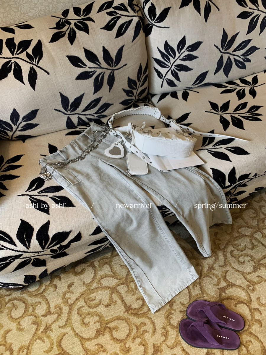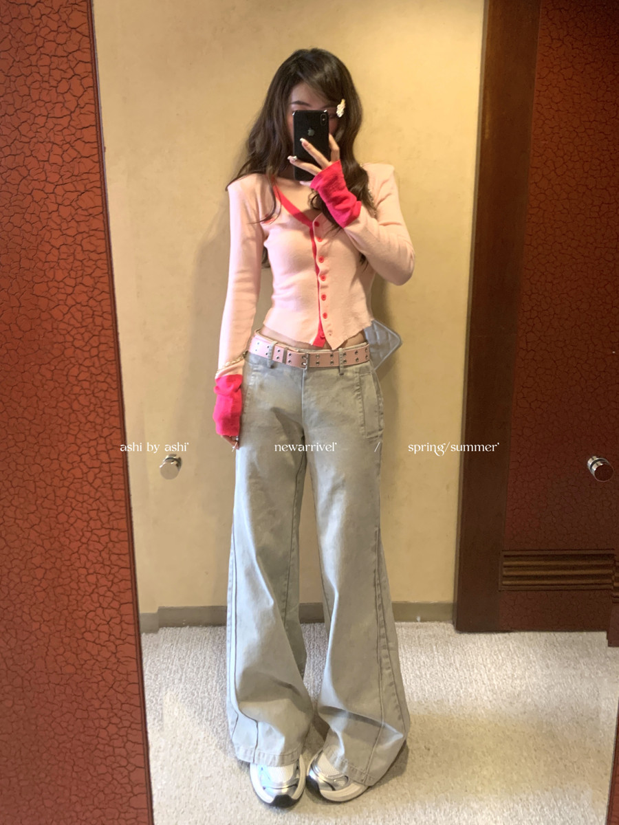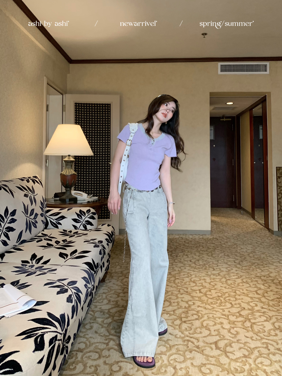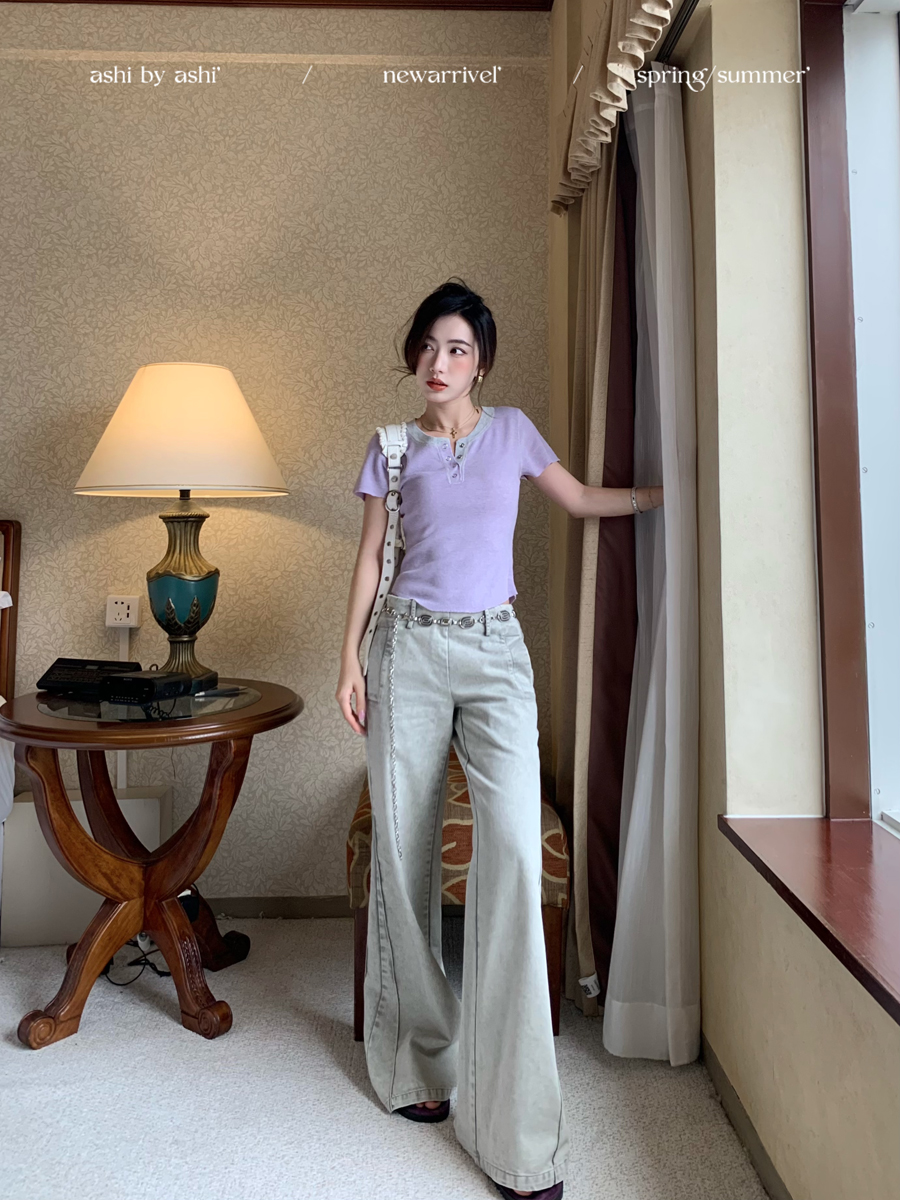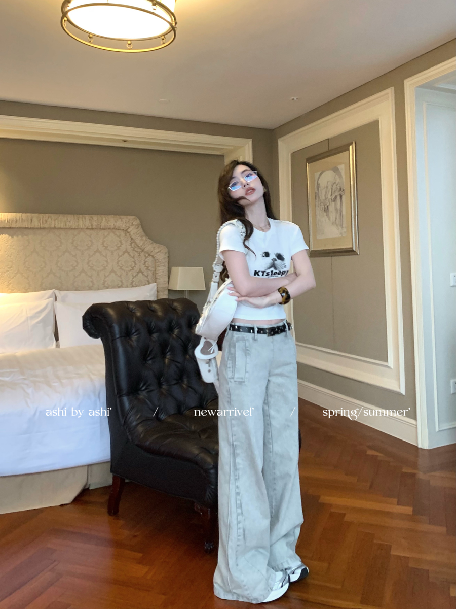 大于诗集 all in好搭 沙色复古水洗牛仔裤女拉链微喇宽松阔腿裤夏