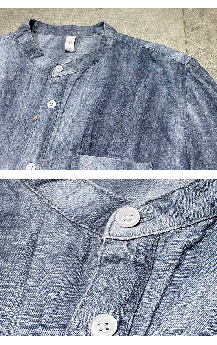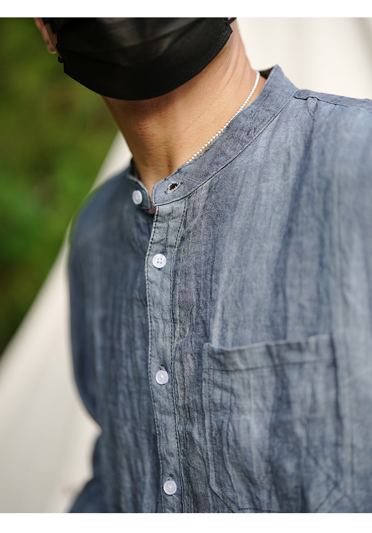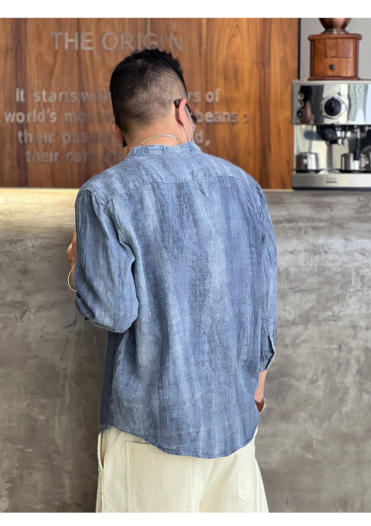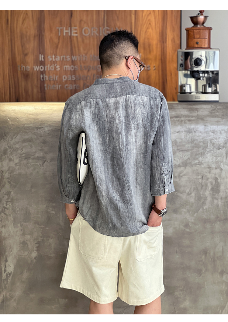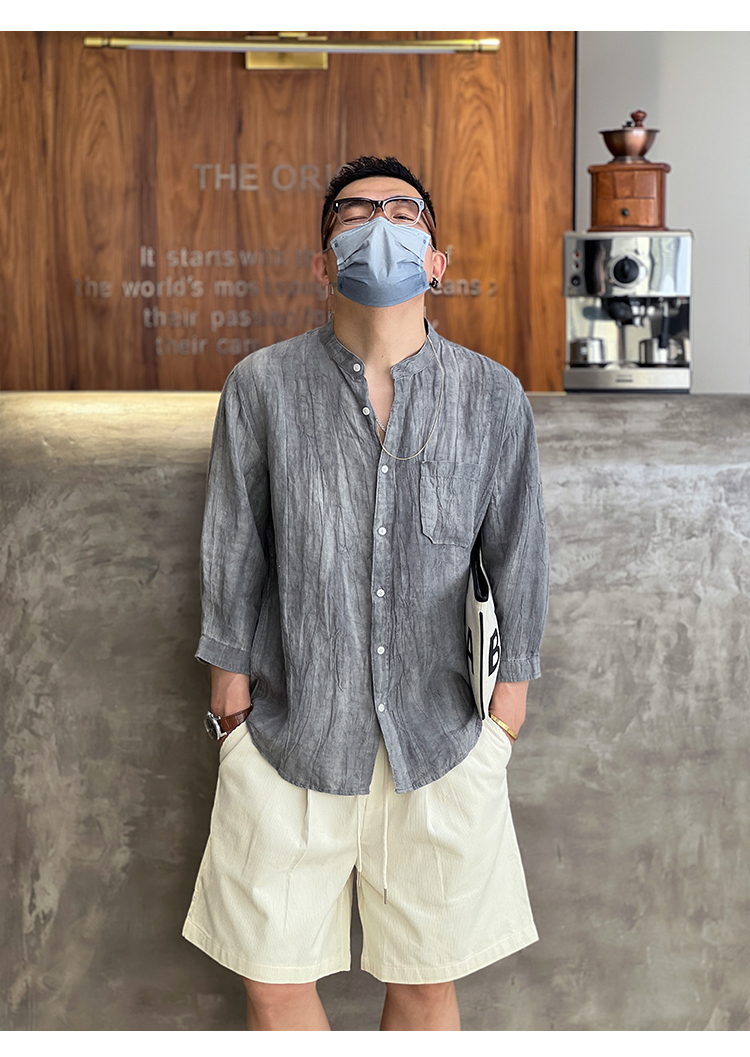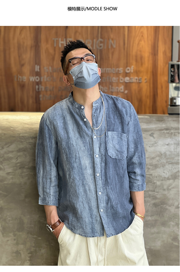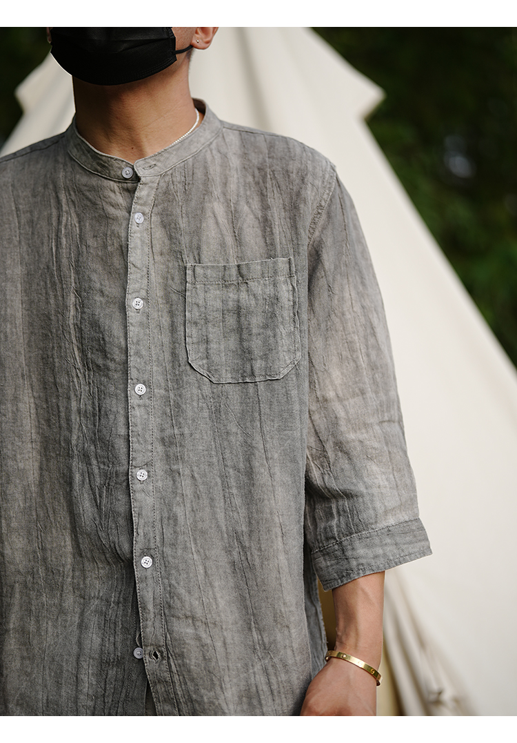 港风夏季简约亚麻衬衣男日系复古扎染立领痞帅炸街七分袖休闲衬衫