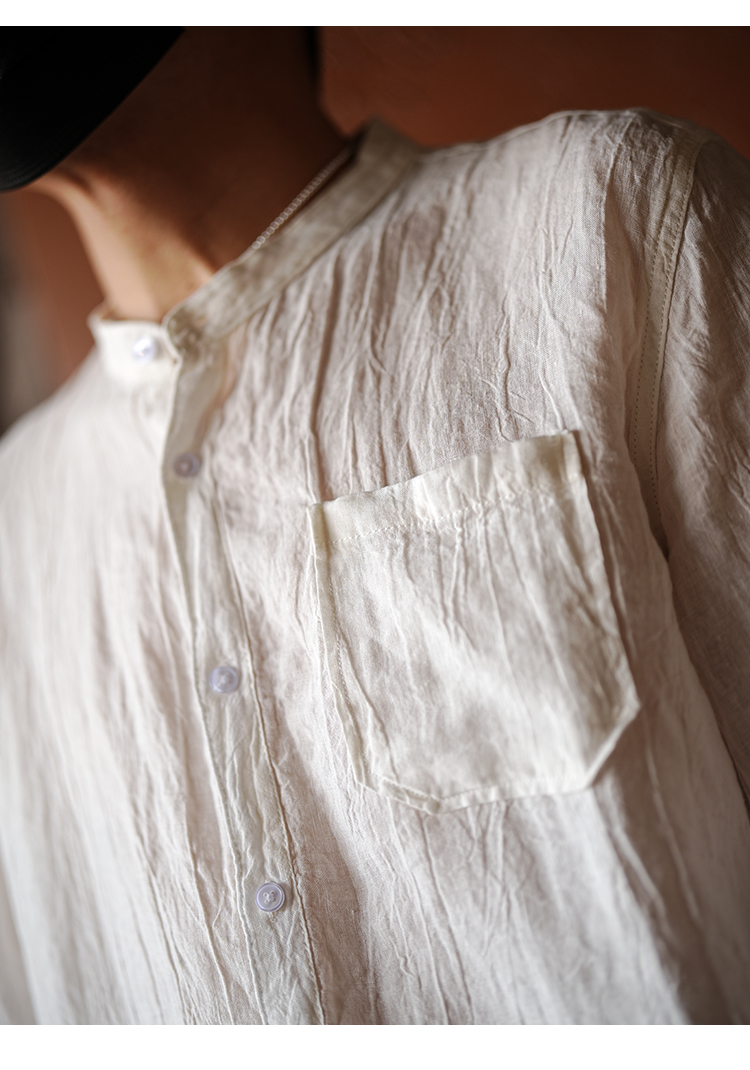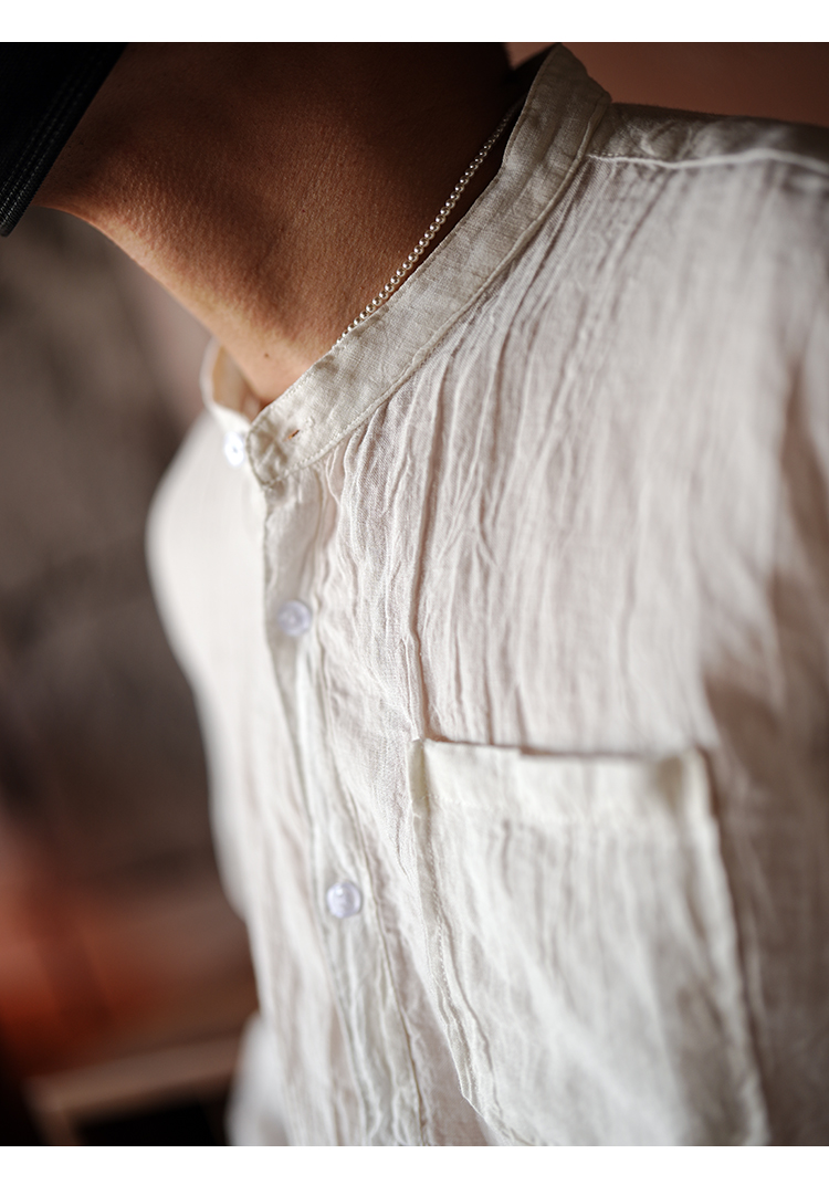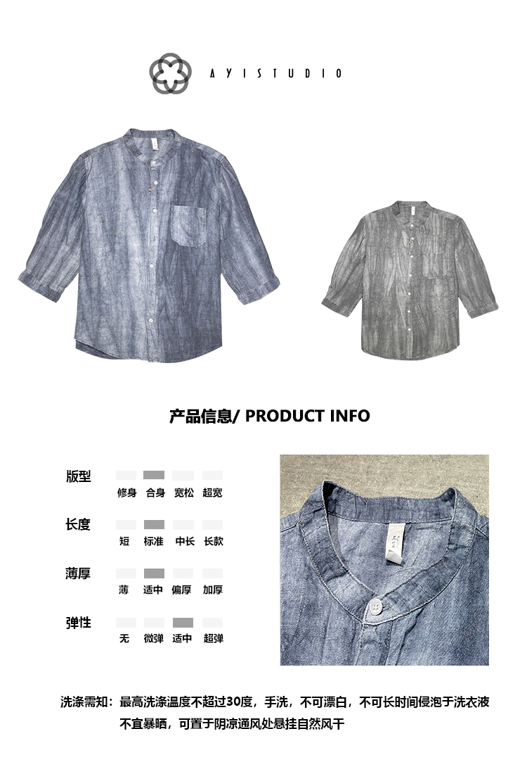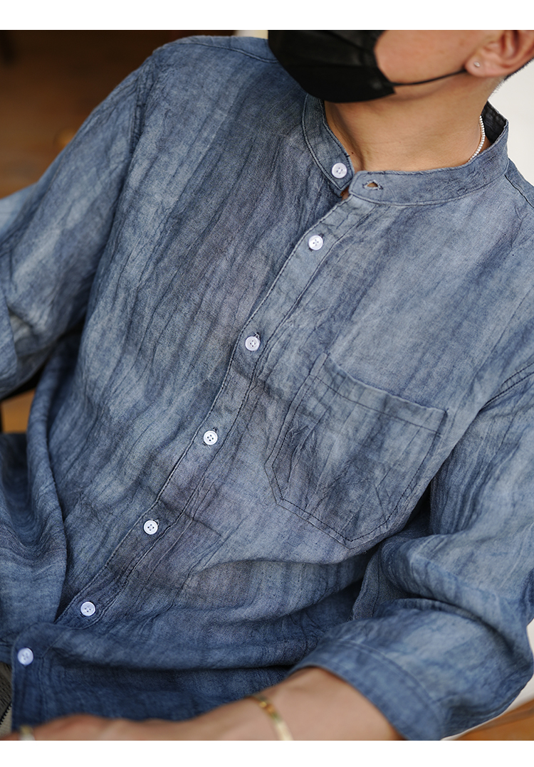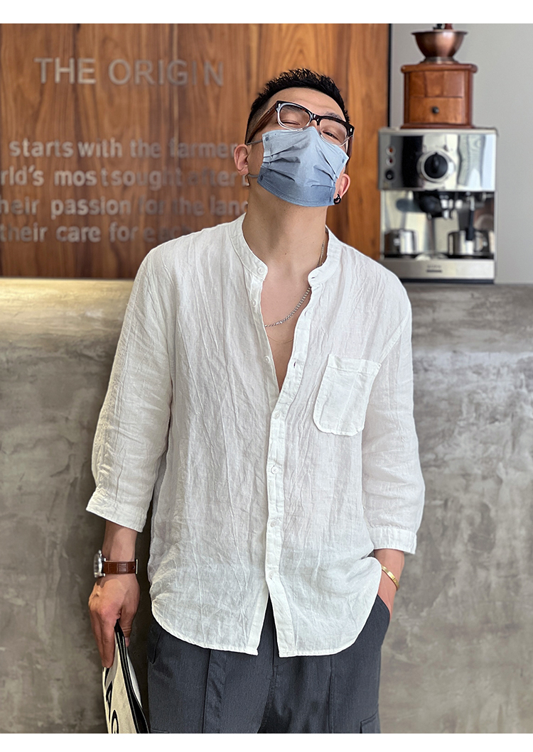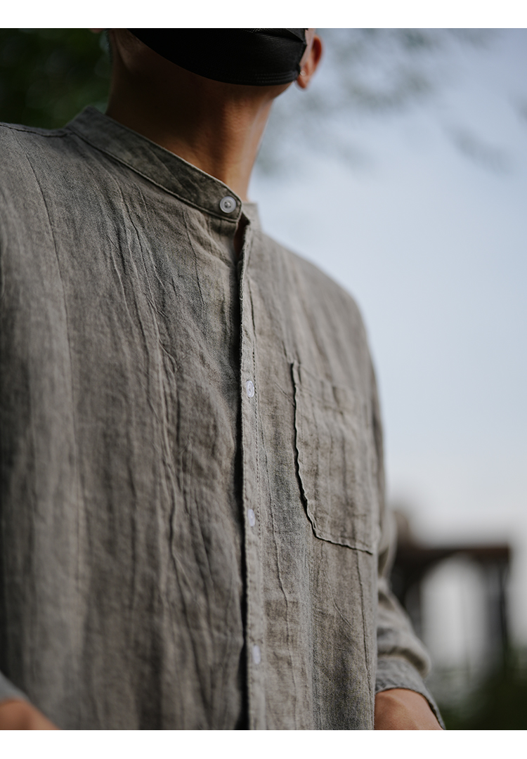 港风夏季简约亚麻衬衣男日系复古扎染立领痞帅炸街七分袖休闲衬衫