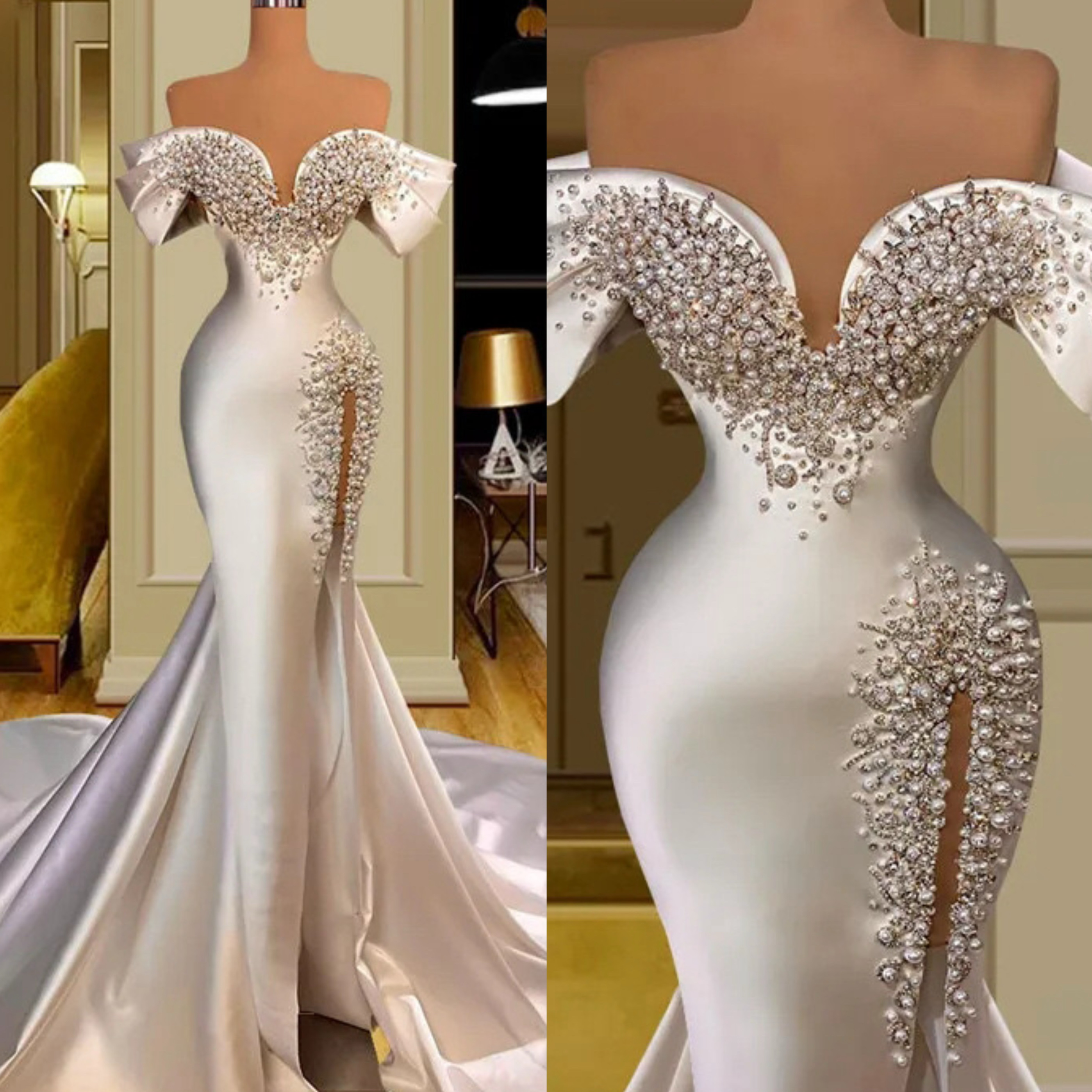 高定一字落肩肩晚礼服收腰显瘦鱼尾礼服速卖通新款拖尾结婚礼