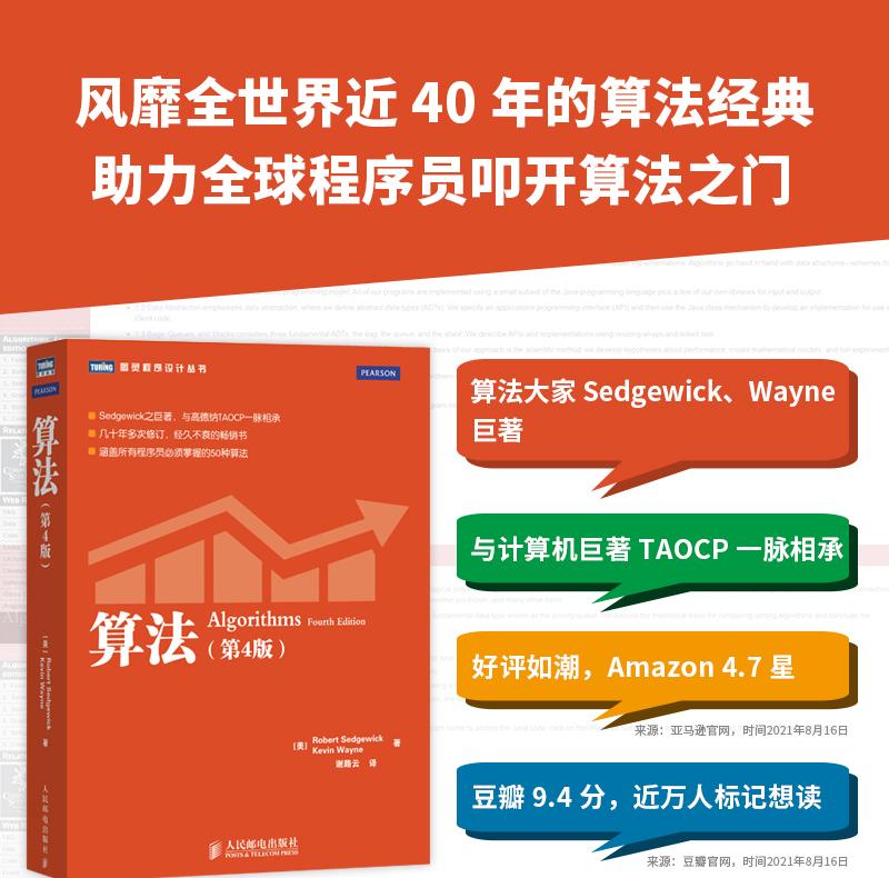 当当网 算法(第4四版) 计算机程序设计编程算法导论基础书籍 算法与数据结构教程 编程之法 人民邮电出版社 图解算法入门正版书籍