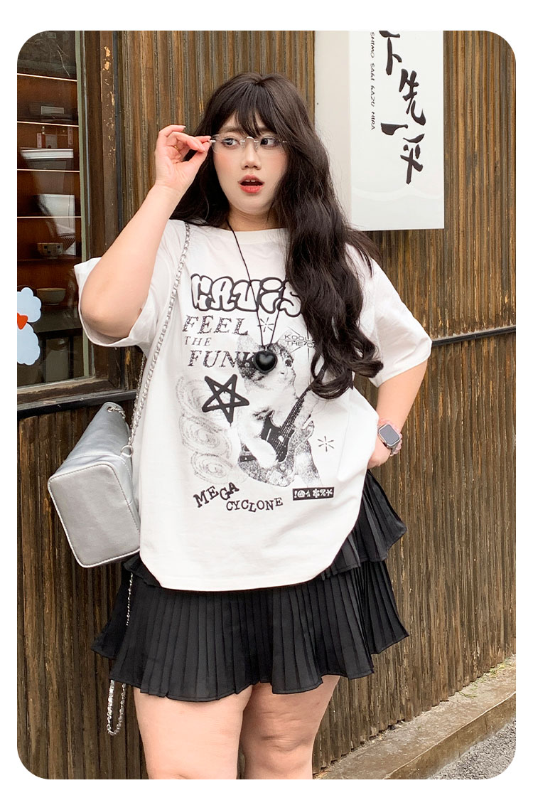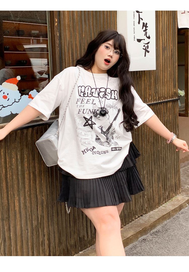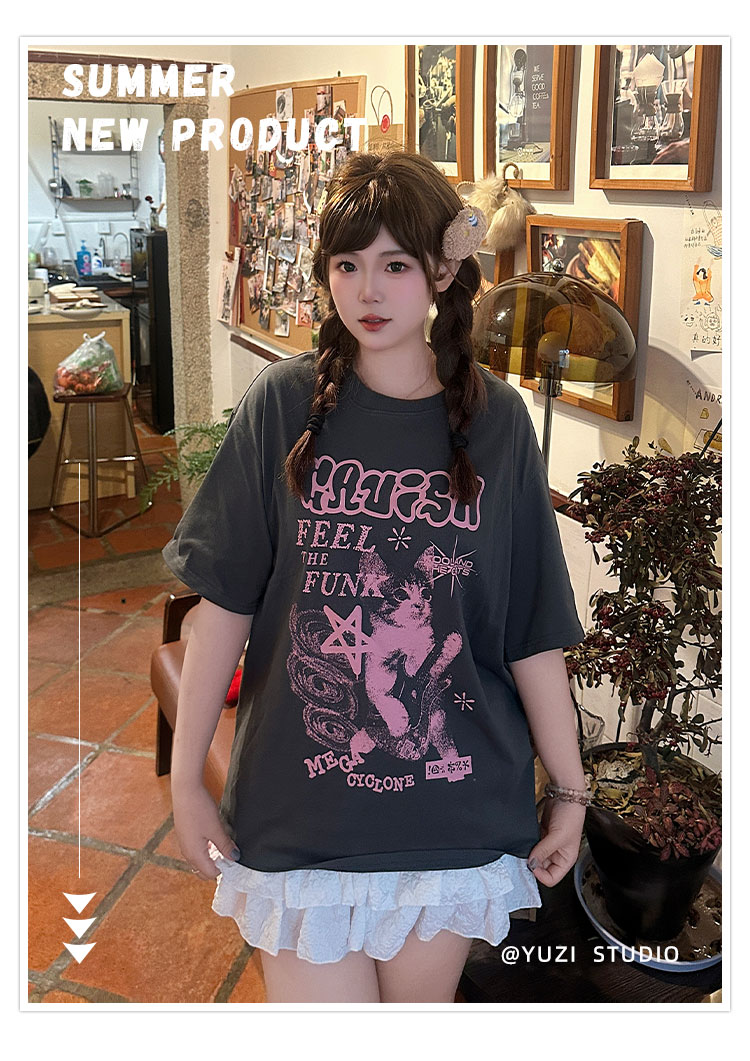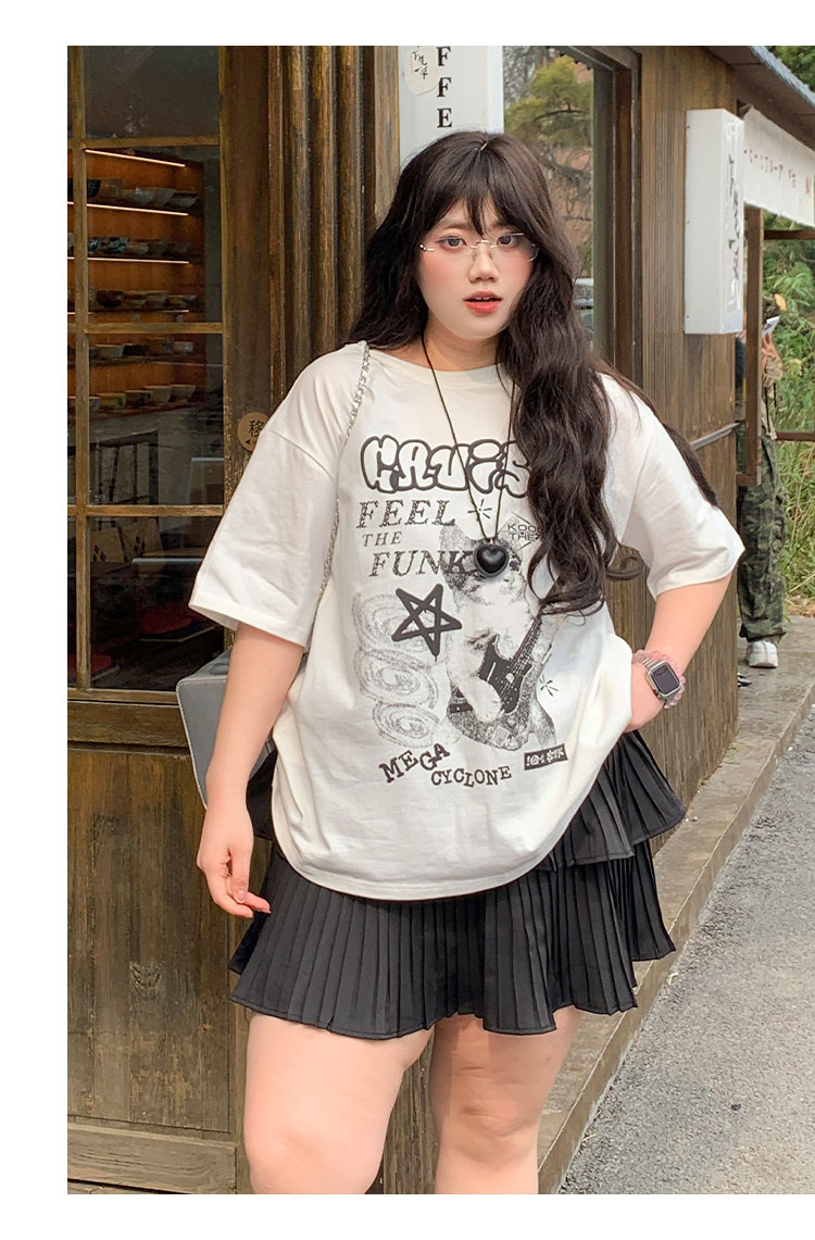YUZI鱼子减龄撞色猫咪T恤大码女装微胖mm显瘦遮肉200斤重磅纯棉