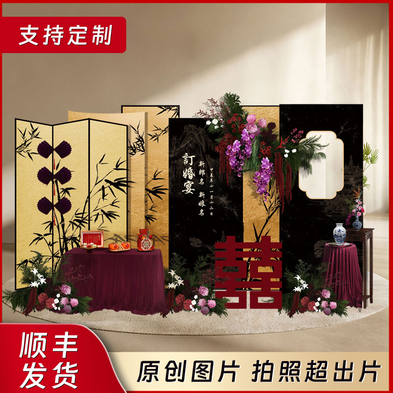 2025新中式小众高级感花艺订婚装饰布置摆件全套答谢宴背景墙kt板